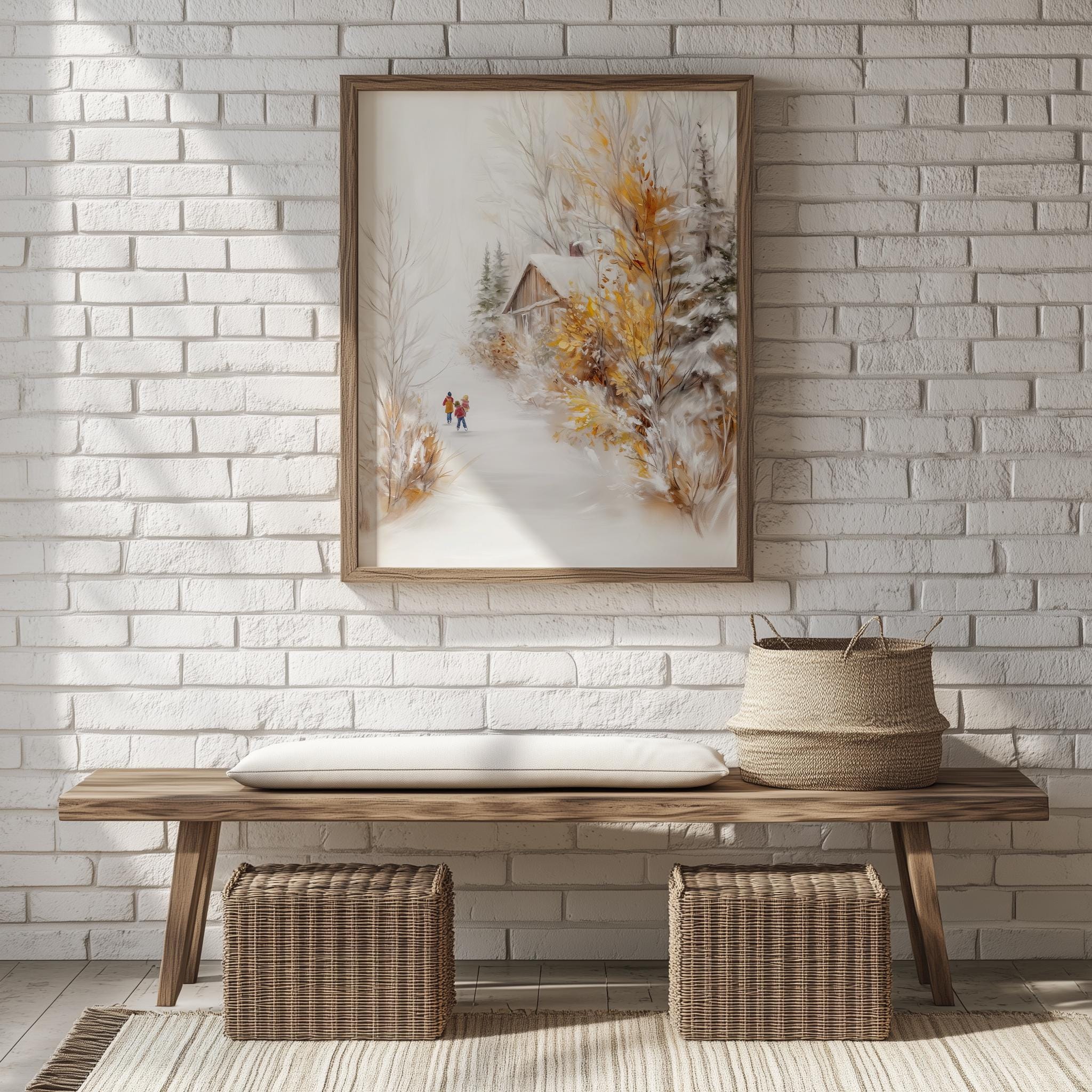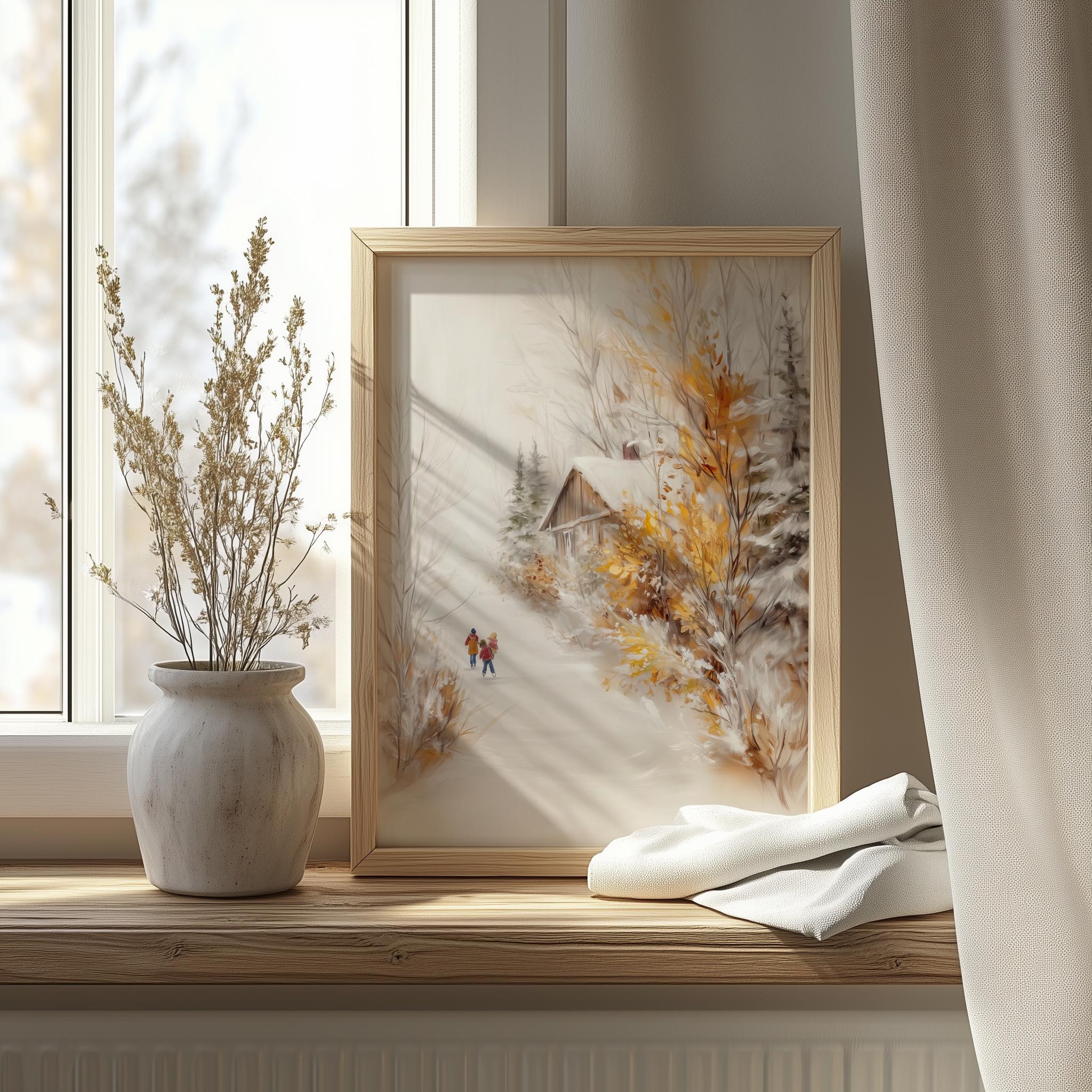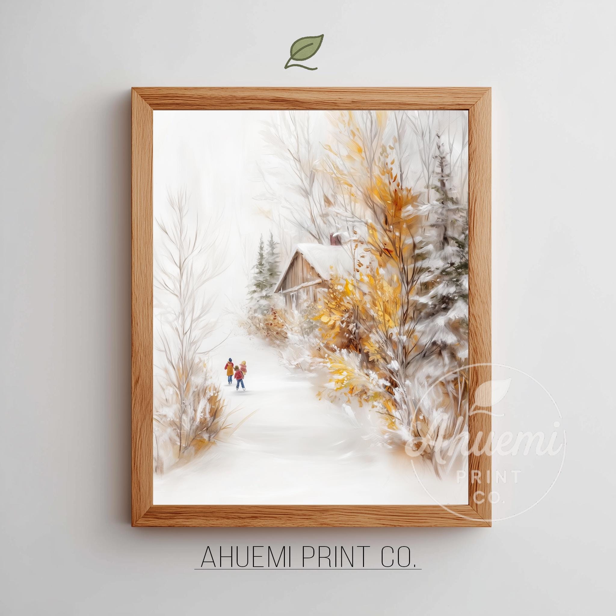 Immerse yourself in the charm of this rustic painting of a serene winter landscape featuring a cozy cabin nestled in the snow, with a charming path for children. An instantly downloadable print, it's perfect for elevating your decor with budget-friendly charm. This gives you the flexibility to customize the size, frame, and material according to your personal taste and space, ensuring a perfect fit for your walls.