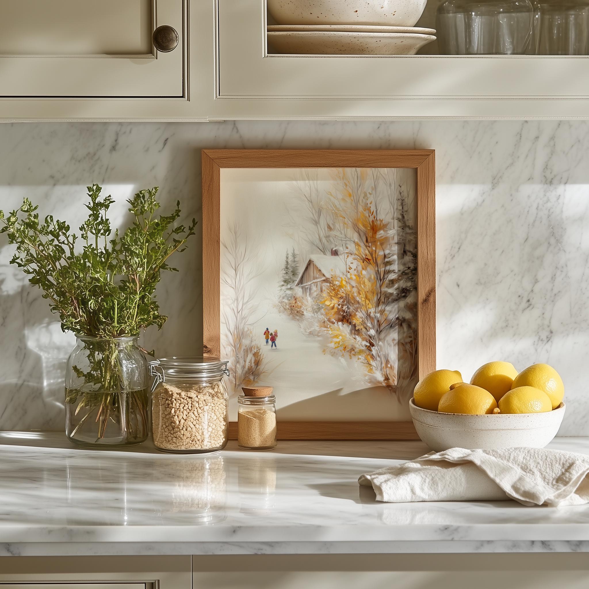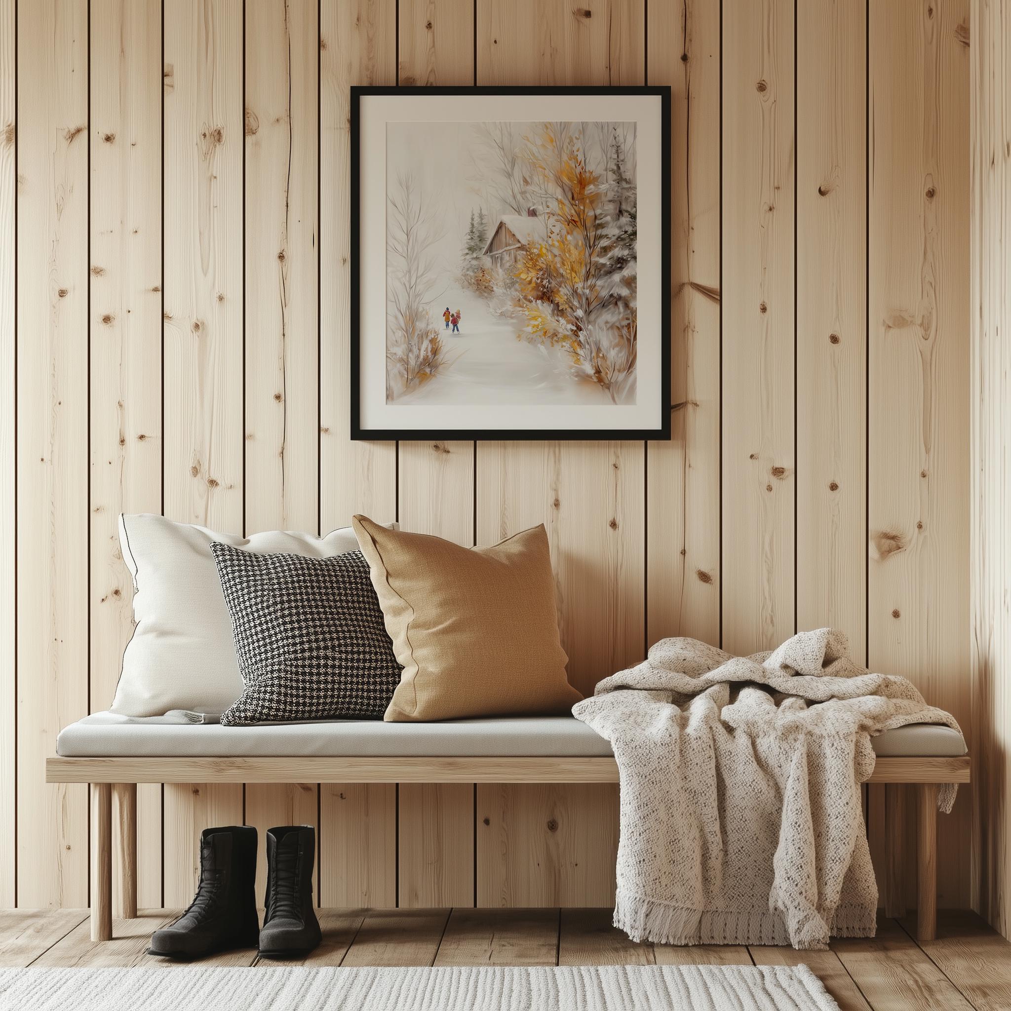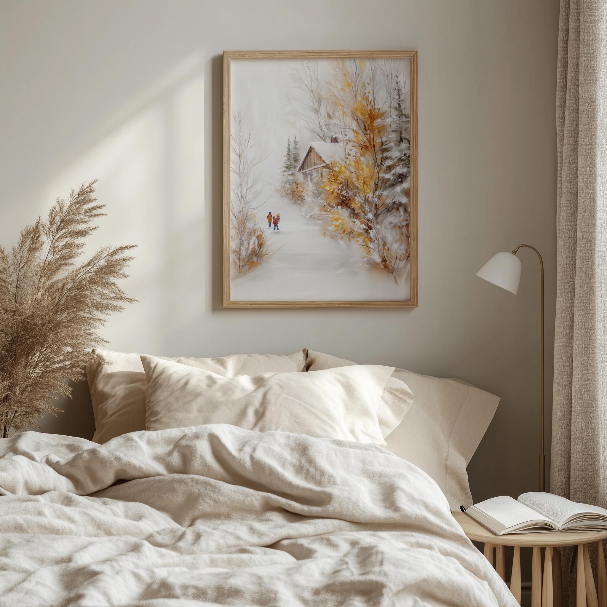 Immerse yourself in the charm of this rustic painting of a serene winter landscape featuring a cozy cabin nestled in the snow, with a charming path for children. An instantly downloadable print, it's perfect for elevating your decor with budget-friendly charm. This gives you the flexibility to customize the size, frame, and material according to your personal taste and space, ensuring a perfect fit for your walls.
