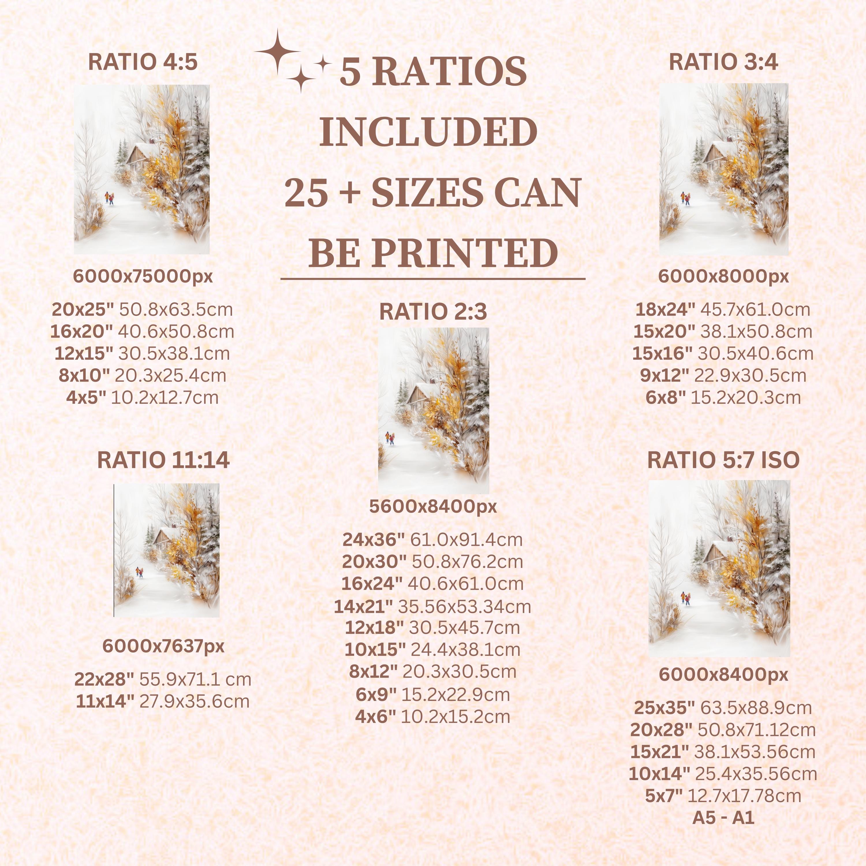 Each artwork includes 5 aspect ratios with 25+ print sizes. Most standard frames are covered. One custom resize per purchase available—message before ordering.