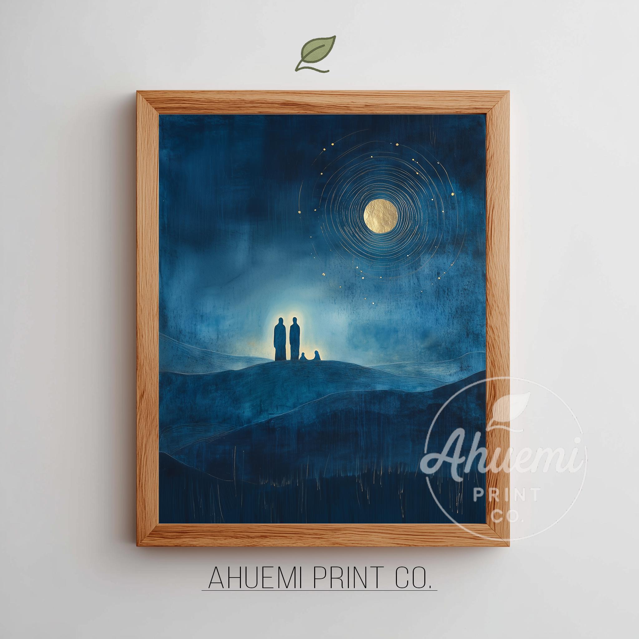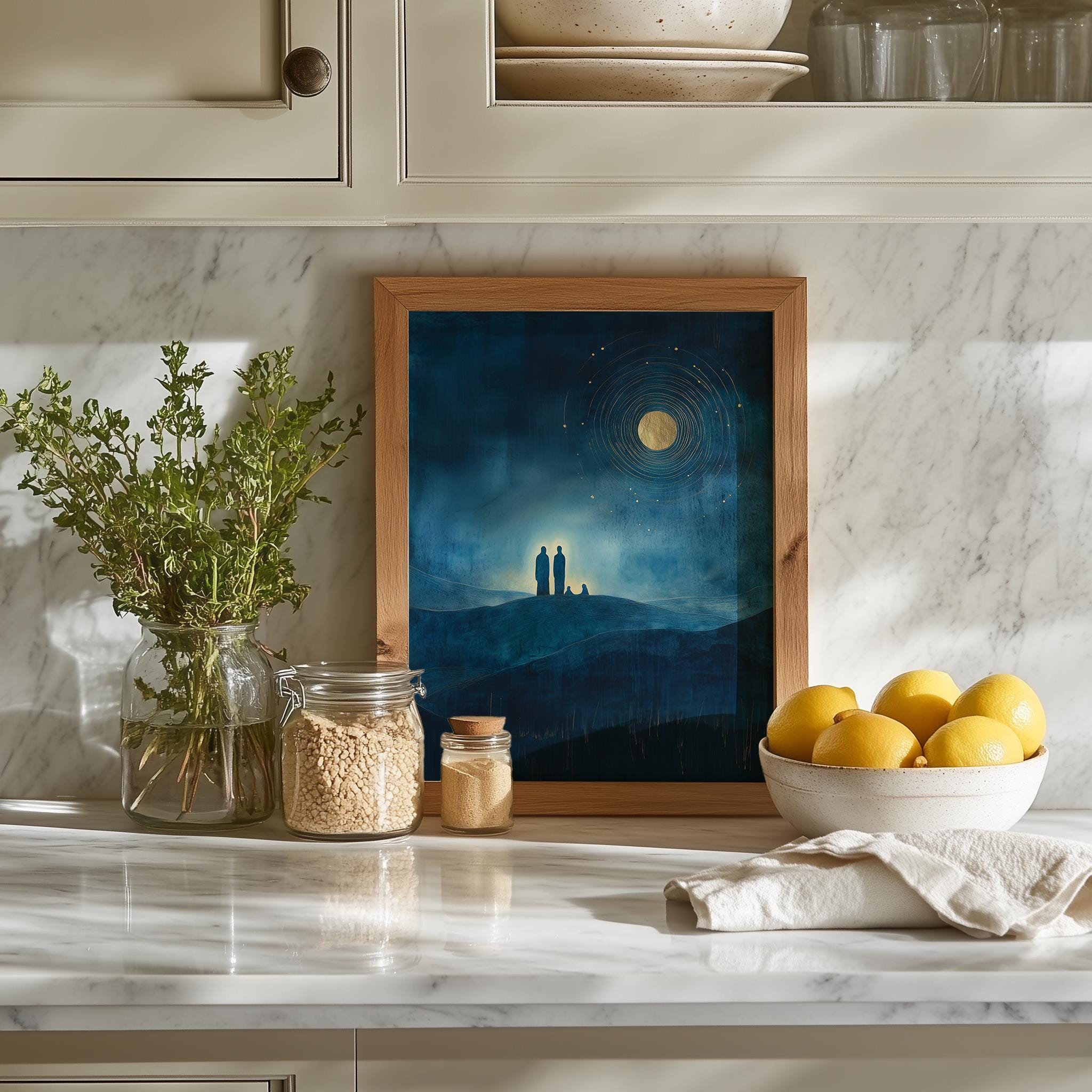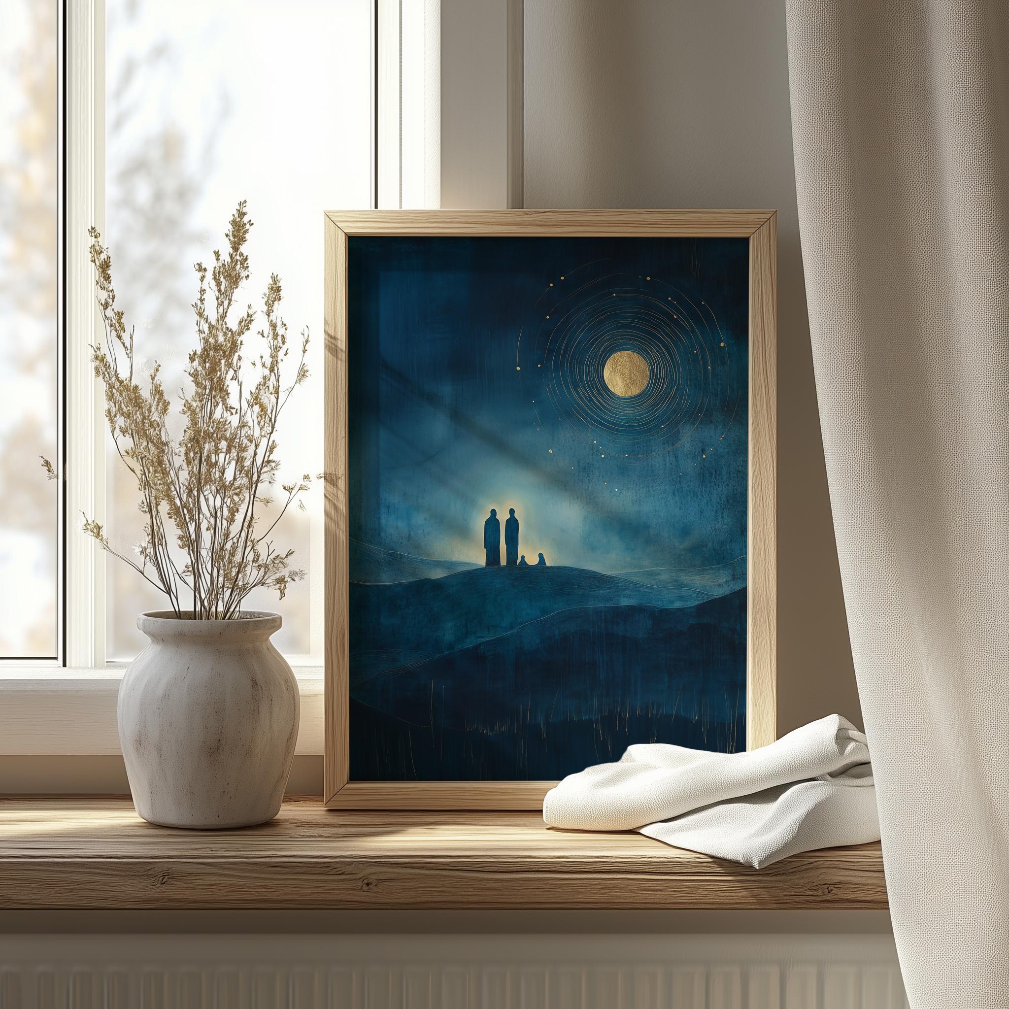 Immerse yourself in the charm of this rustic painting of a serene nativity scene, beautifully captured in minimalist silhouette. An instantly downloadable print, it's perfect for elevating your decor with budget-friendly charm. This gives you the flexibility to customize the size, frame, and material according to your personal taste and space, ensuring a perfect fit for your walls.