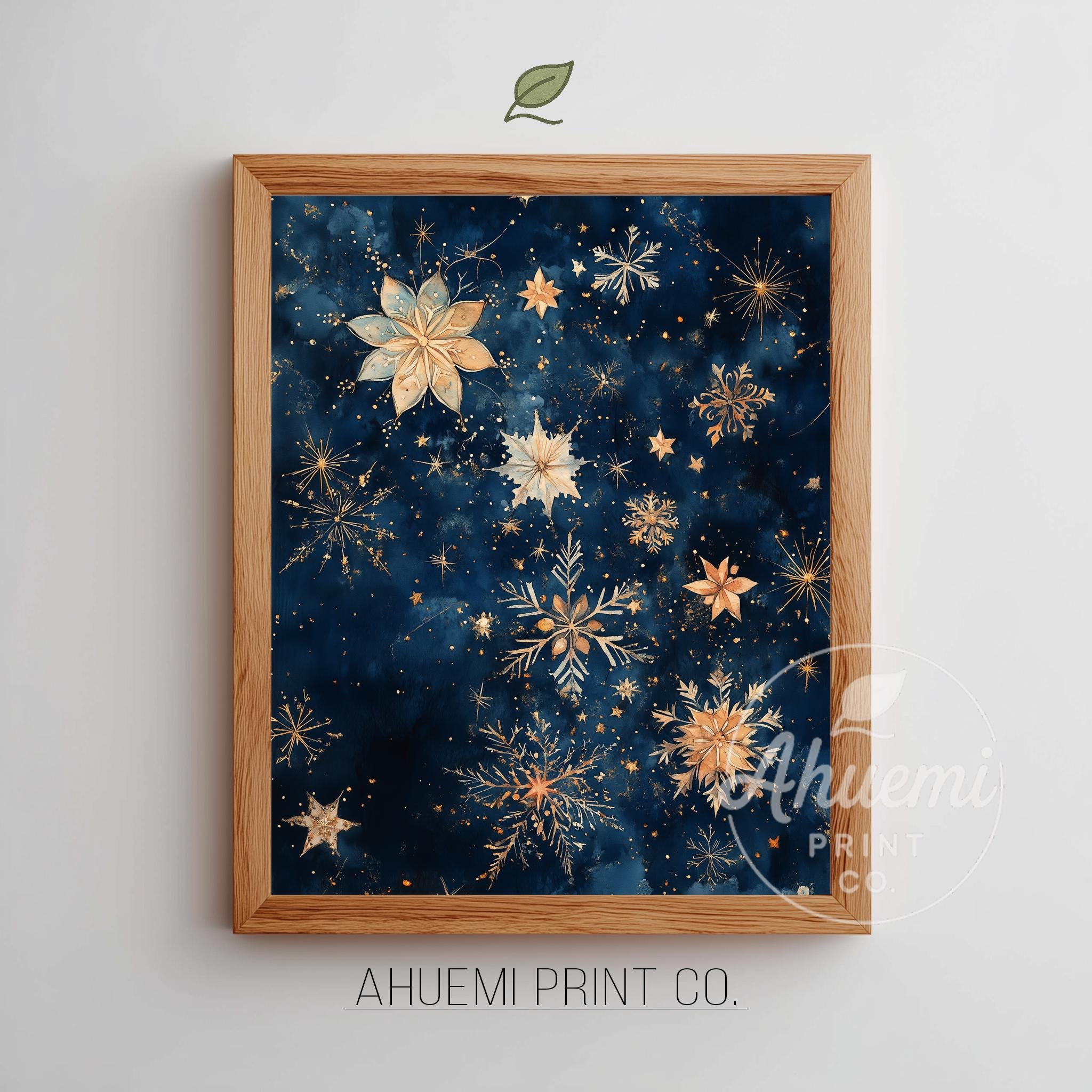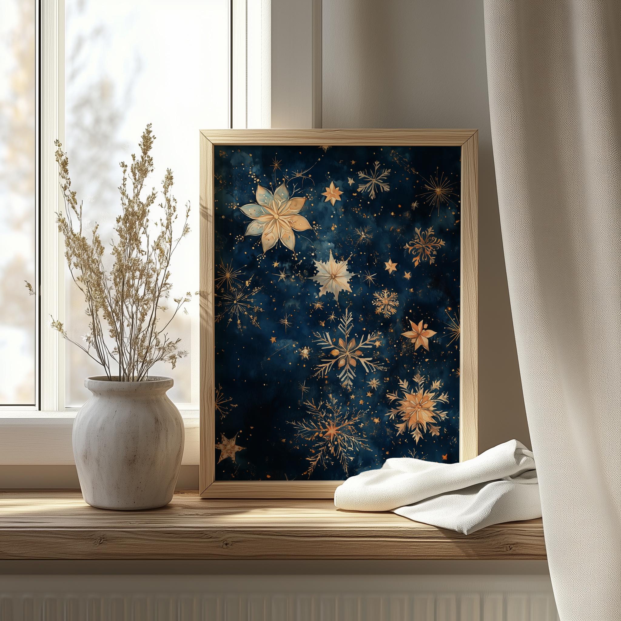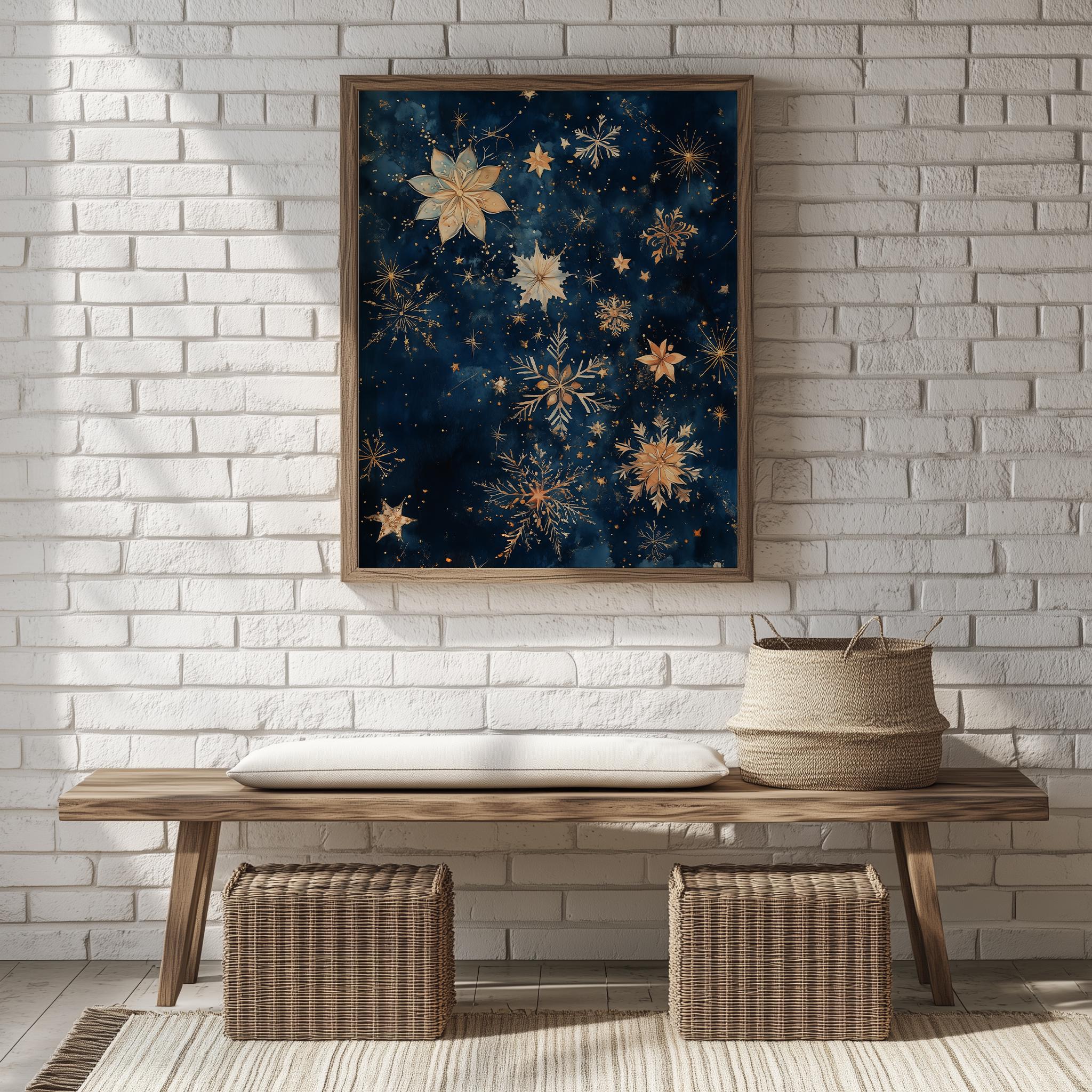 Immerse yourself in the charm of this rustic painting of a serene winter night sky filled with delicate watercolor stars and shimmering snowflakes. An instantly downloadable print, it's perfect for elevating your decor with budget-friendly charm. This gives you the flexibility to customize the size, frame, and material according to your personal taste and space, ensuring a perfect fit for your walls.