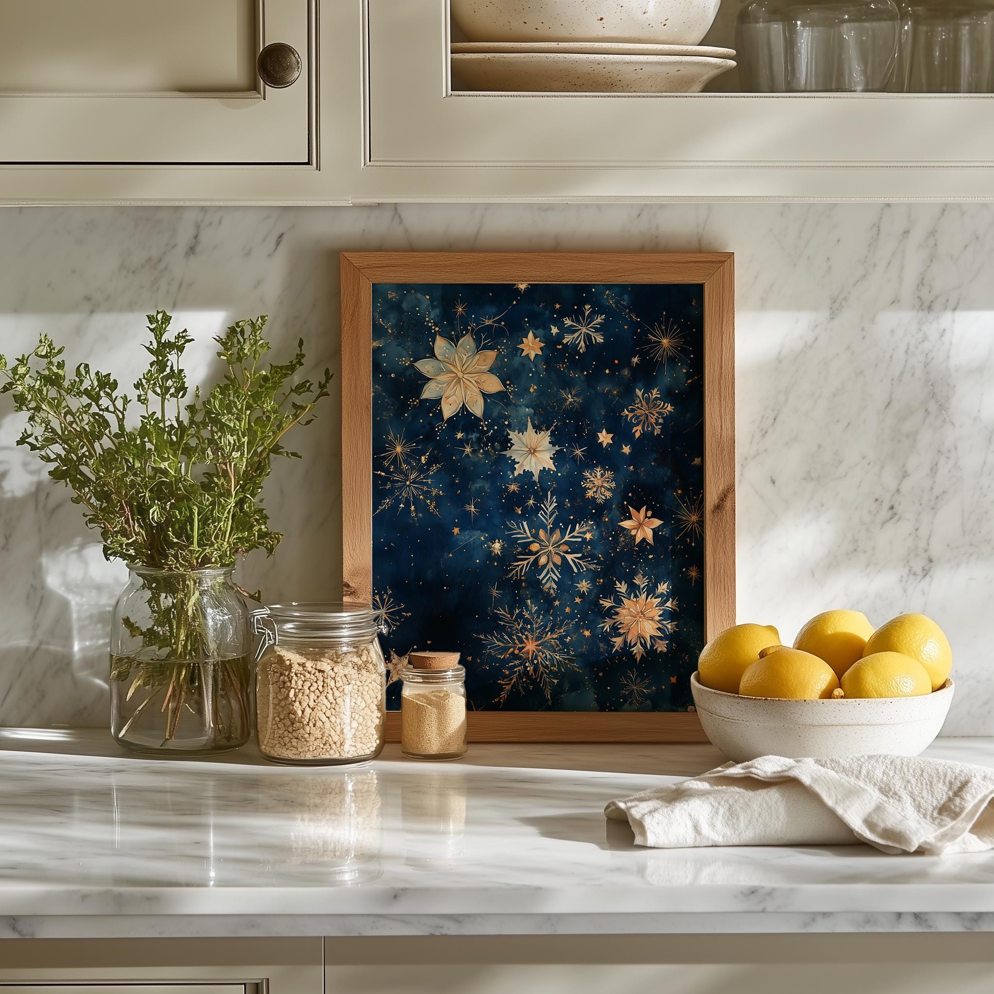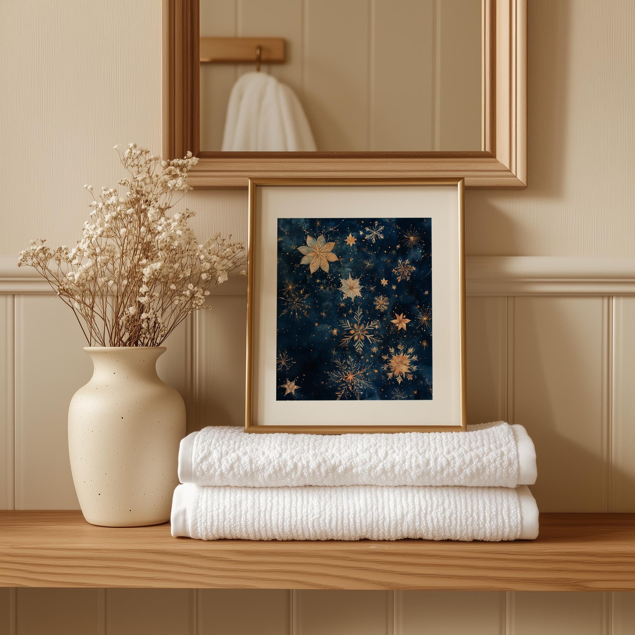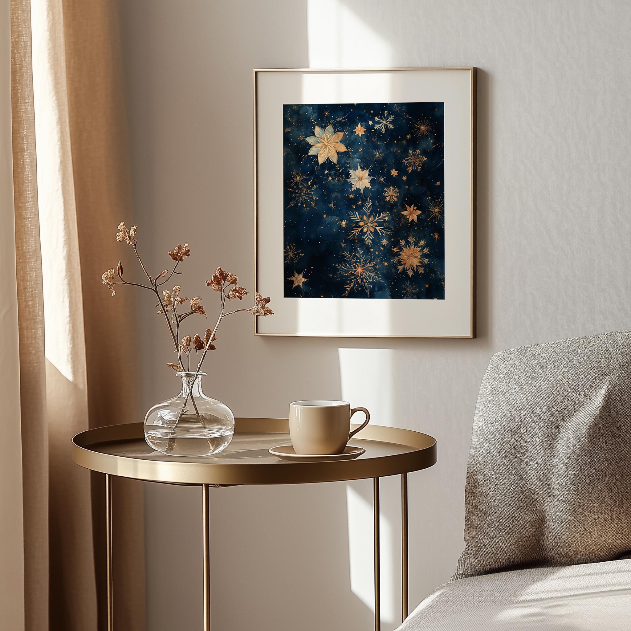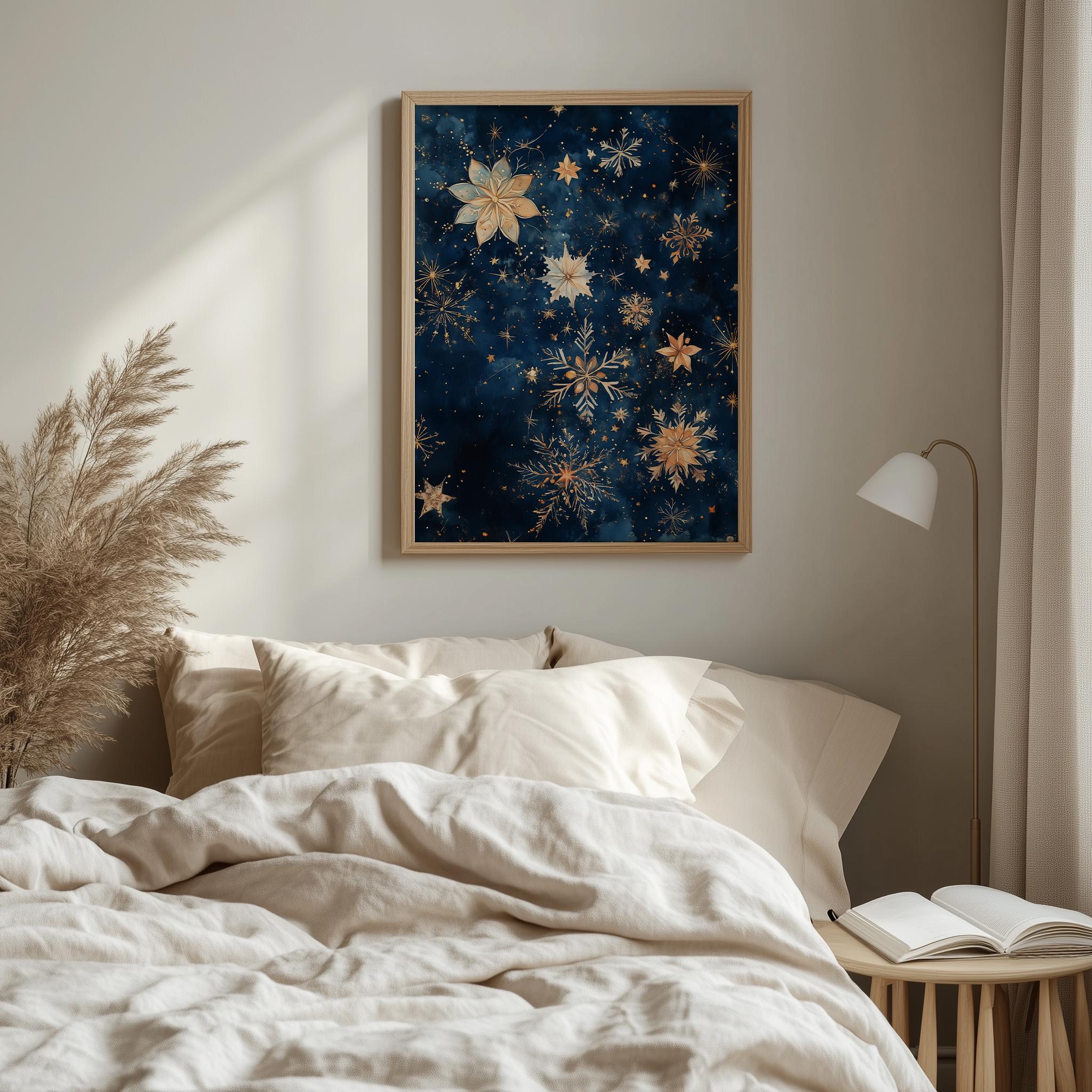 Immerse yourself in the charm of this rustic painting of a serene winter night sky filled with delicate watercolor stars and shimmering snowflakes. An instantly downloadable print, it's perfect for elevating your decor with budget-friendly charm. This gives you the flexibility to customize the size, frame, and material according to your personal taste and space, ensuring a perfect fit for your walls.