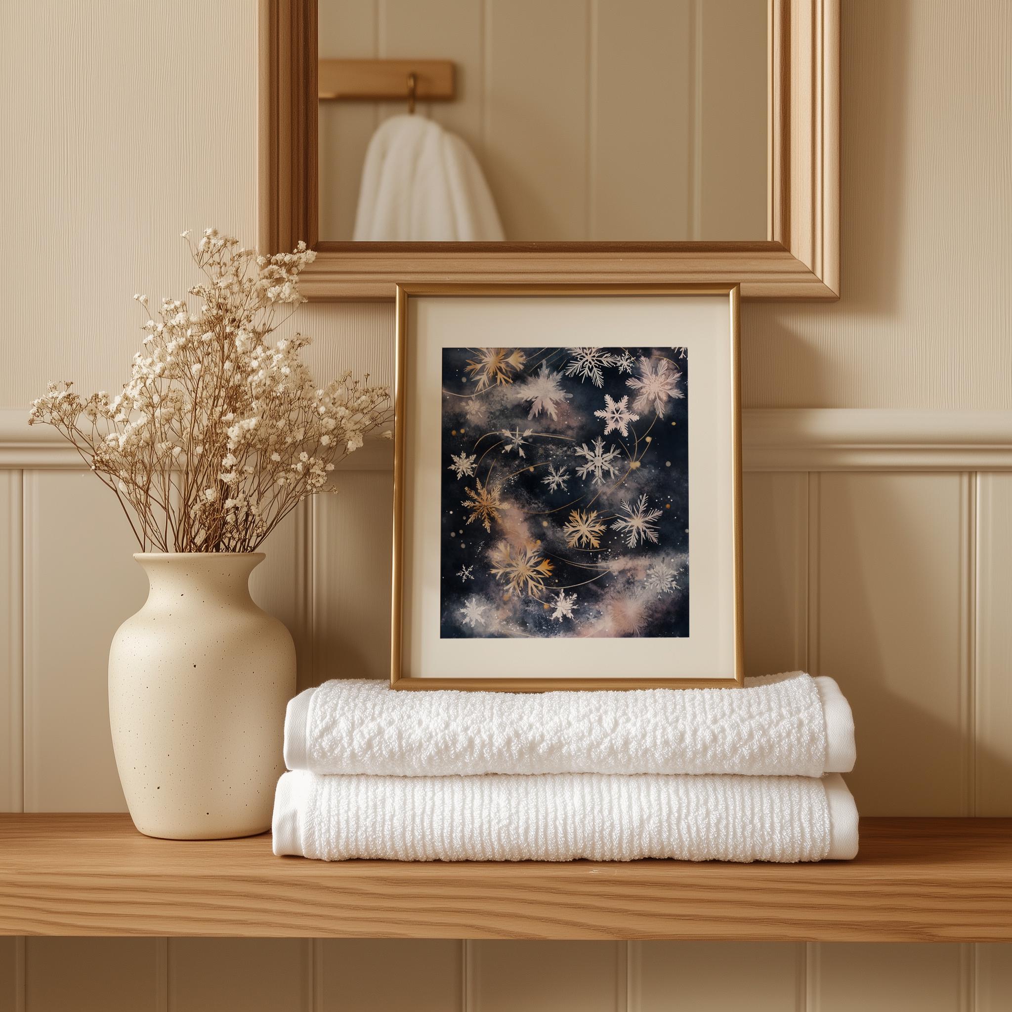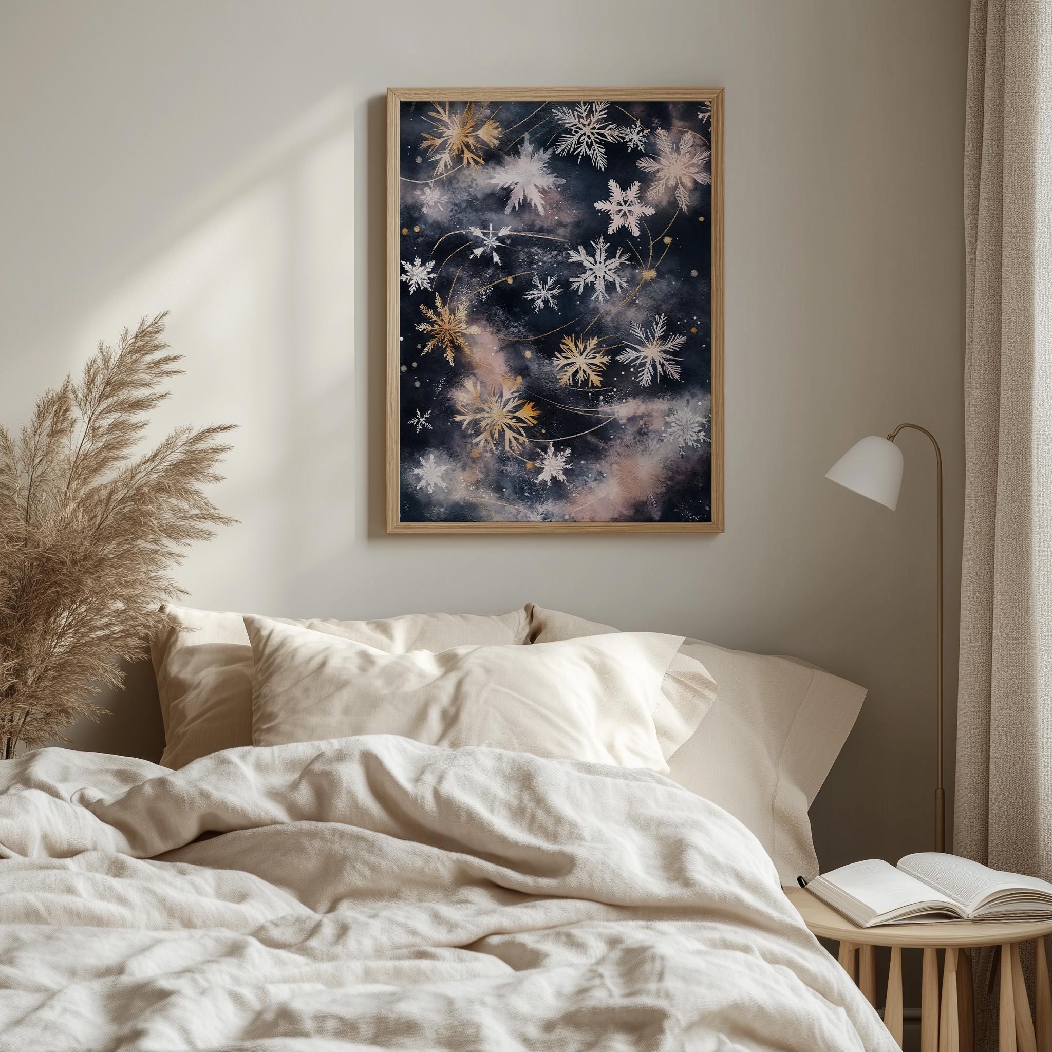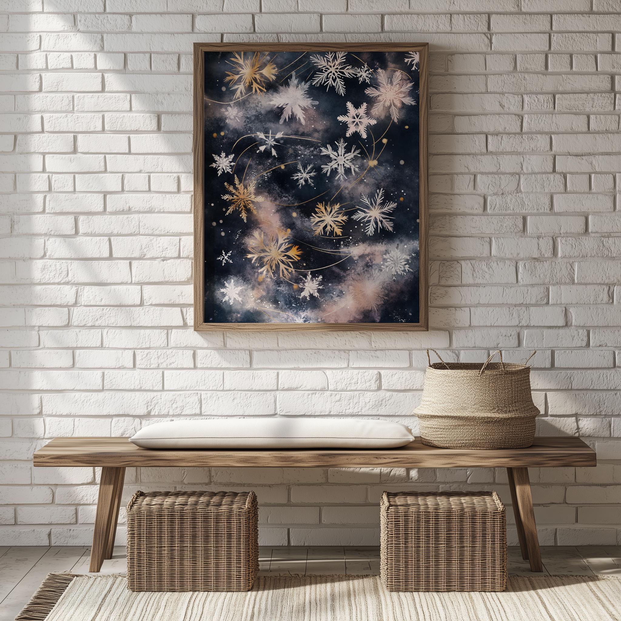 Immerse yourself in the charm of this rustic painting of dreamy celestial snowflakes against a moody starry sky. An instantly downloadable print, it's perfect for elevating your decor with budget-friendly charm. This gives you the flexibility to customize the size, frame, and material according to your personal taste and space, ensuring a perfect fit for your walls.