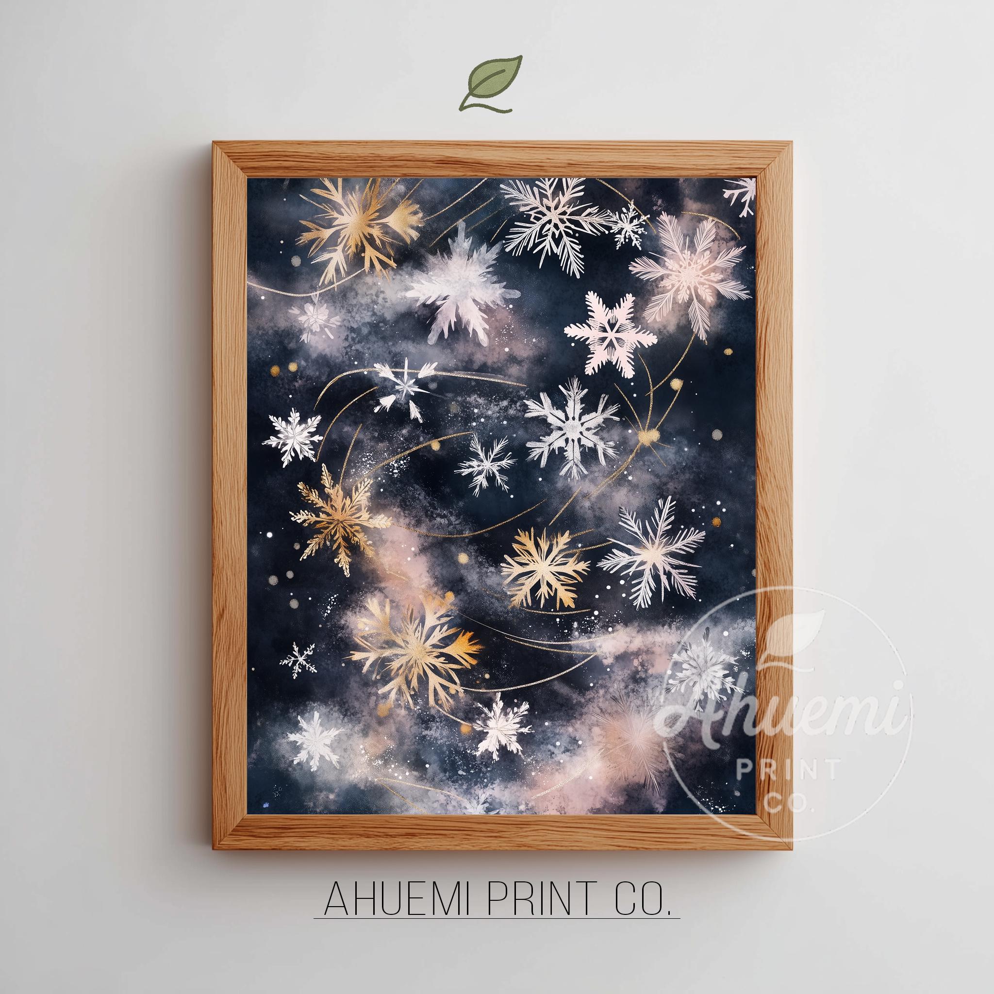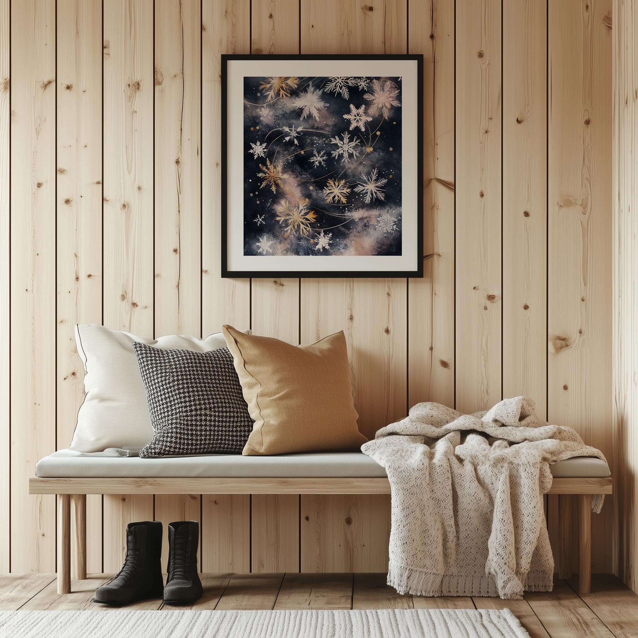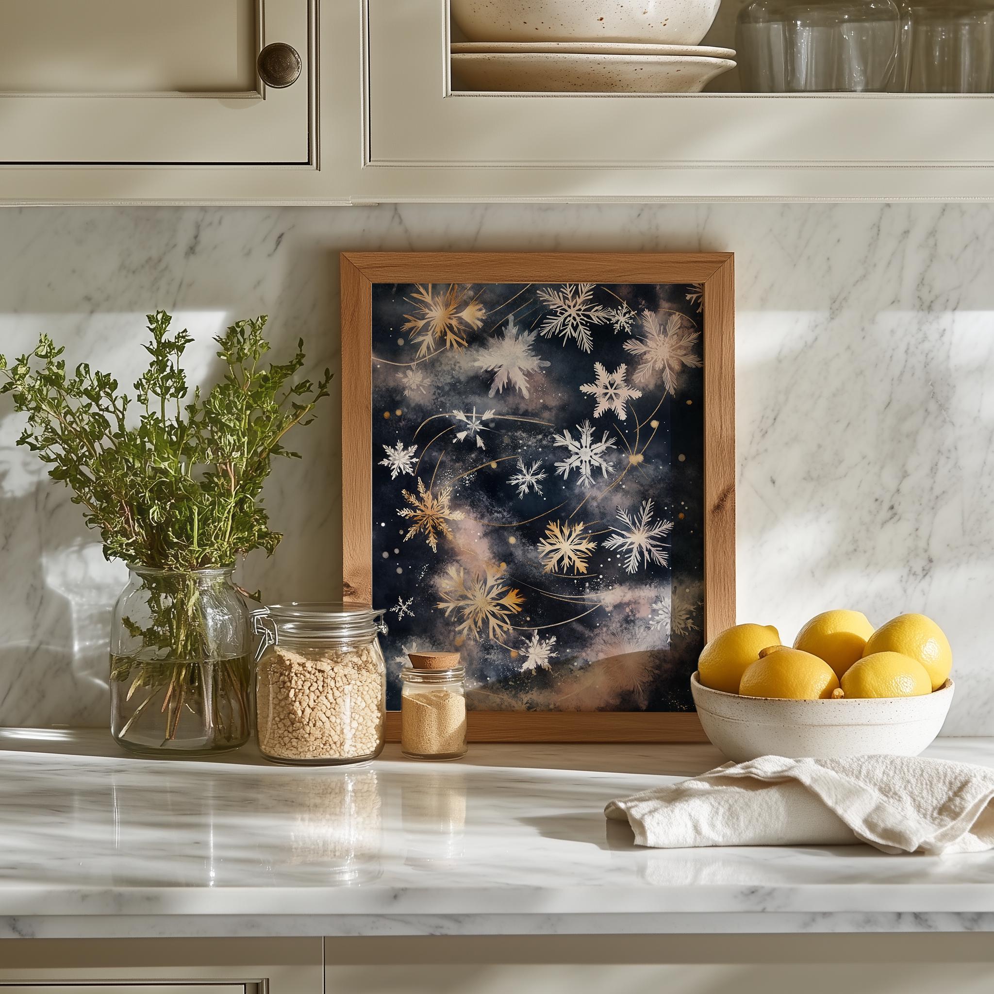 Immerse yourself in the charm of this rustic painting of dreamy celestial snowflakes against a moody starry sky. An instantly downloadable print, it's perfect for elevating your decor with budget-friendly charm. This gives you the flexibility to customize the size, frame, and material according to your personal taste and space, ensuring a perfect fit for your walls.