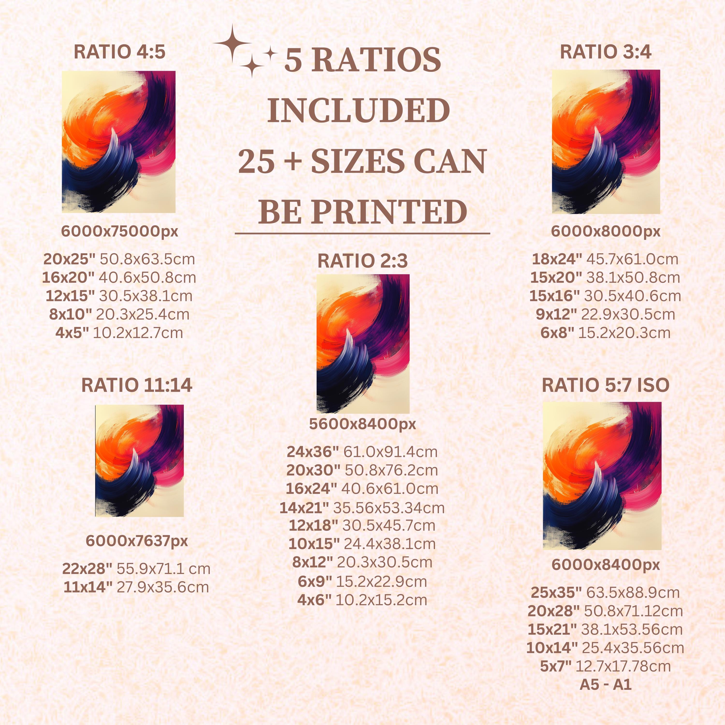 Each artwork includes 5 aspect ratios with 25+ print sizes. Most standard frames are covered. One custom resize per purchase available—message before ordering.
