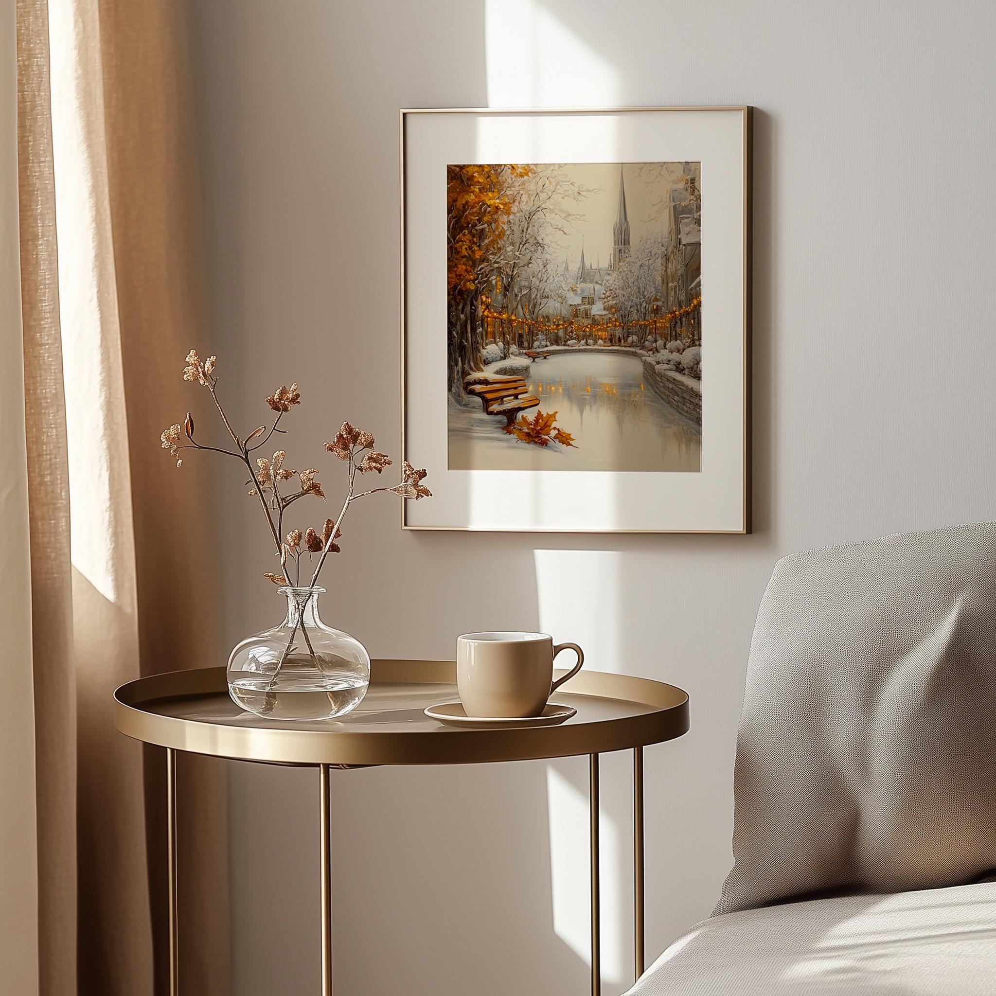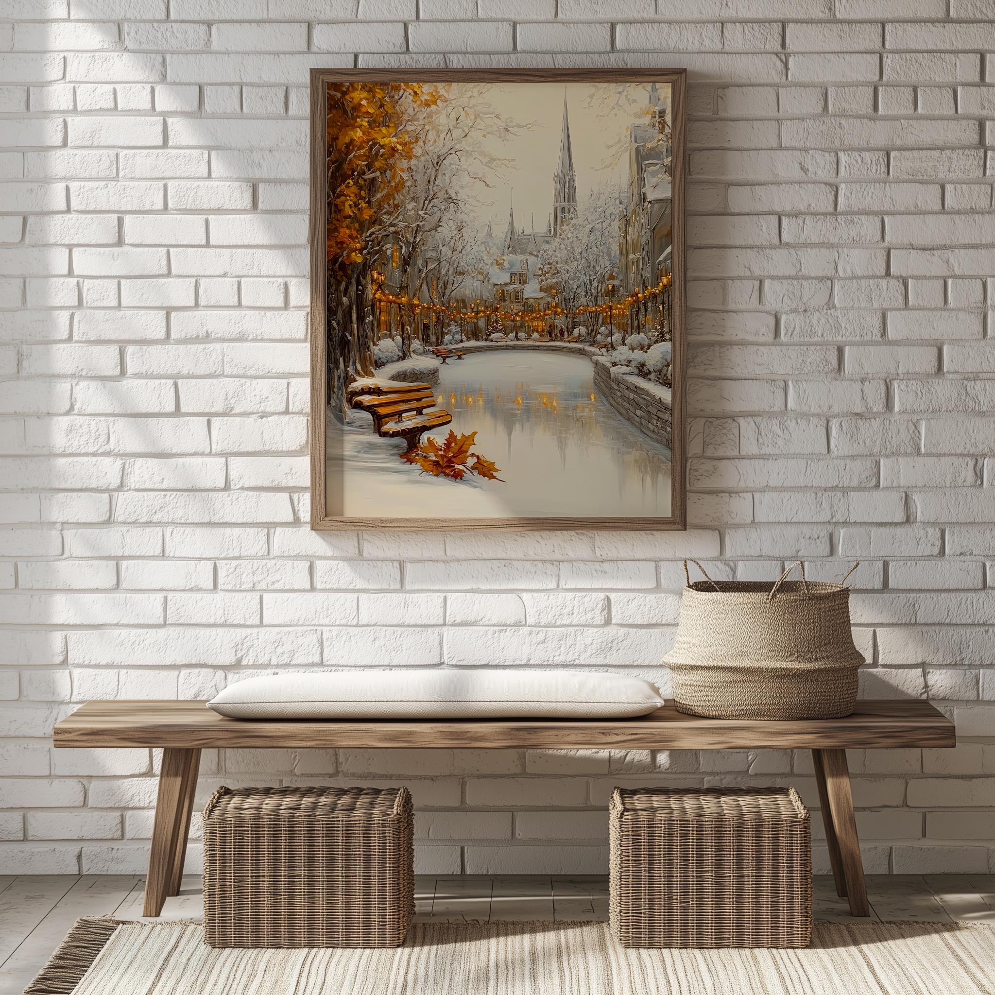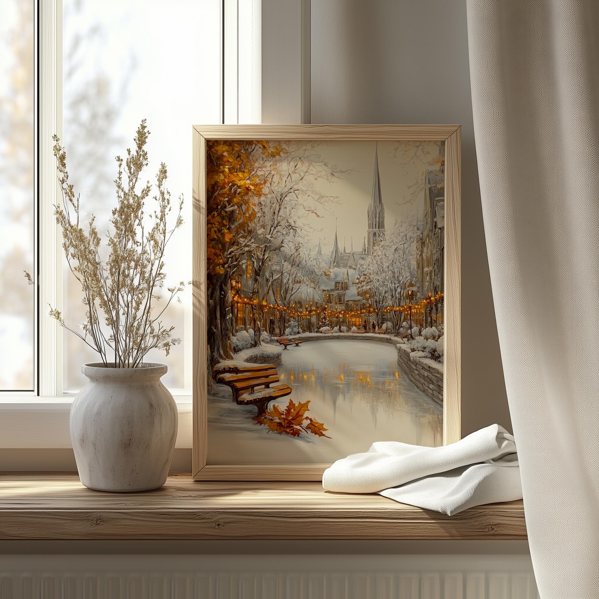 Immerse yourself in the charm of this rustic painting of a quaint village scene featuring joyful ice skaters gliding across a frosty pond surrounded by snow-dusted trees. An instantly downloadable print, it's perfect for elevating your decor with budget-friendly charm. This gives you the flexibility to customize the size, frame, and material according to your personal taste and space, ensuring a perfect fit for your walls.
