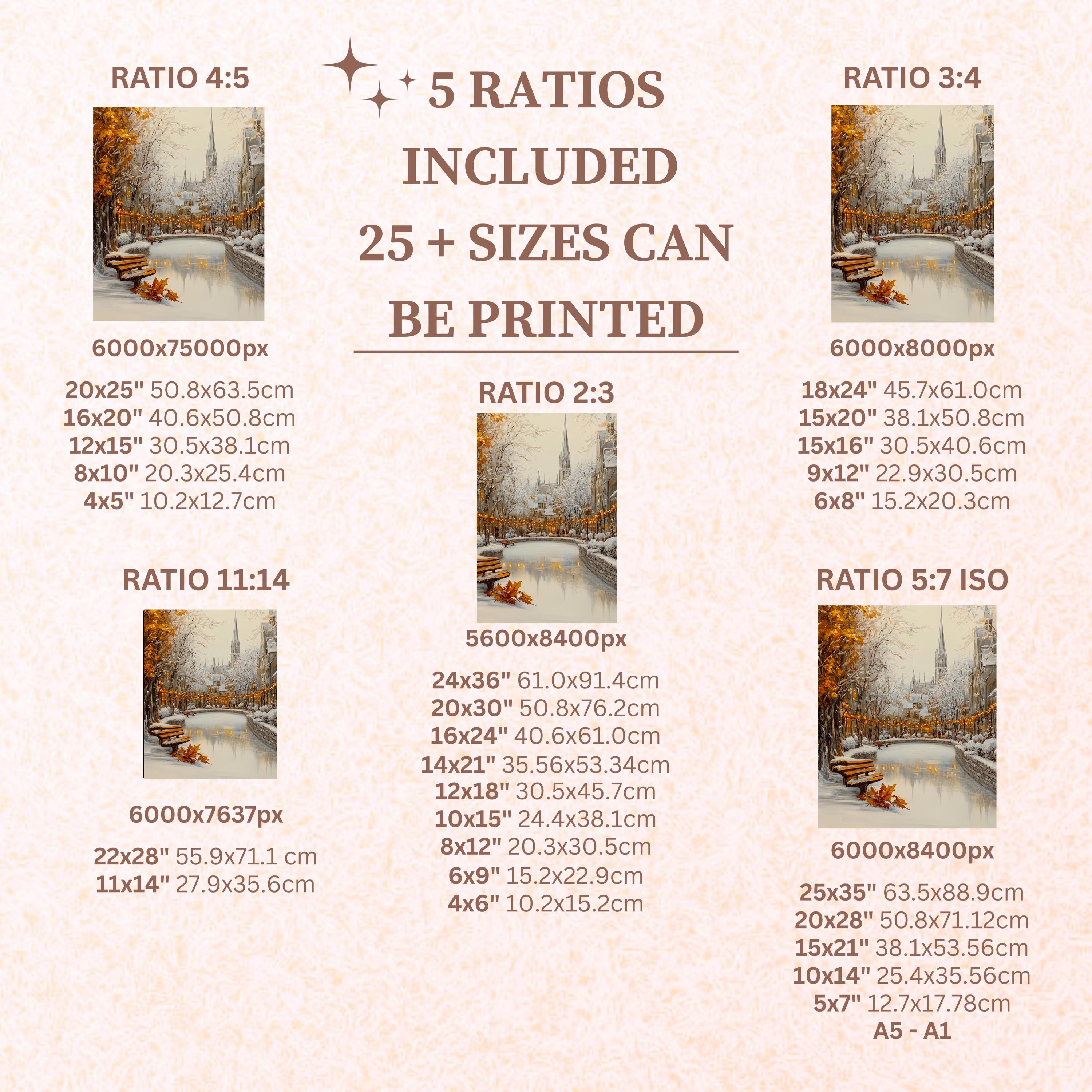 Each artwork includes 5 aspect ratios with 25+ print sizes. Most standard frames are covered. One custom resize per purchase available—message before ordering.