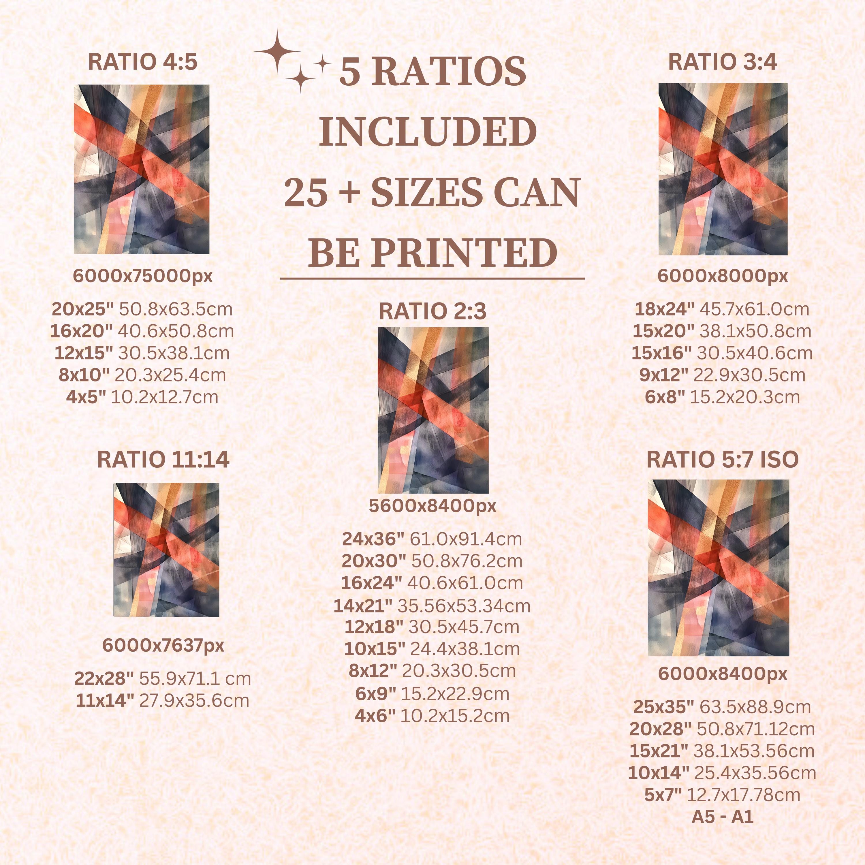 Each artwork includes 5 aspect ratios with 25+ print sizes. Most standard frames are covered. One custom resize per purchase available—message before ordering.