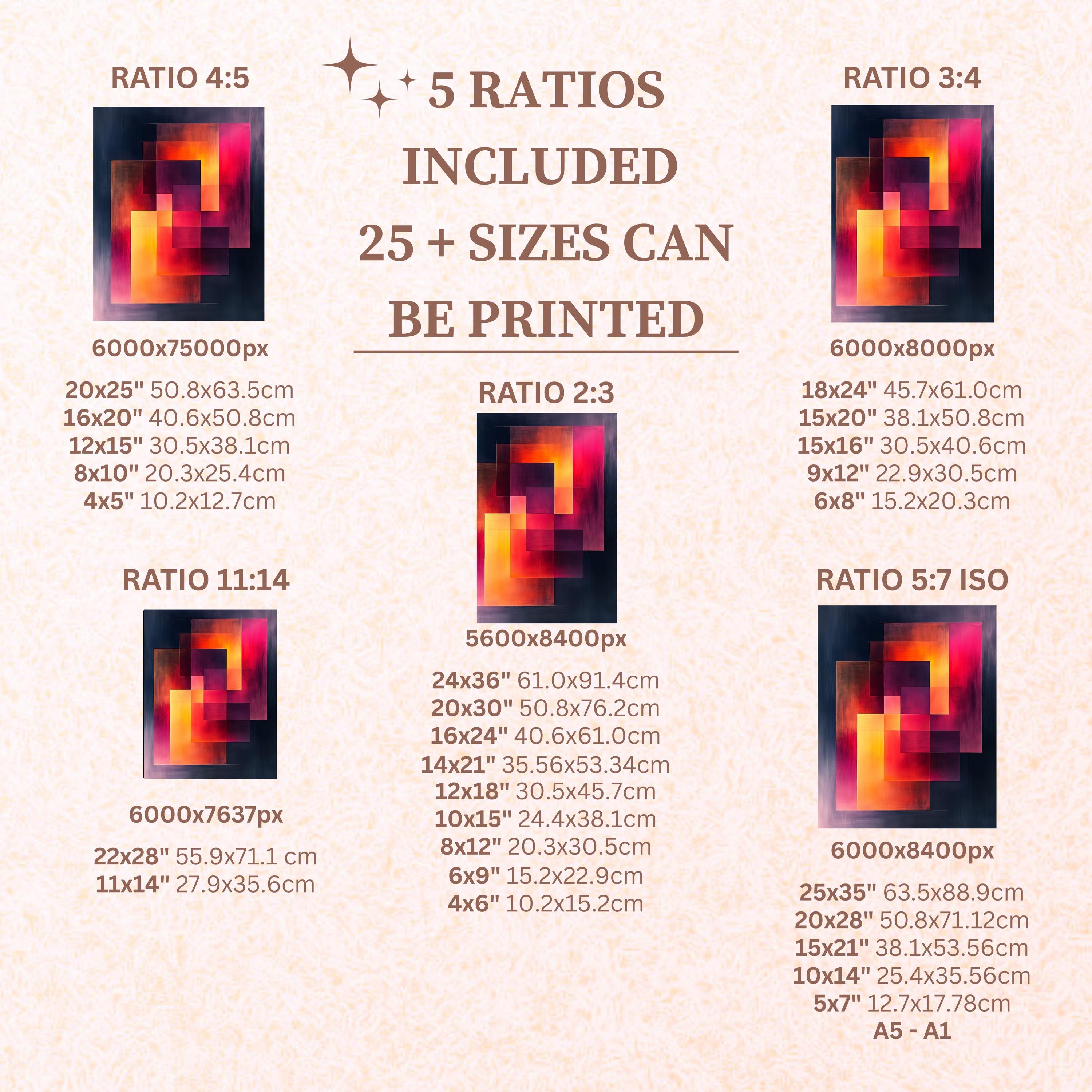 Each artwork includes 5 aspect ratios with 25+ print sizes. Most standard frames are covered. One custom resize per purchase available—message before ordering.