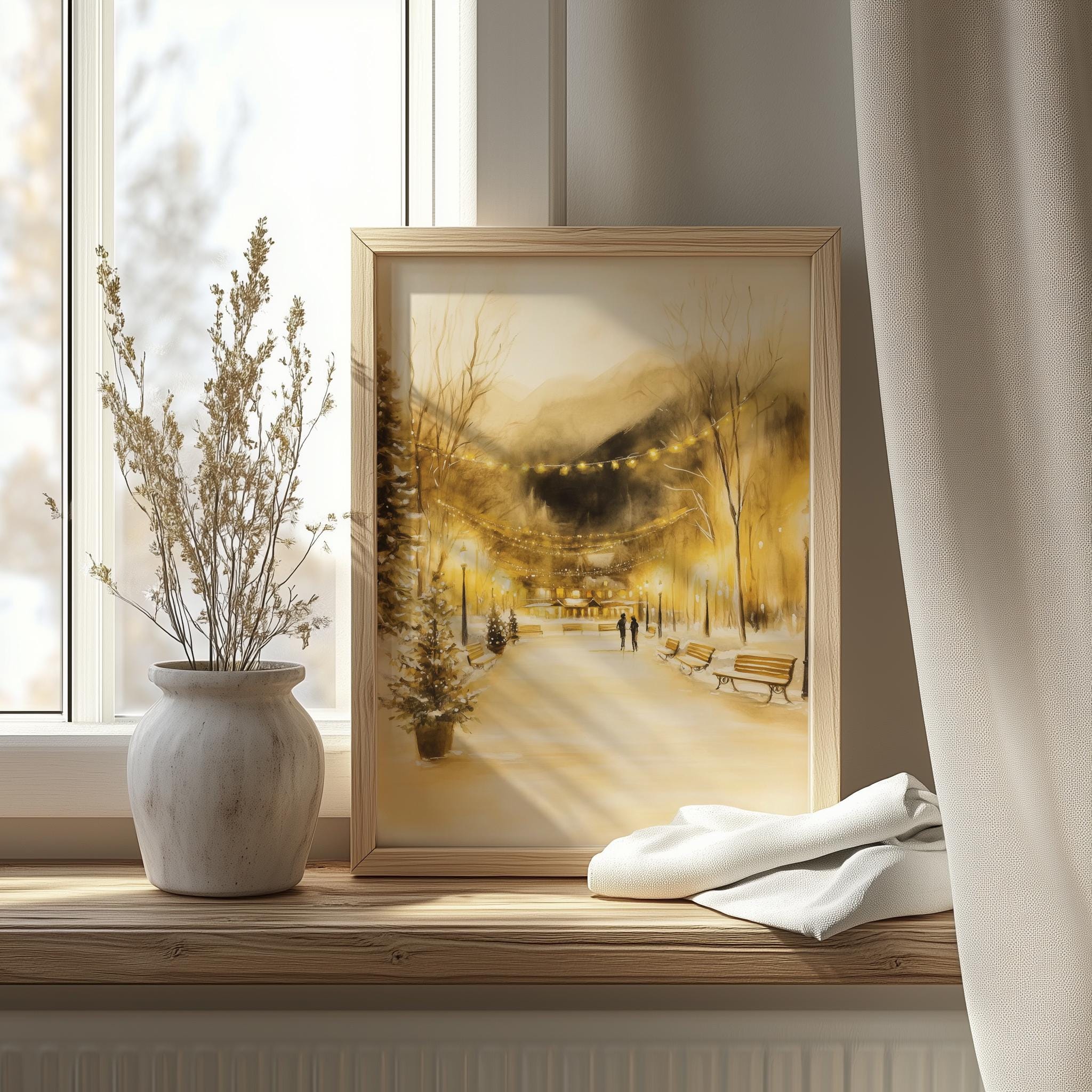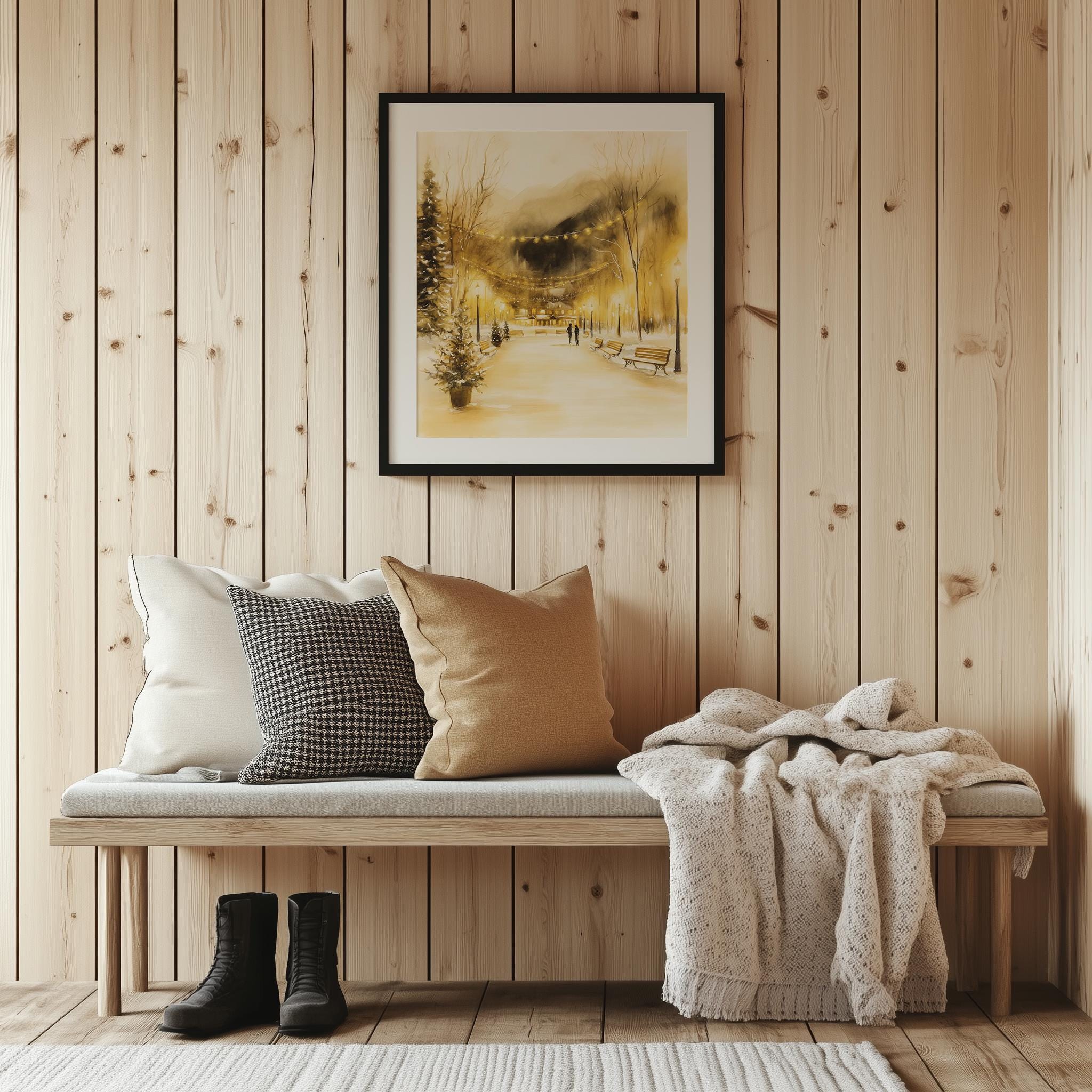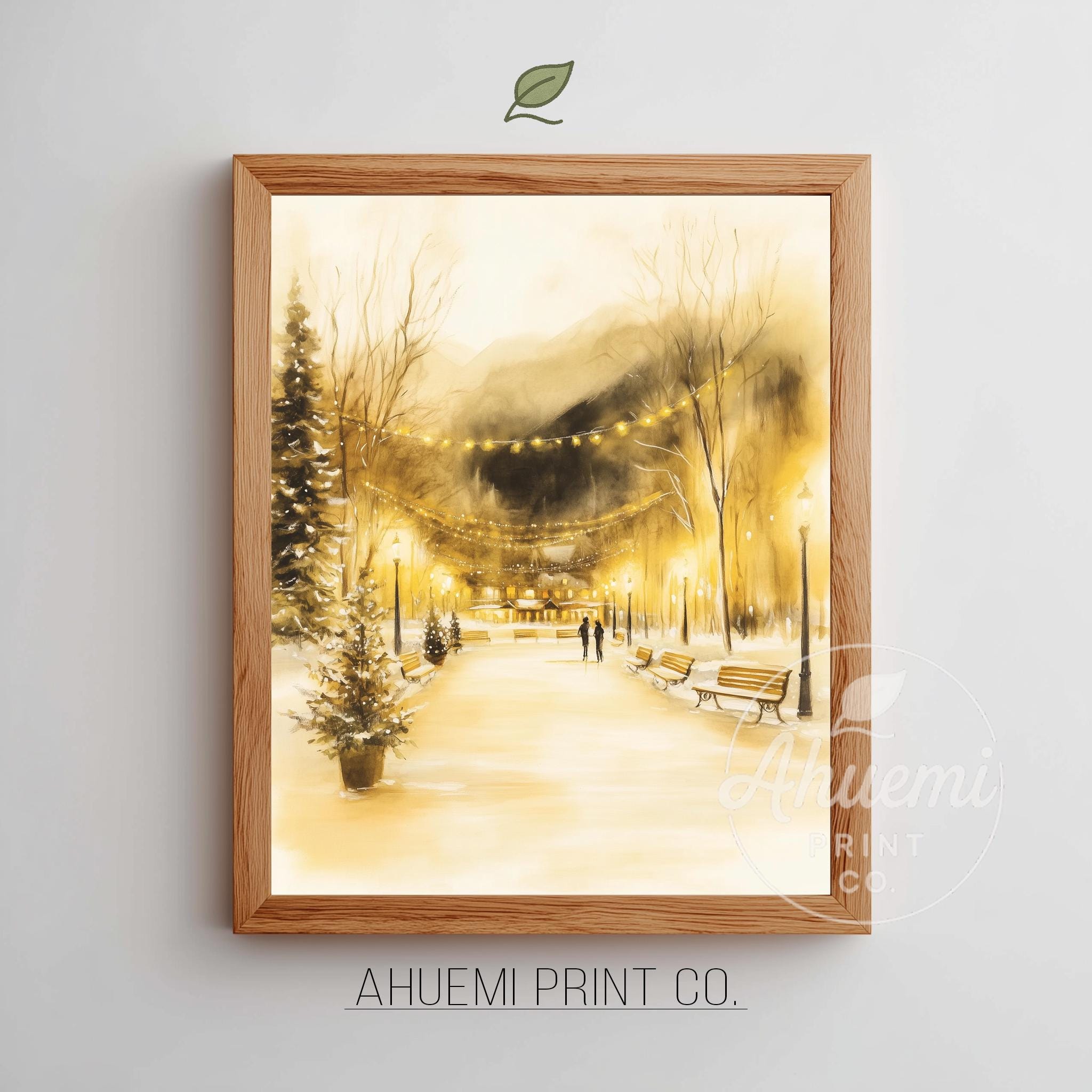 Immerse yourself in the charm of this rustic painting of a cozy winter village bustling with joyful ice skaters. An instantly downloadable print, it's perfect for elevating your decor with budget-friendly charm. This gives you the flexibility to customize the size, frame, and material according to your personal taste and space, ensuring a perfect fit for your walls.