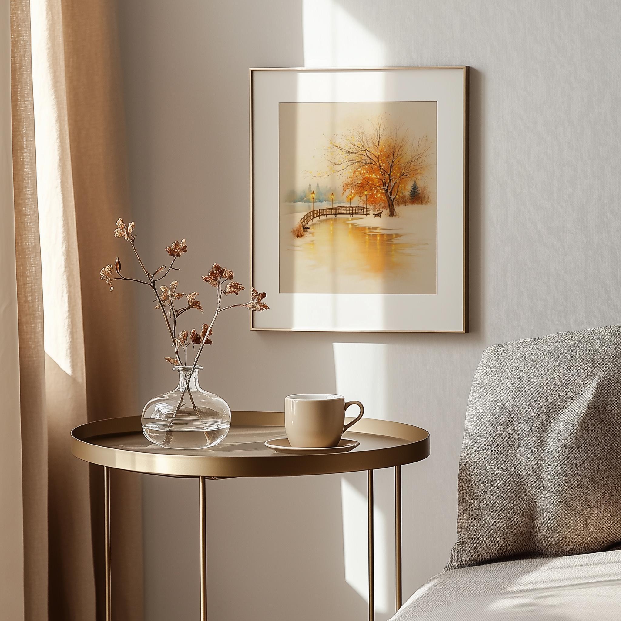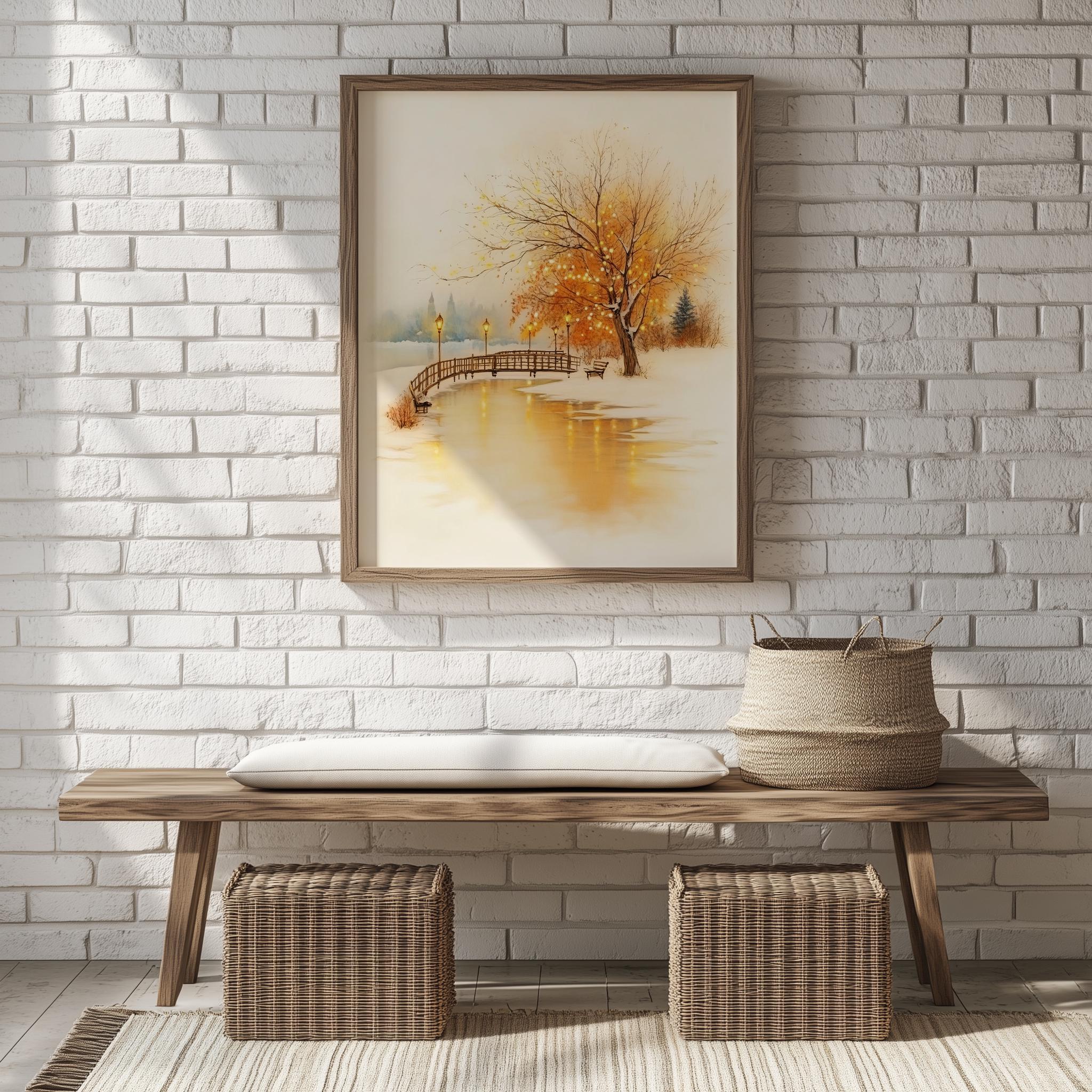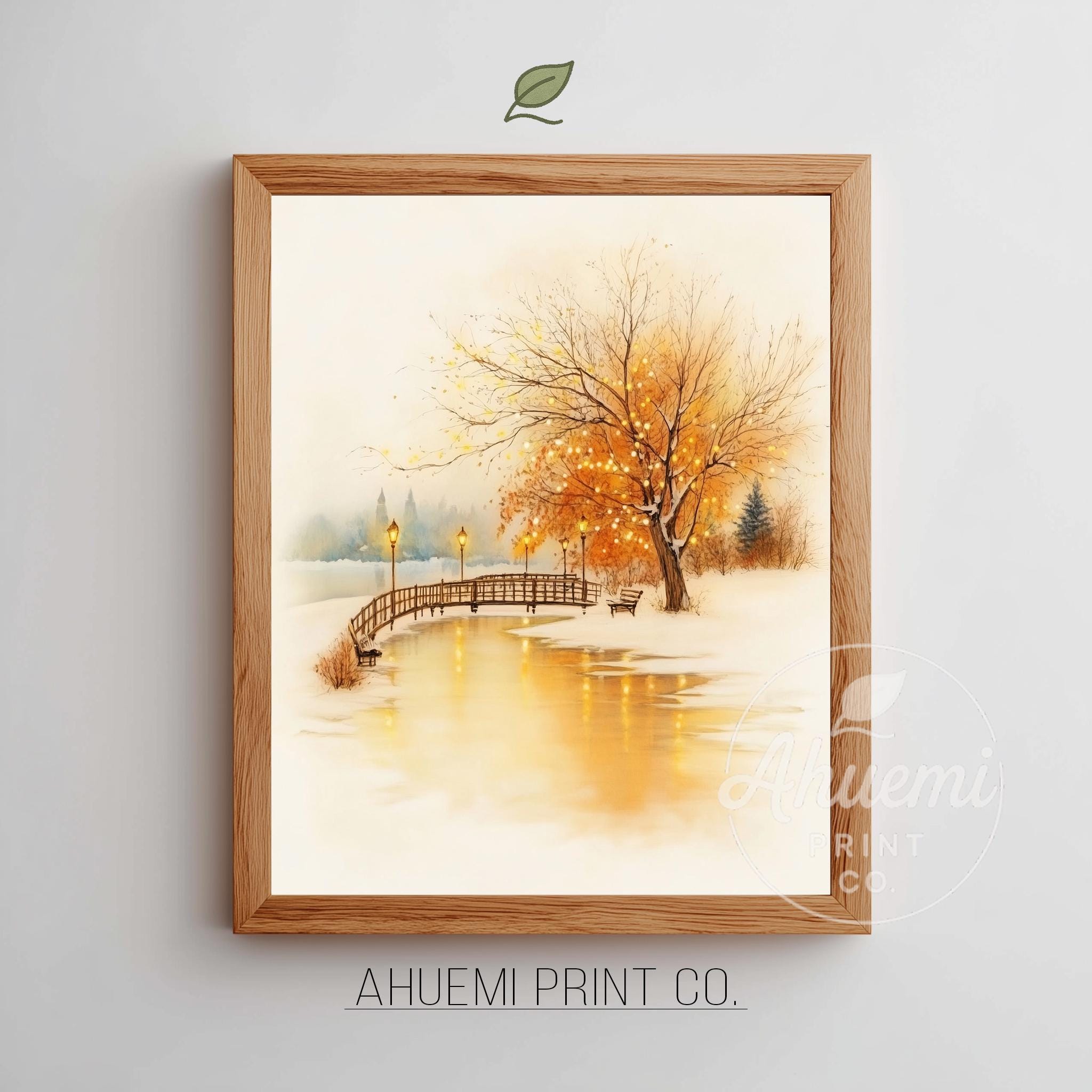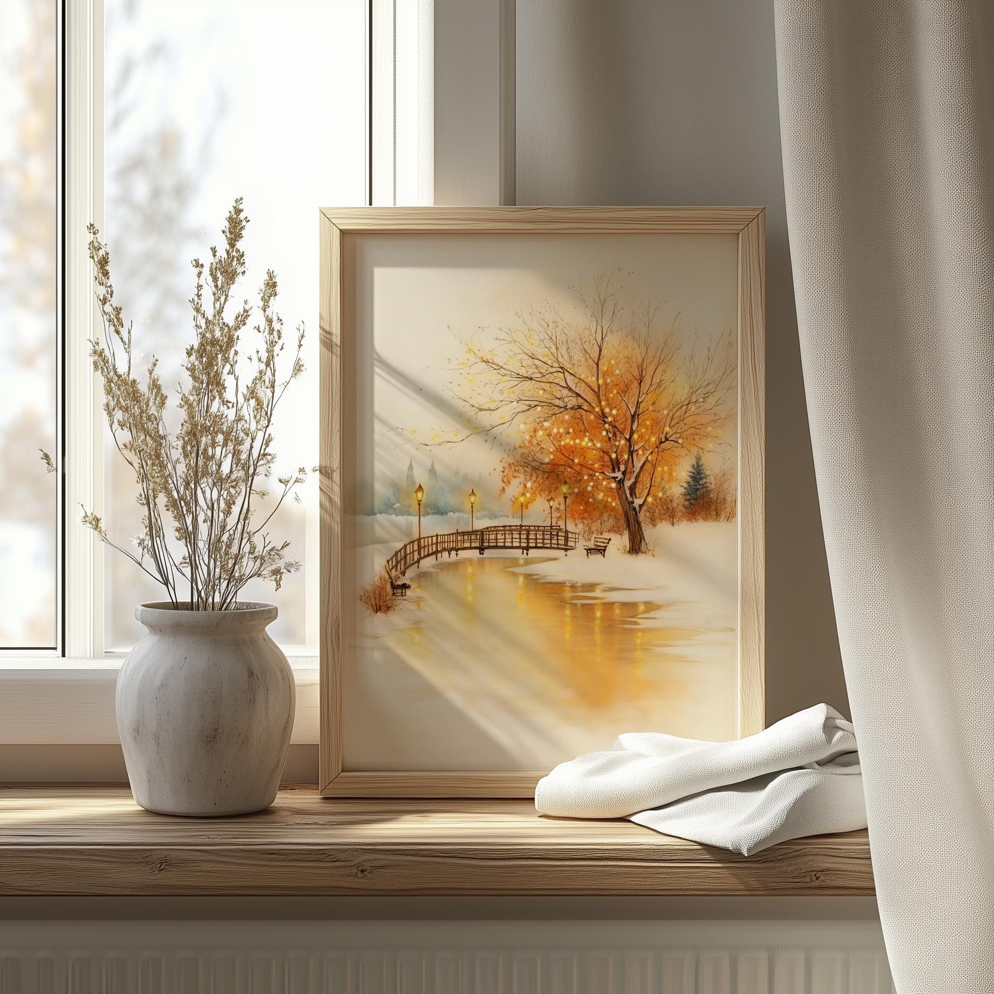 Immerse yourself in the charm of this rustic painting of a picturesque winter village adorned with a romantic arched bridge, surrounded by a serene snowy landscape. An instantly downloadable print, it's perfect for elevating your decor with budget-friendly charm. This gives you the flexibility to customize the size, frame, and material according to your personal taste and space, ensuring a perfect fit for your walls.