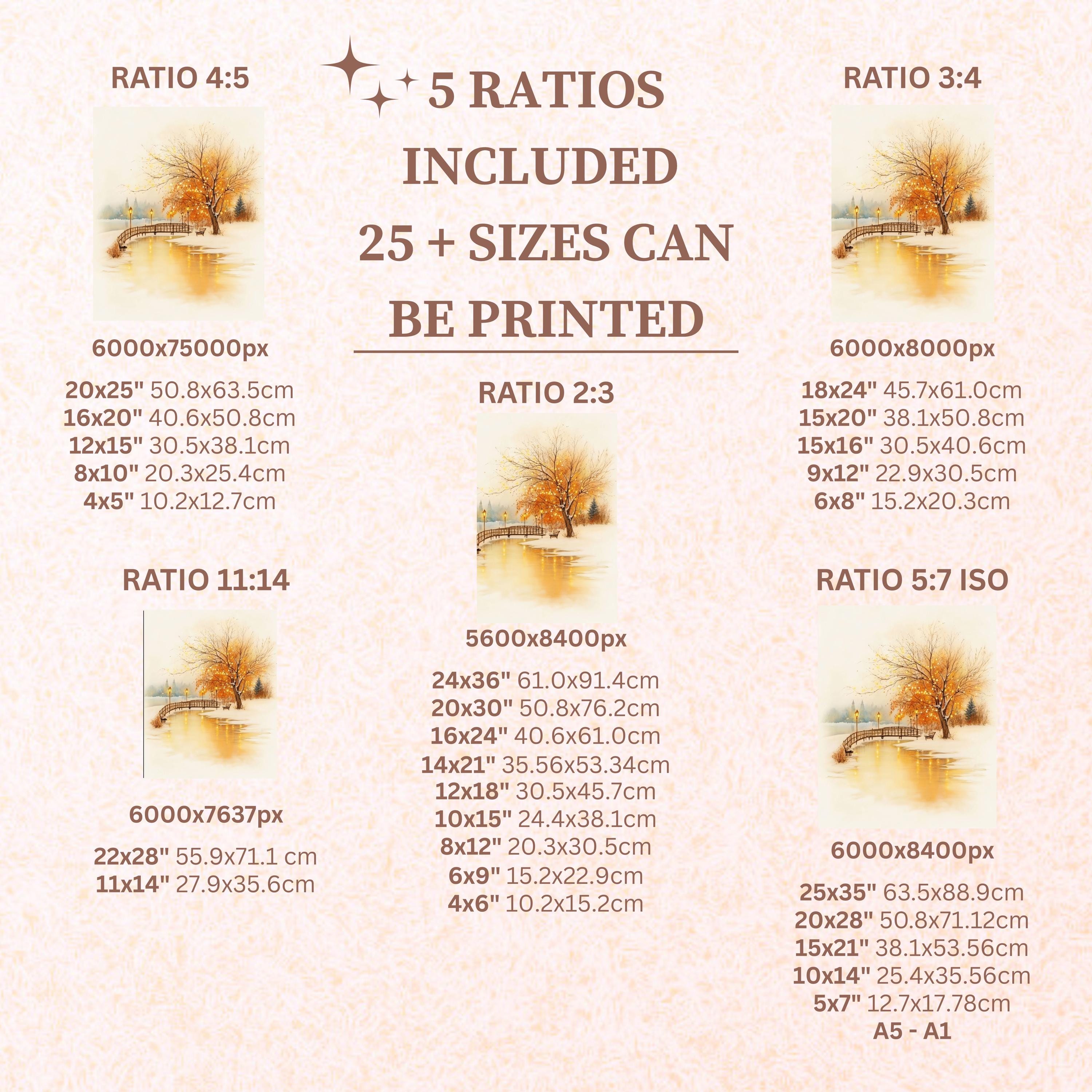 Each artwork includes 5 aspect ratios with 25+ print sizes. Most standard frames are covered. One custom resize per purchase available—message before ordering.