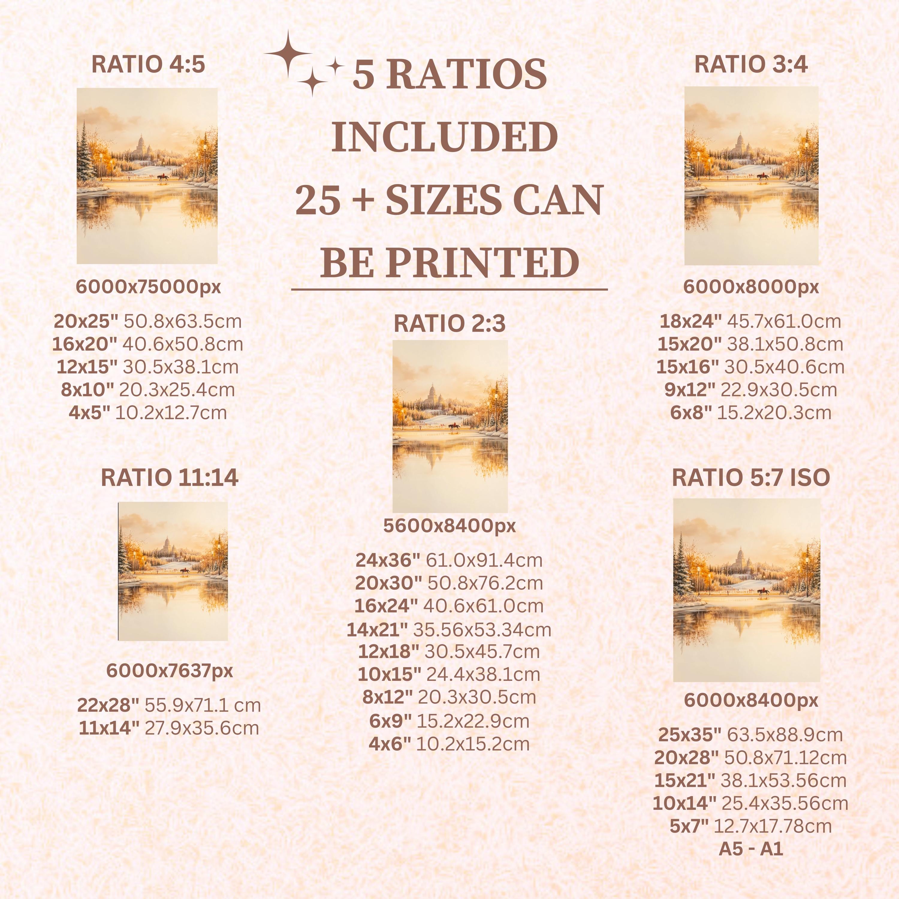 Each artwork includes 5 aspect ratios with 25+ print sizes. Most standard frames are covered. One custom resize per purchase available—message before ordering.