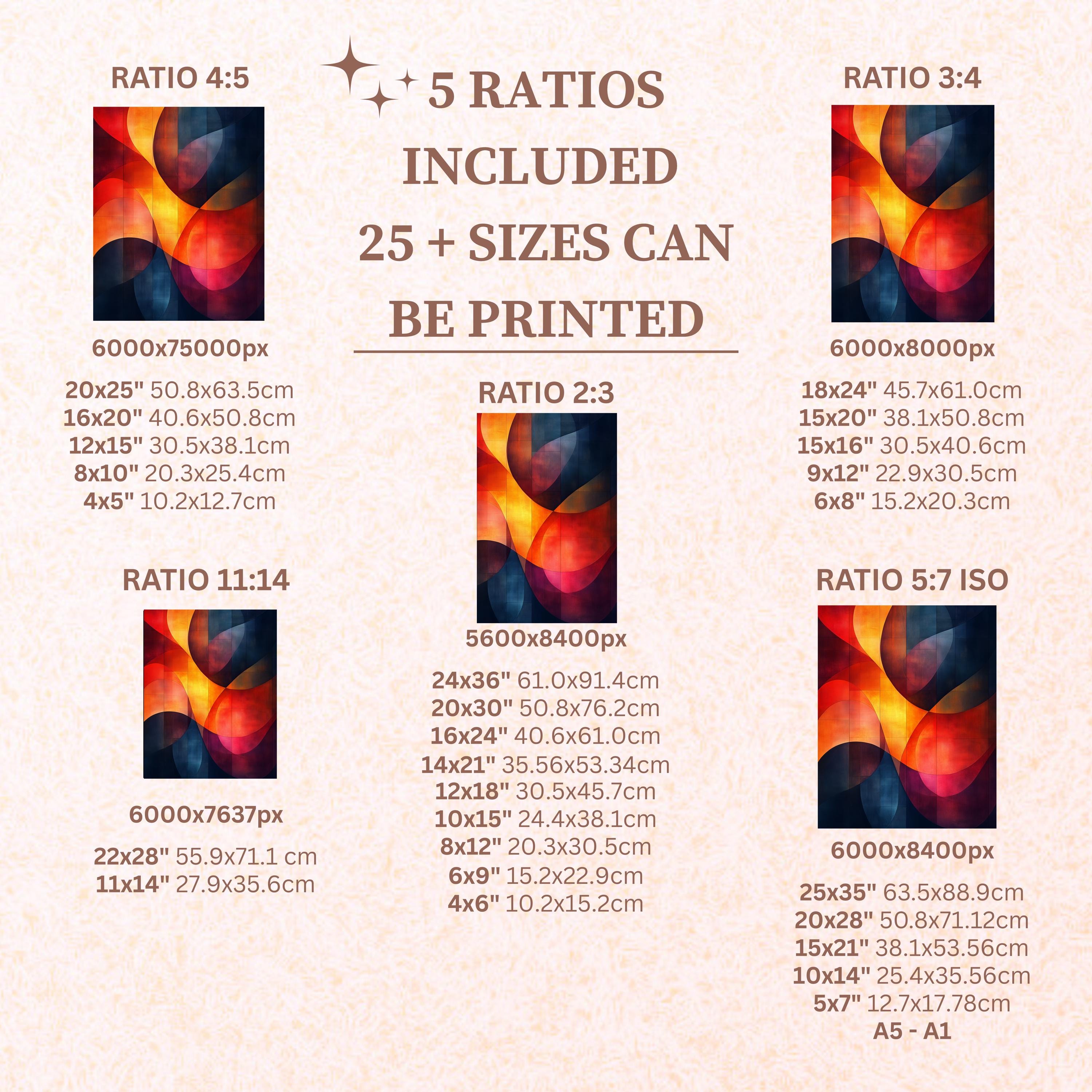 Each artwork includes 5 aspect ratios with 25+ print sizes. Most standard frames are covered. One custom resize per purchase available—message before ordering.
