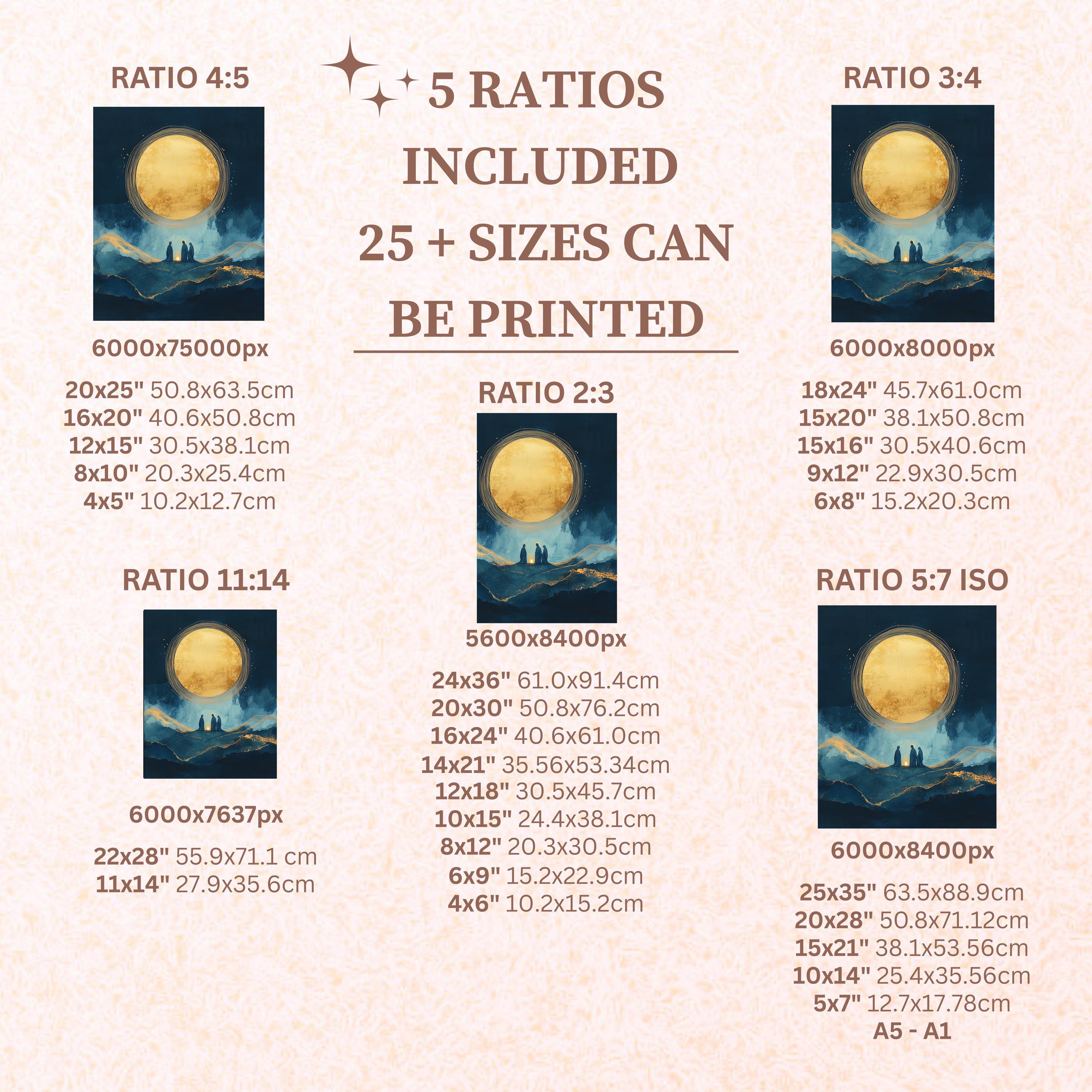 Each artwork includes 5 aspect ratios with 25+ print sizes. Most standard frames are covered. One custom resize per purchase available—message before ordering.