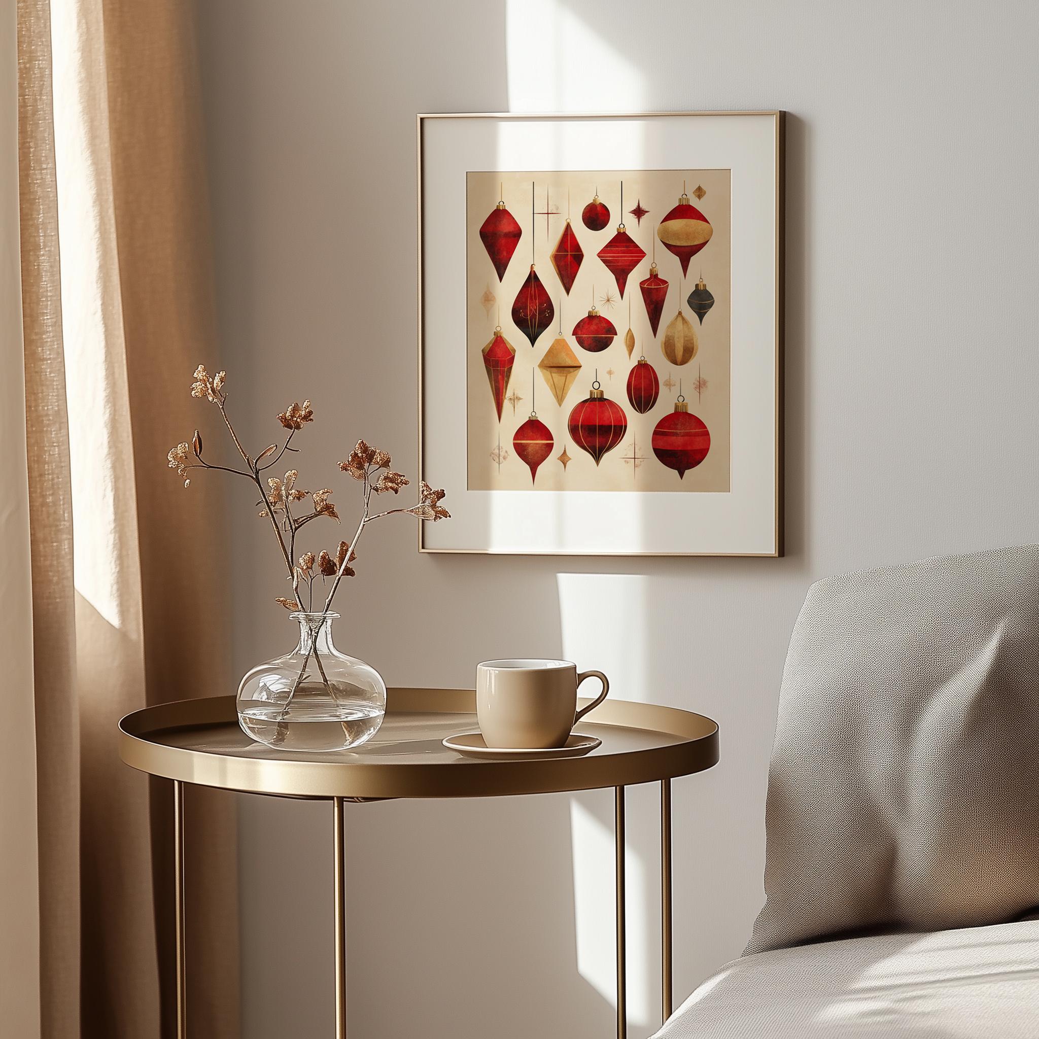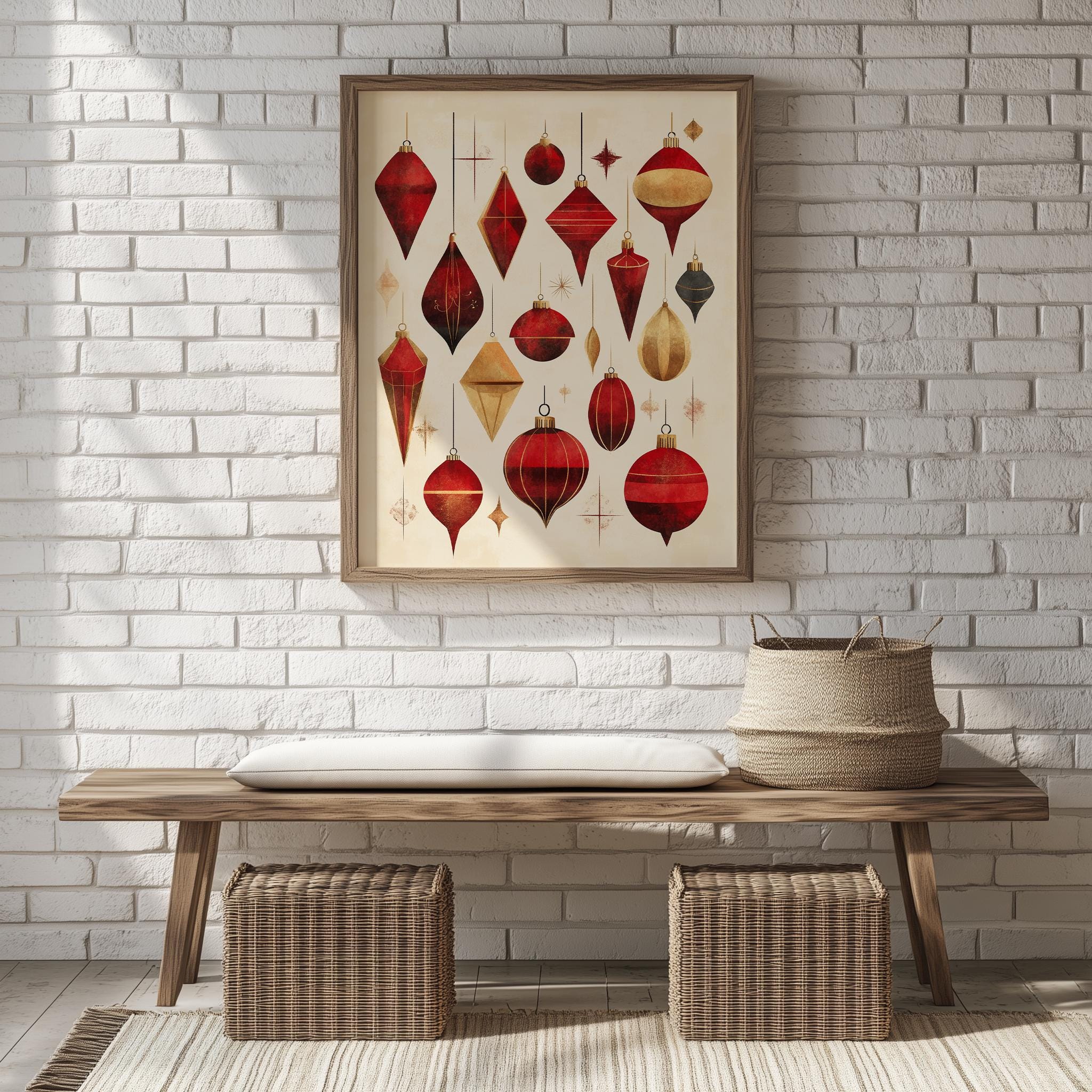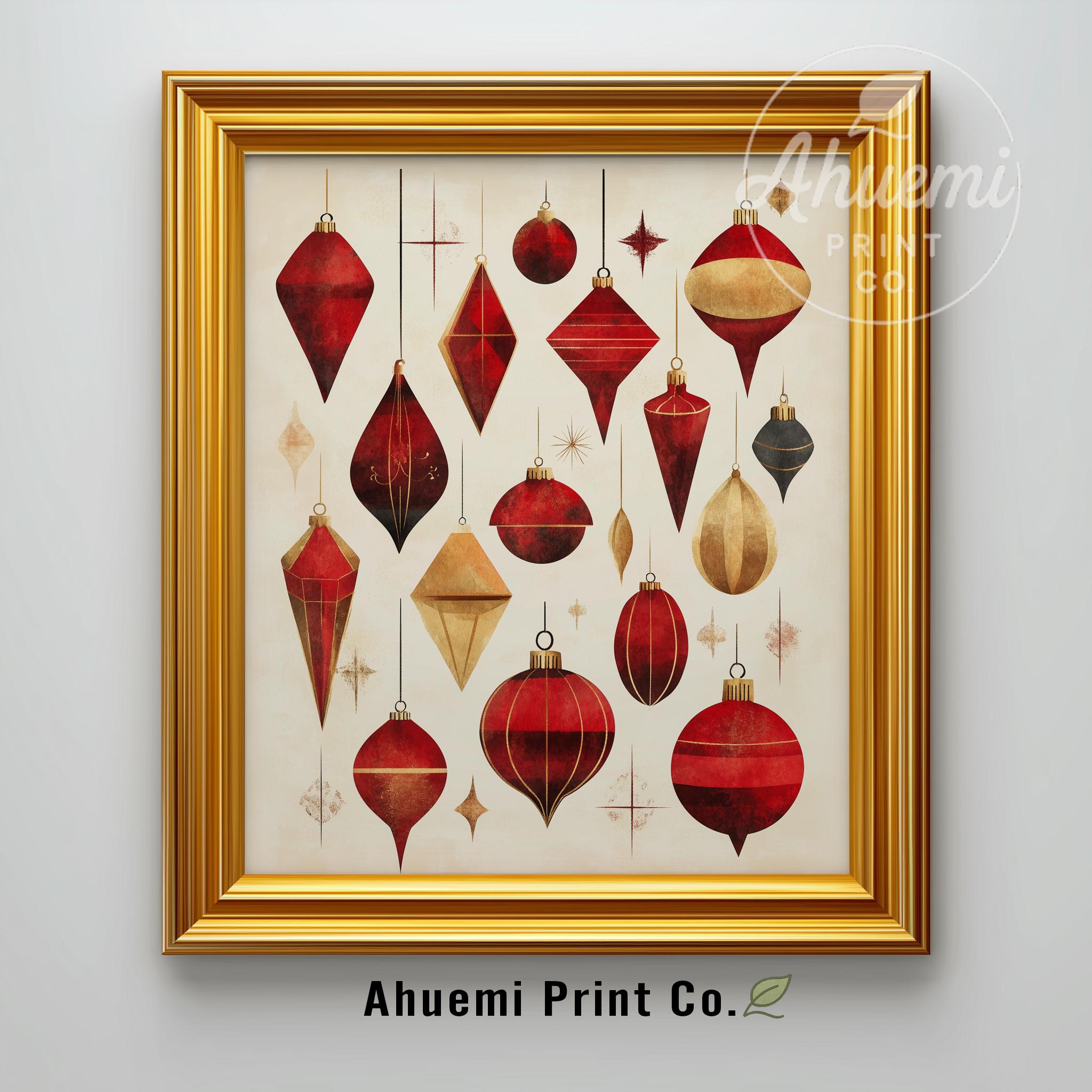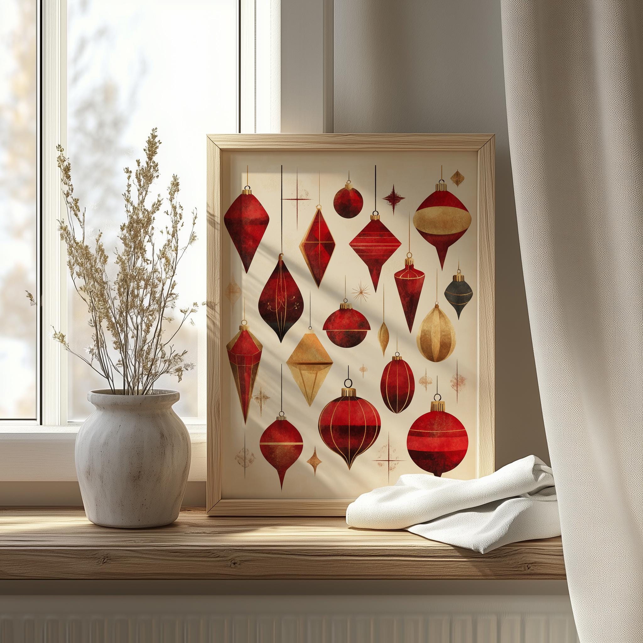 Immerse yourself in the charm of this rustic painting of vintage Christmas ornaments adorned with intricate patterns and warm, muted colors. An instantly downloadable print, it's perfect for elevating your decor with budget-friendly charm. This gives you the flexibility to customize the size, frame, and material according to your personal taste and space, ensuring a perfect fit for your walls.
