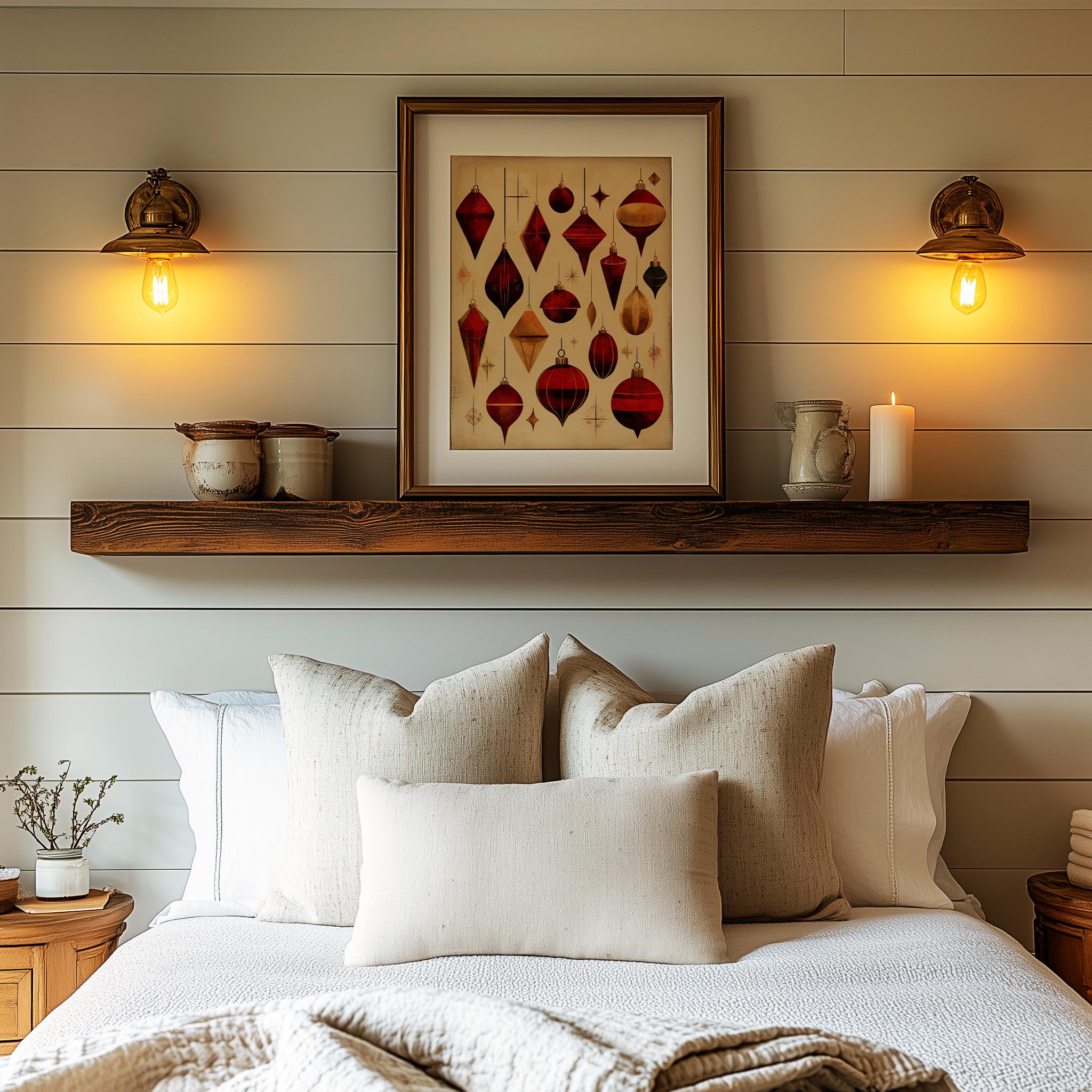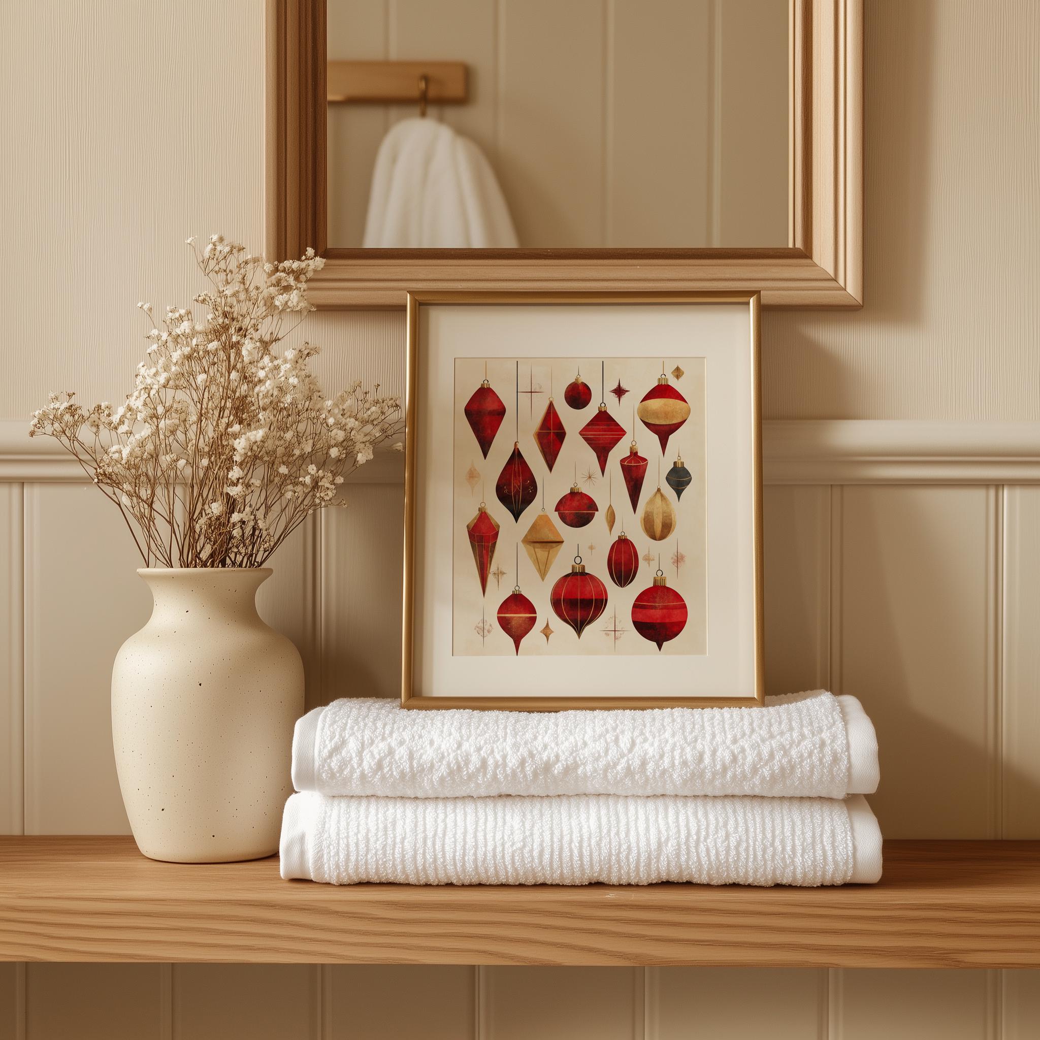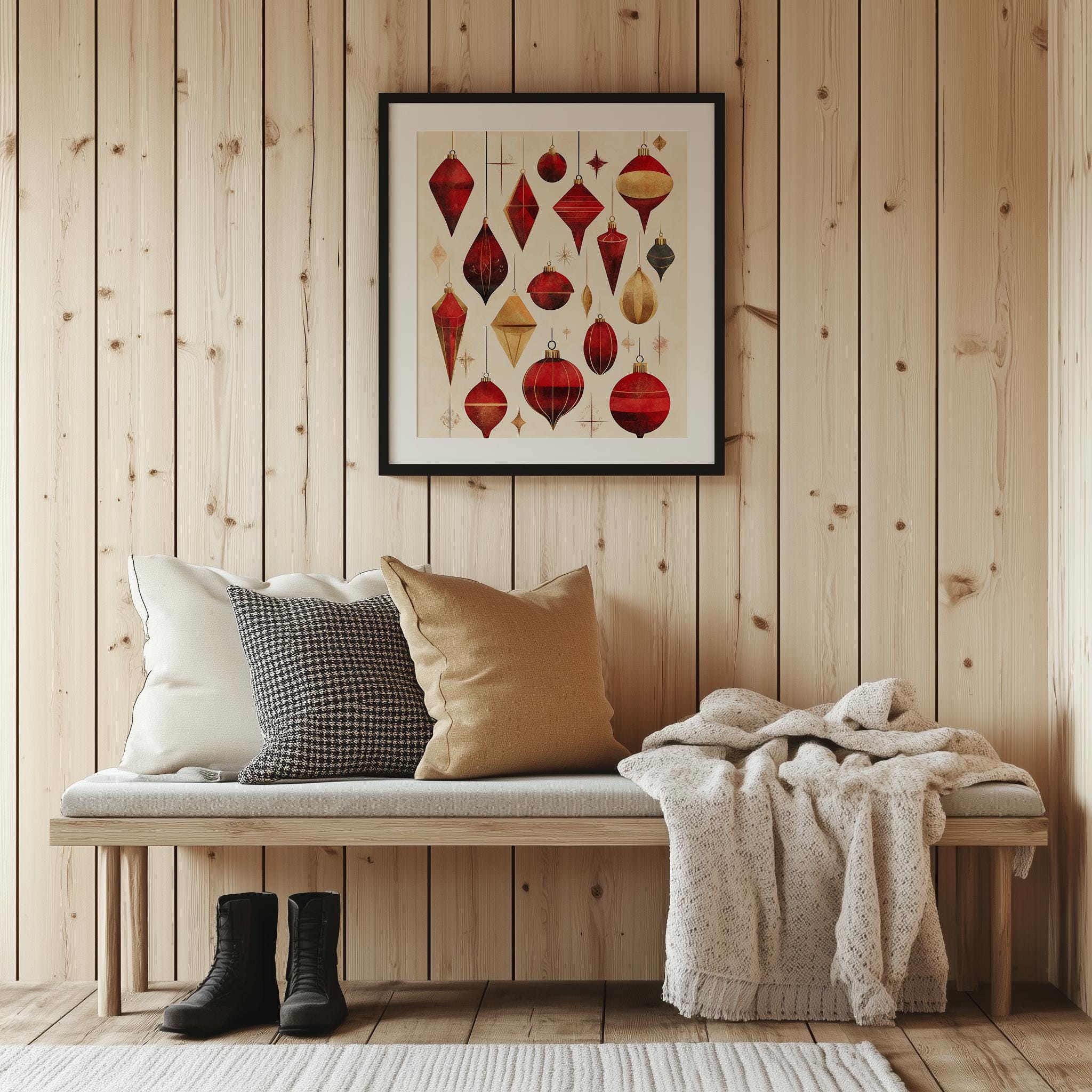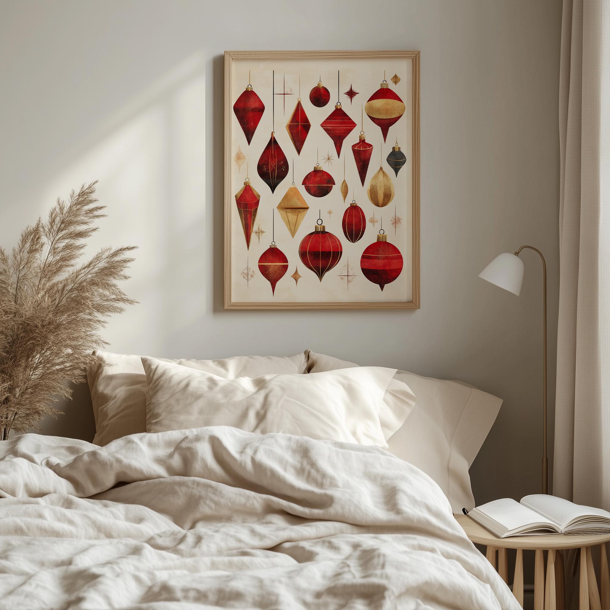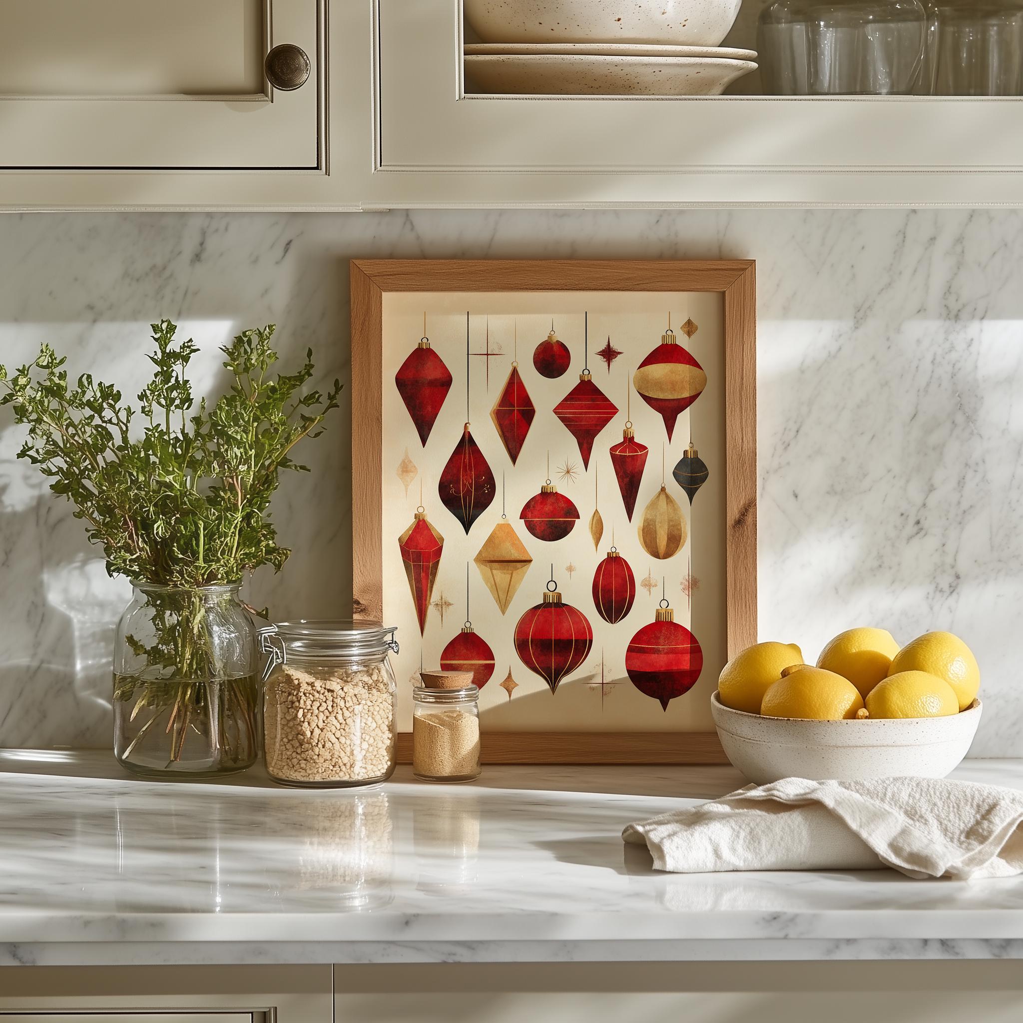 Immerse yourself in the charm of this rustic painting of vintage Christmas ornaments adorned with intricate patterns and warm, muted colors. An instantly downloadable print, it's perfect for elevating your decor with budget-friendly charm. This gives you the flexibility to customize the size, frame, and material according to your personal taste and space, ensuring a perfect fit for your walls.