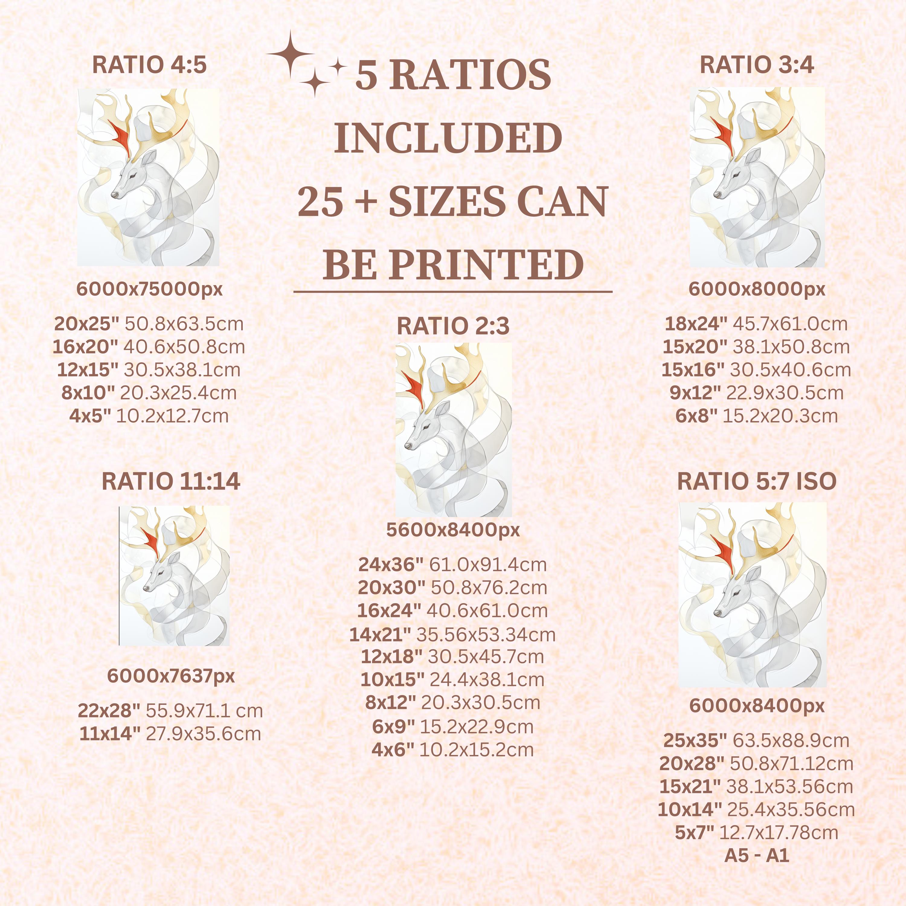 Each artwork includes 5 aspect ratios with 25+ print sizes. Most standard frames are covered. One custom resize per purchase available—message before ordering.