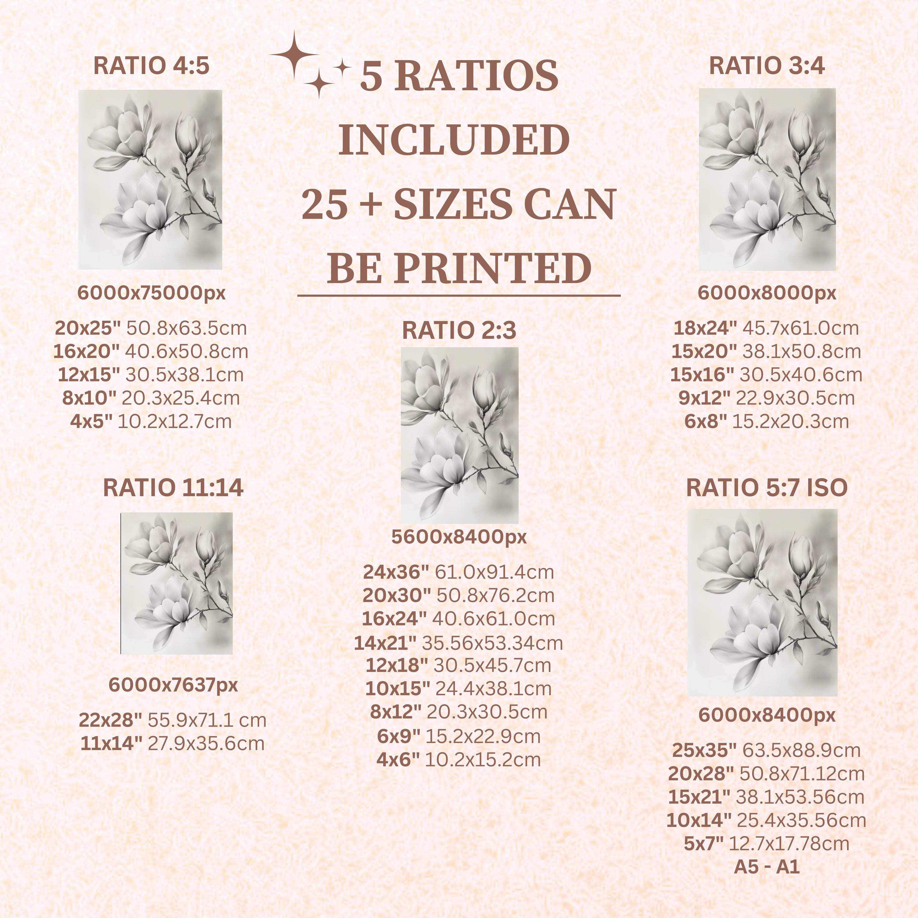 Each artwork includes 5 aspect ratios with 25+ print sizes. Most standard frames are covered. One custom resize per purchase available—message before ordering.