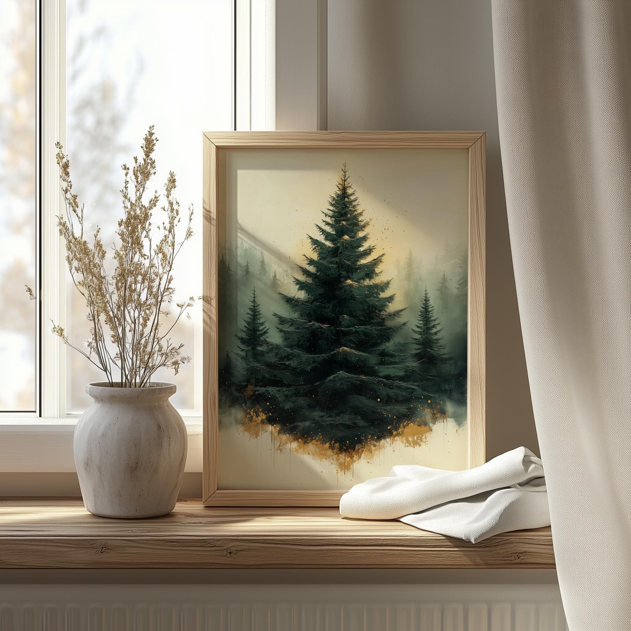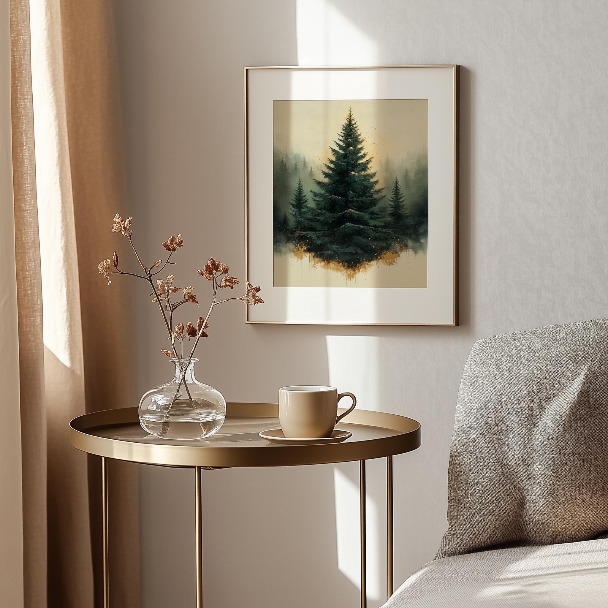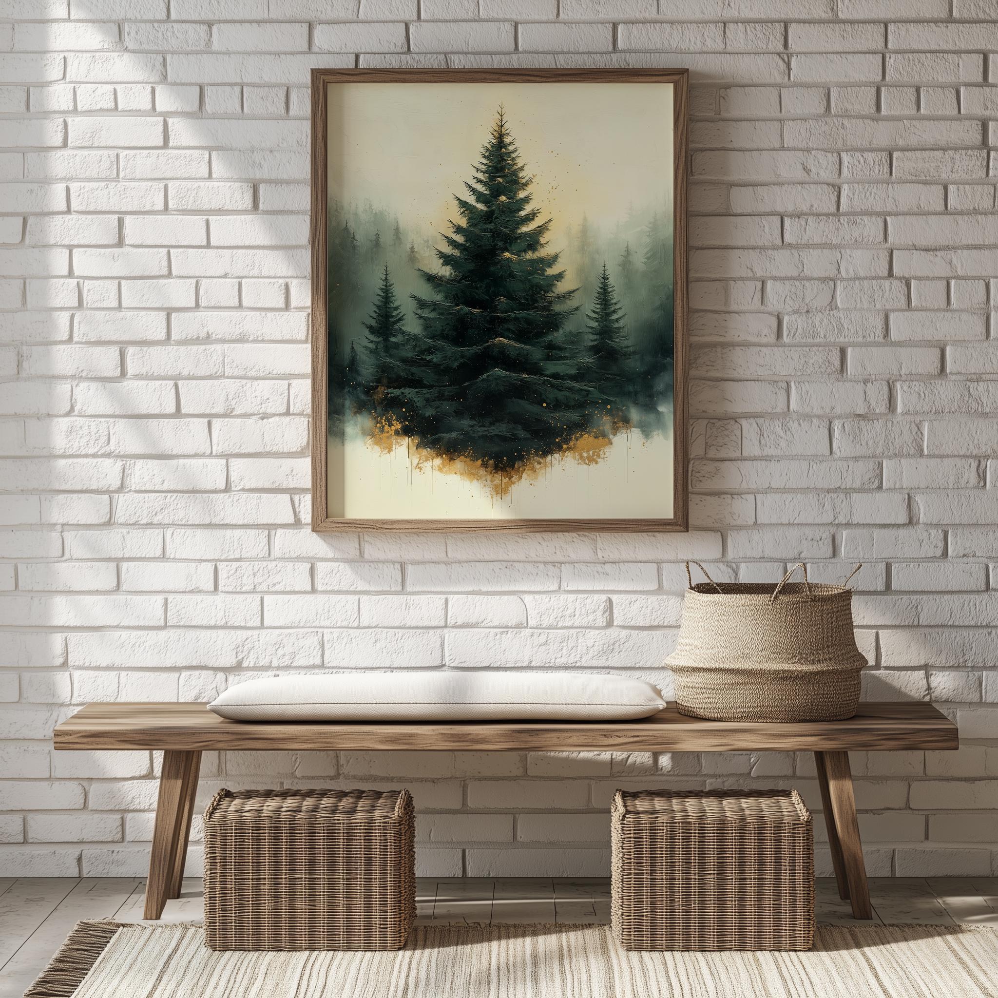 Immerse yourself in the charm of this rustic painting of a moody evergreen Christmas tree adorned with elegant gold splatters. An instantly downloadable print, it's perfect for elevating your decor with budget-friendly charm. This gives you the flexibility to customize the size, frame, and material according to your personal taste and space, ensuring a perfect fit for your walls.