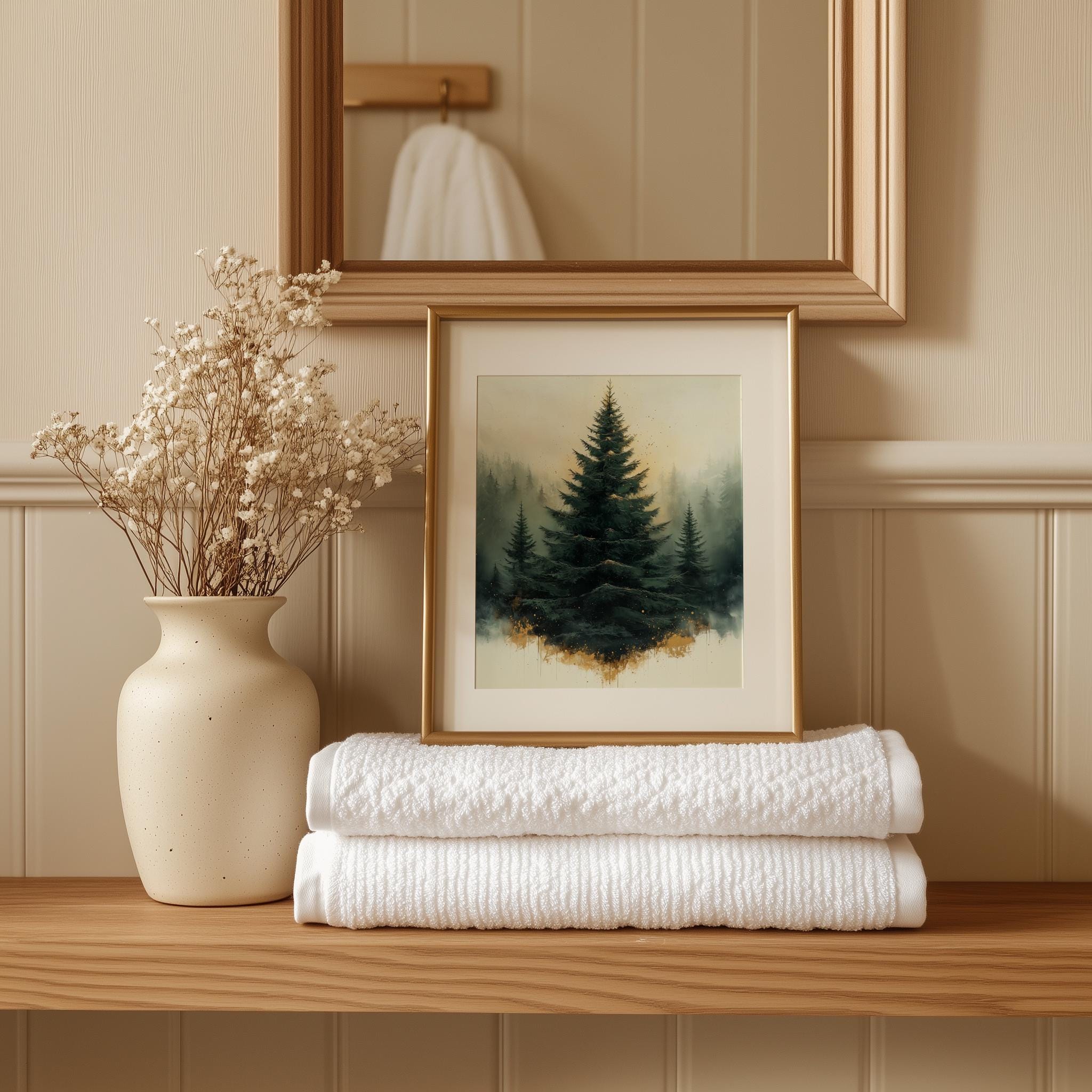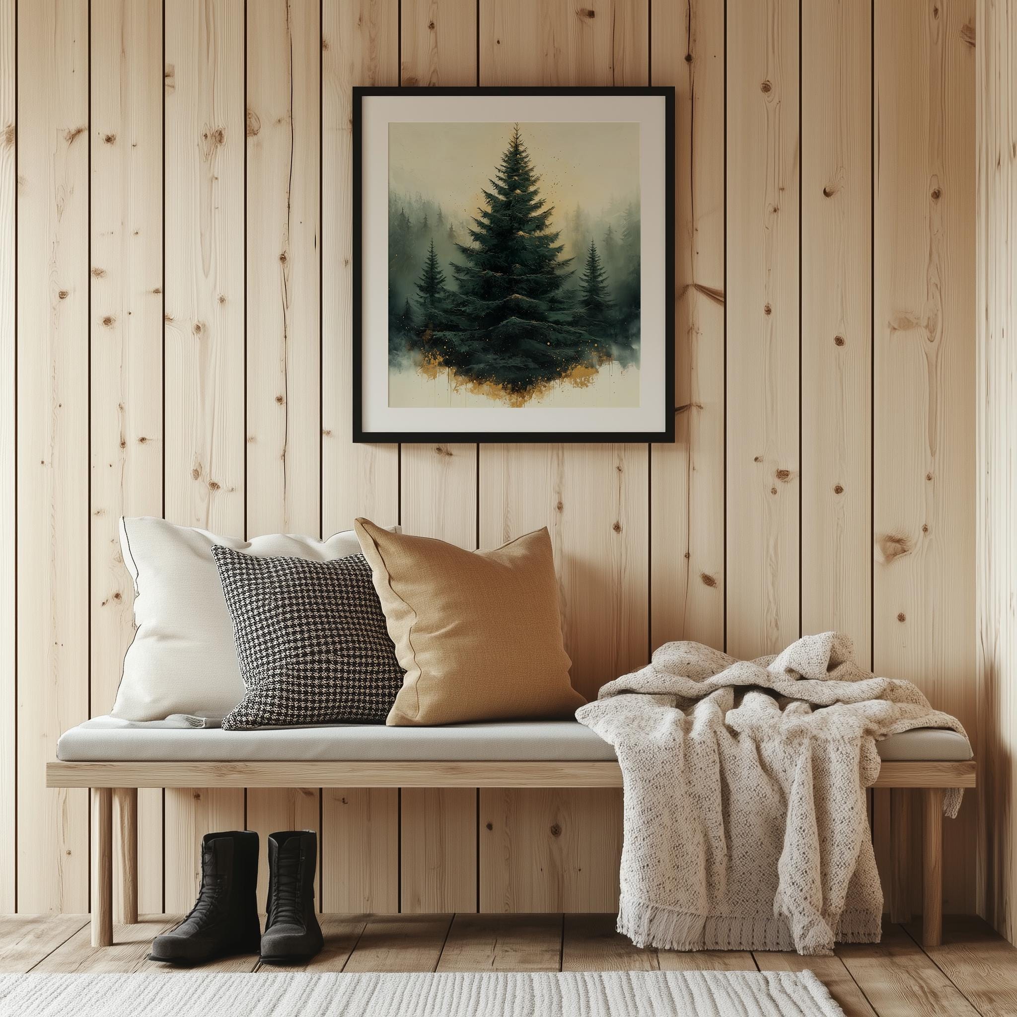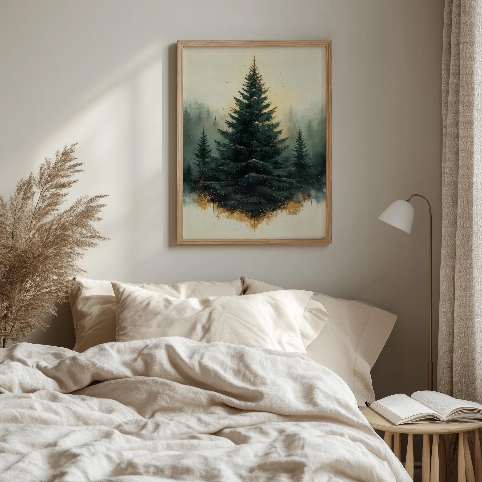 Immerse yourself in the charm of this rustic painting of a moody evergreen Christmas tree adorned with elegant gold splatters. An instantly downloadable print, it's perfect for elevating your decor with budget-friendly charm. This gives you the flexibility to customize the size, frame, and material according to your personal taste and space, ensuring a perfect fit for your walls.