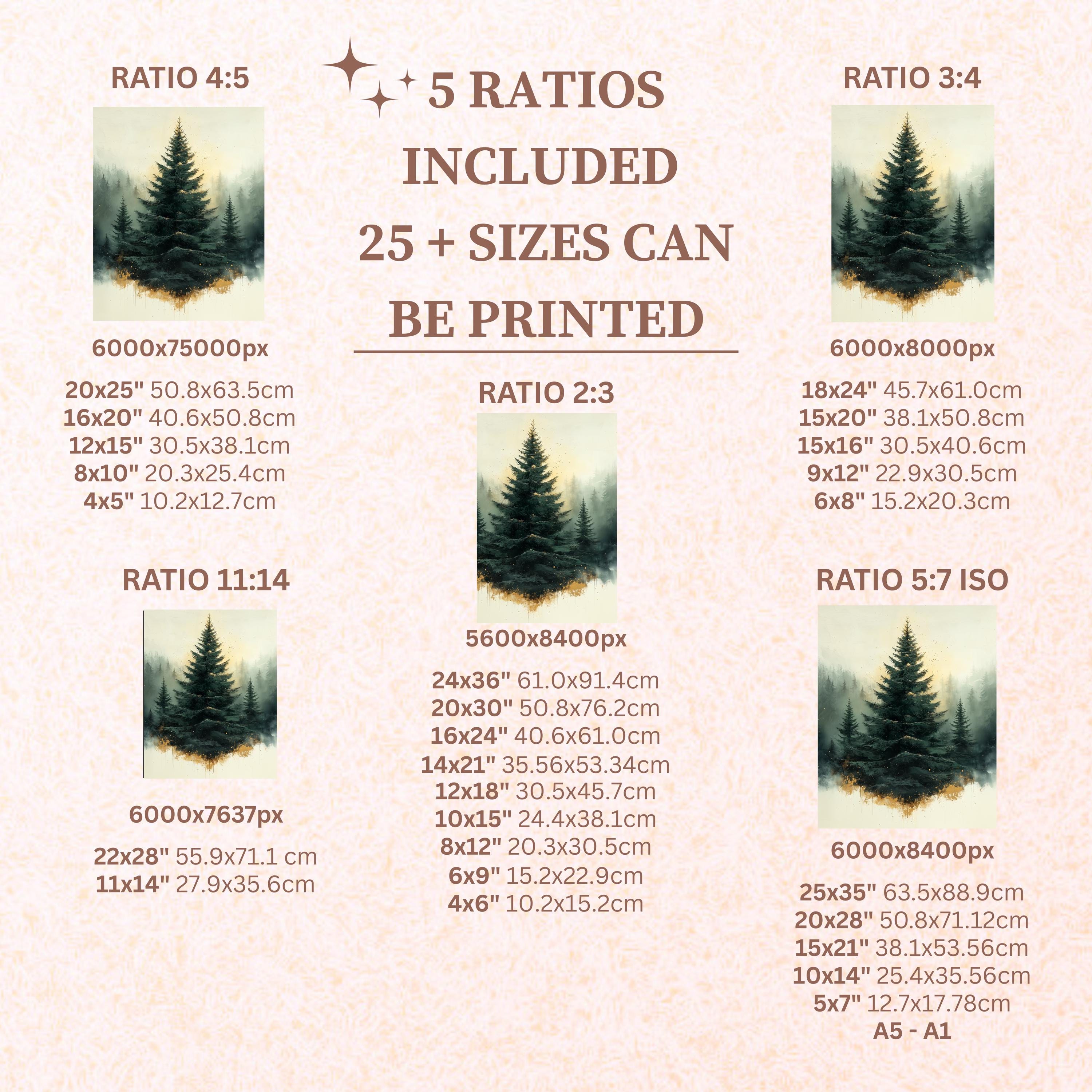 Each artwork includes 5 aspect ratios with 25+ print sizes. Most standard frames are covered. One custom resize per purchase available—message before ordering.