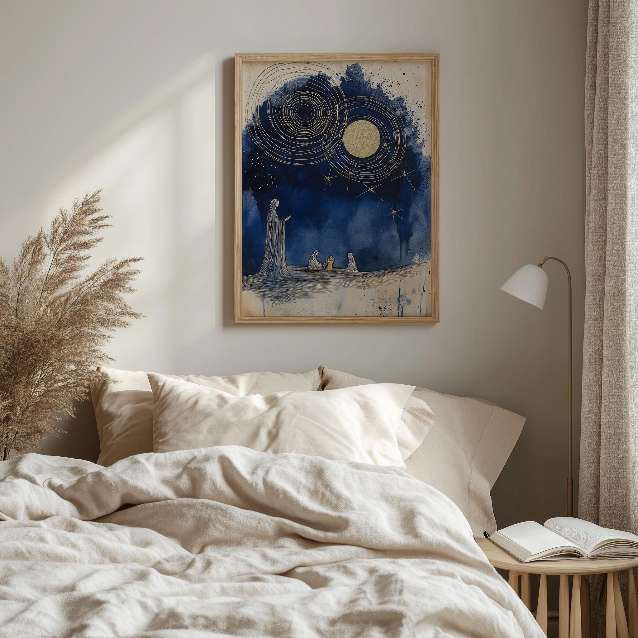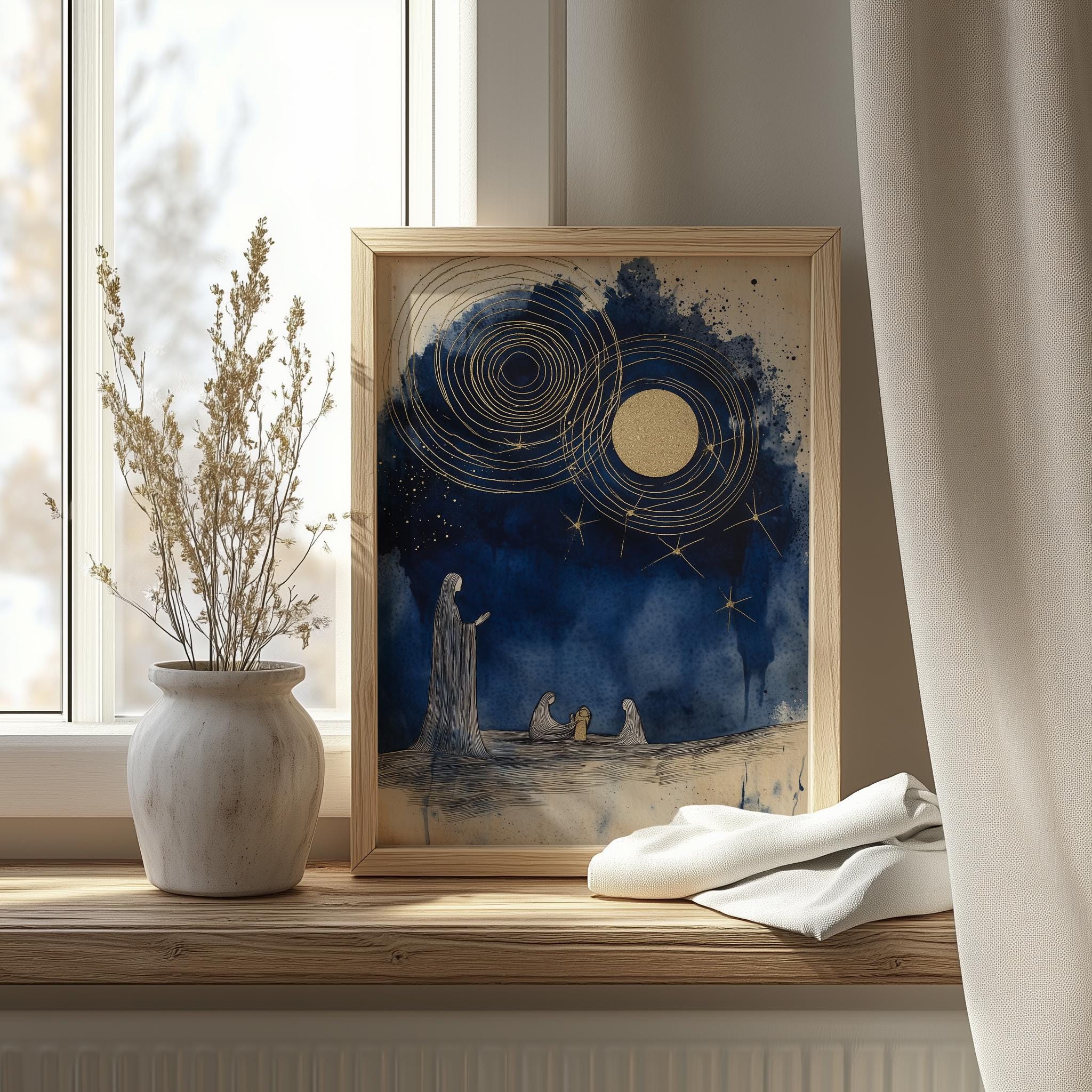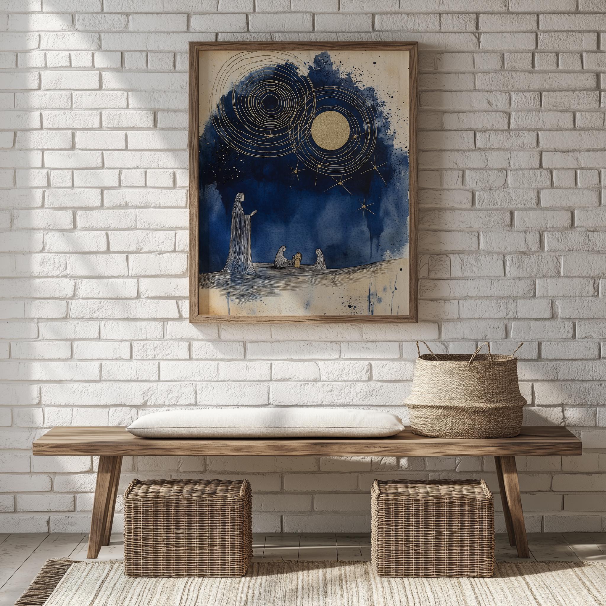 Immerse yourself in the charm of this rustic painting of a serene nativity scene featuring elegant indigo silhouettes. An instantly downloadable print, it's perfect for elevating your decor with budget-friendly charm. This gives you the flexibility to customize the size, frame, and material according to your personal taste and space, ensuring a perfect fit for your walls.