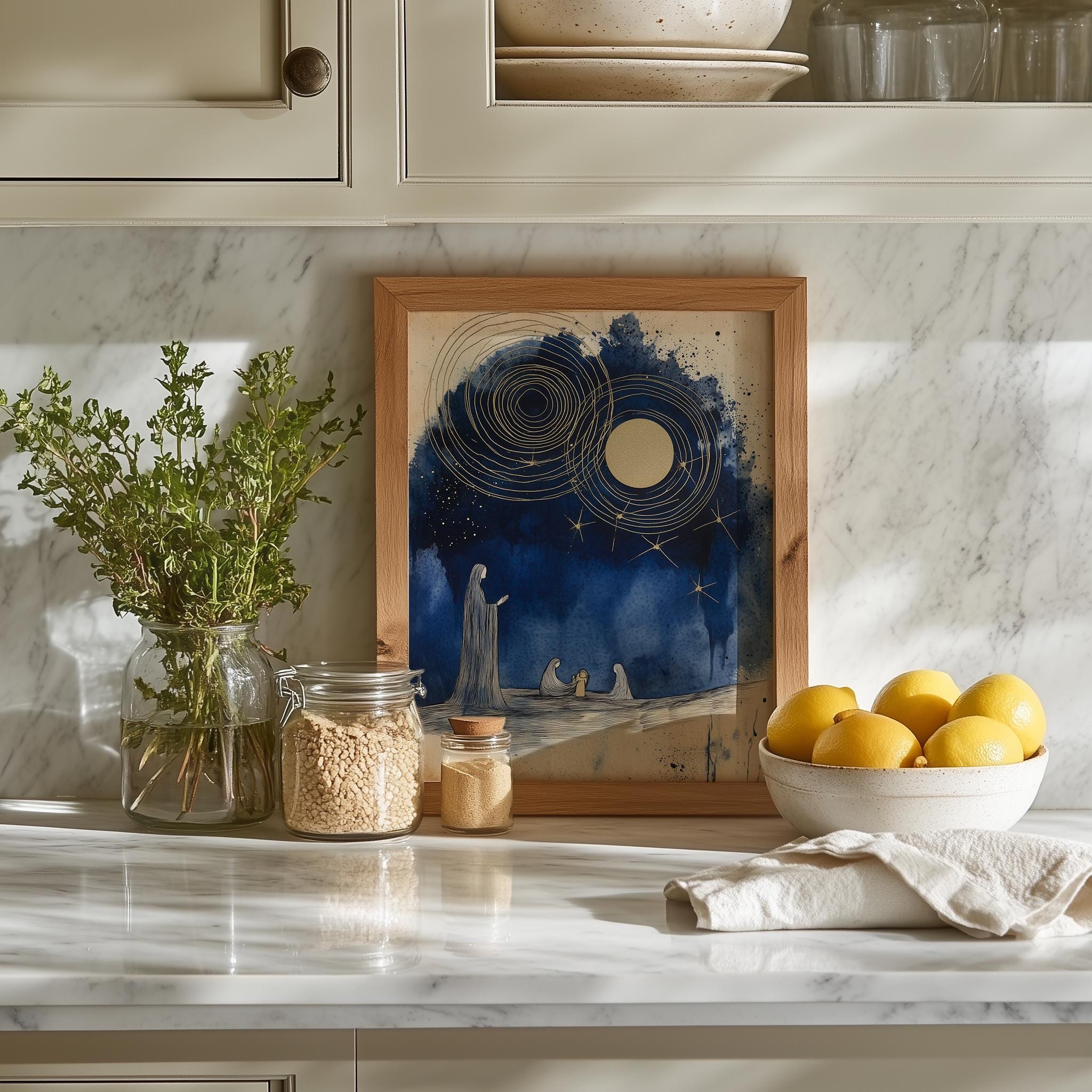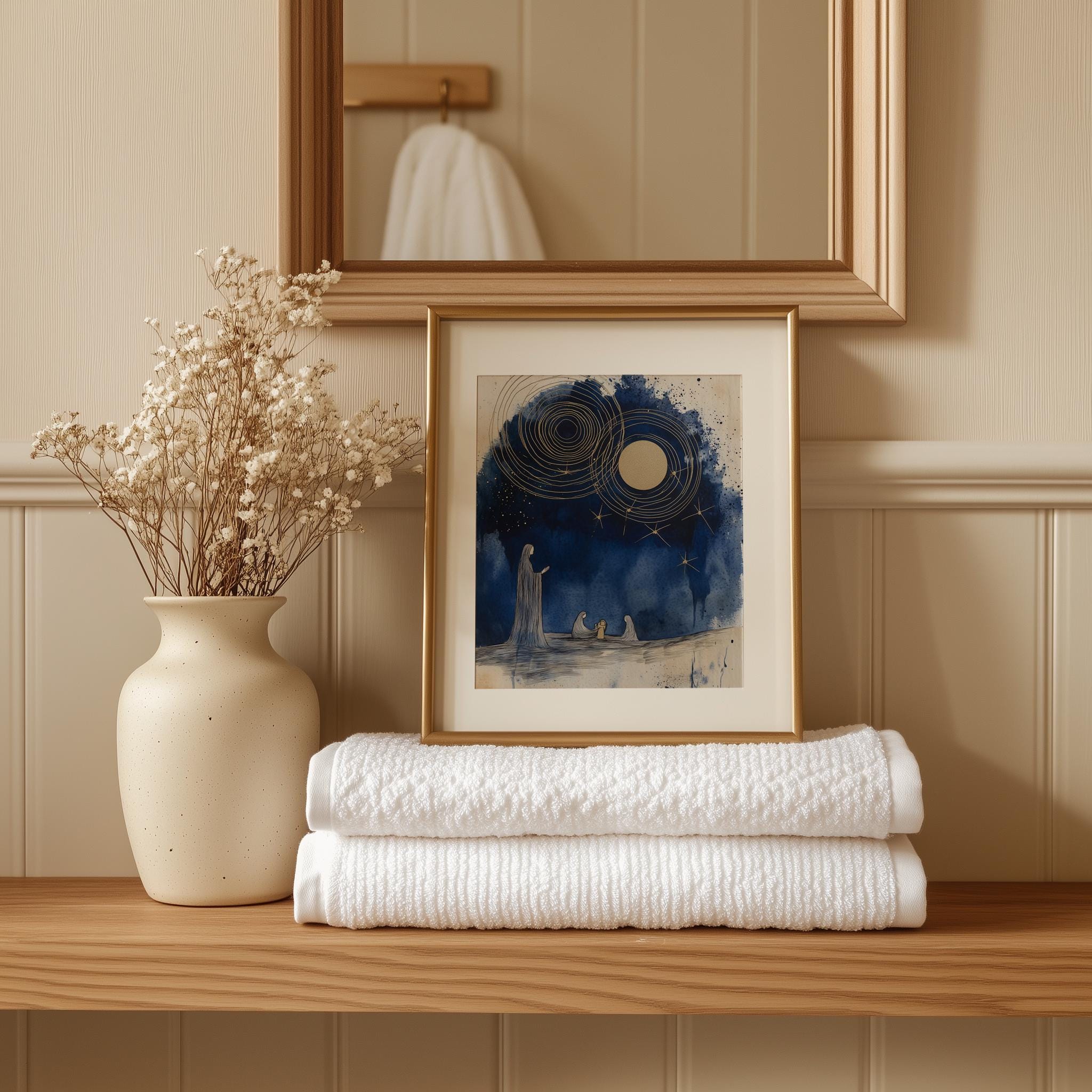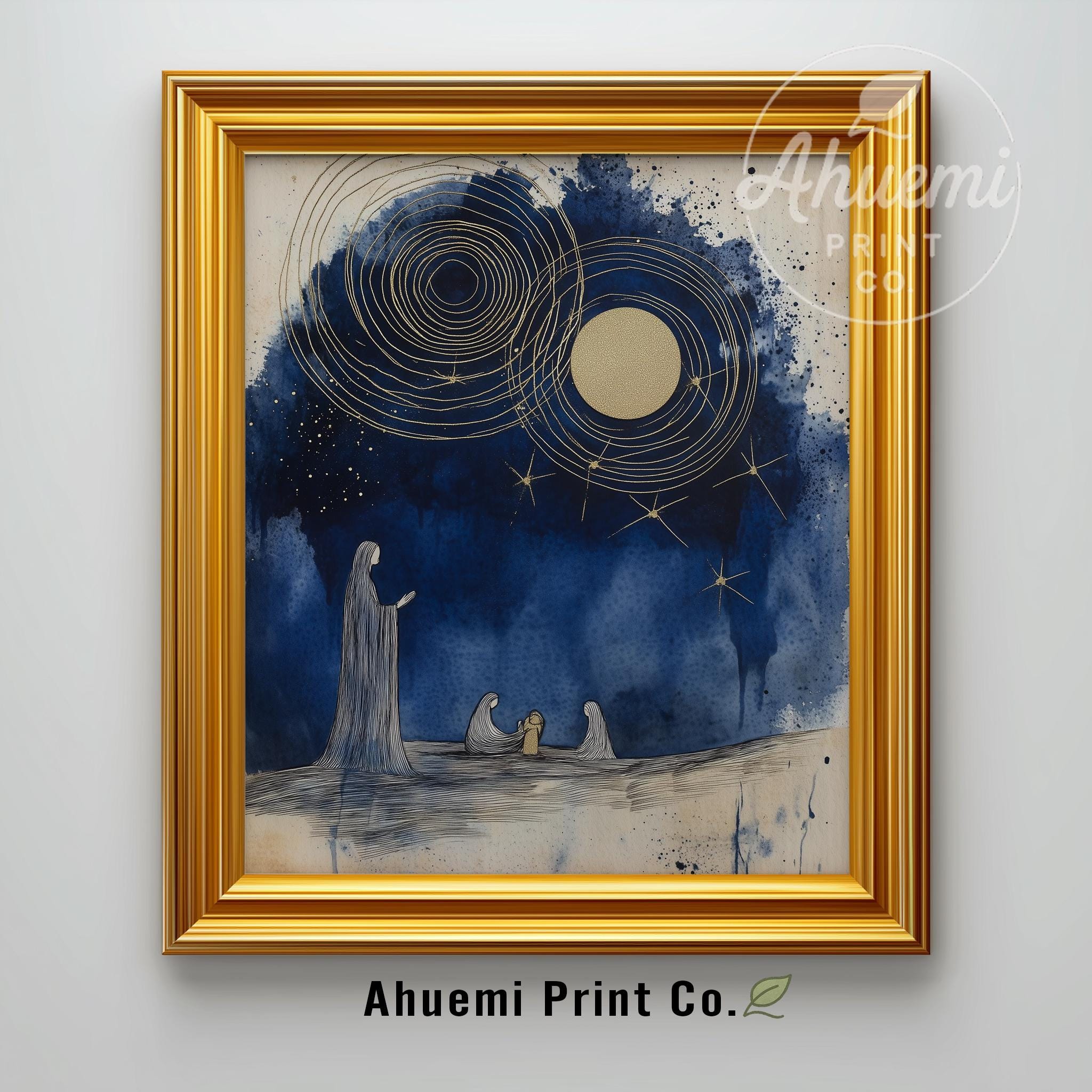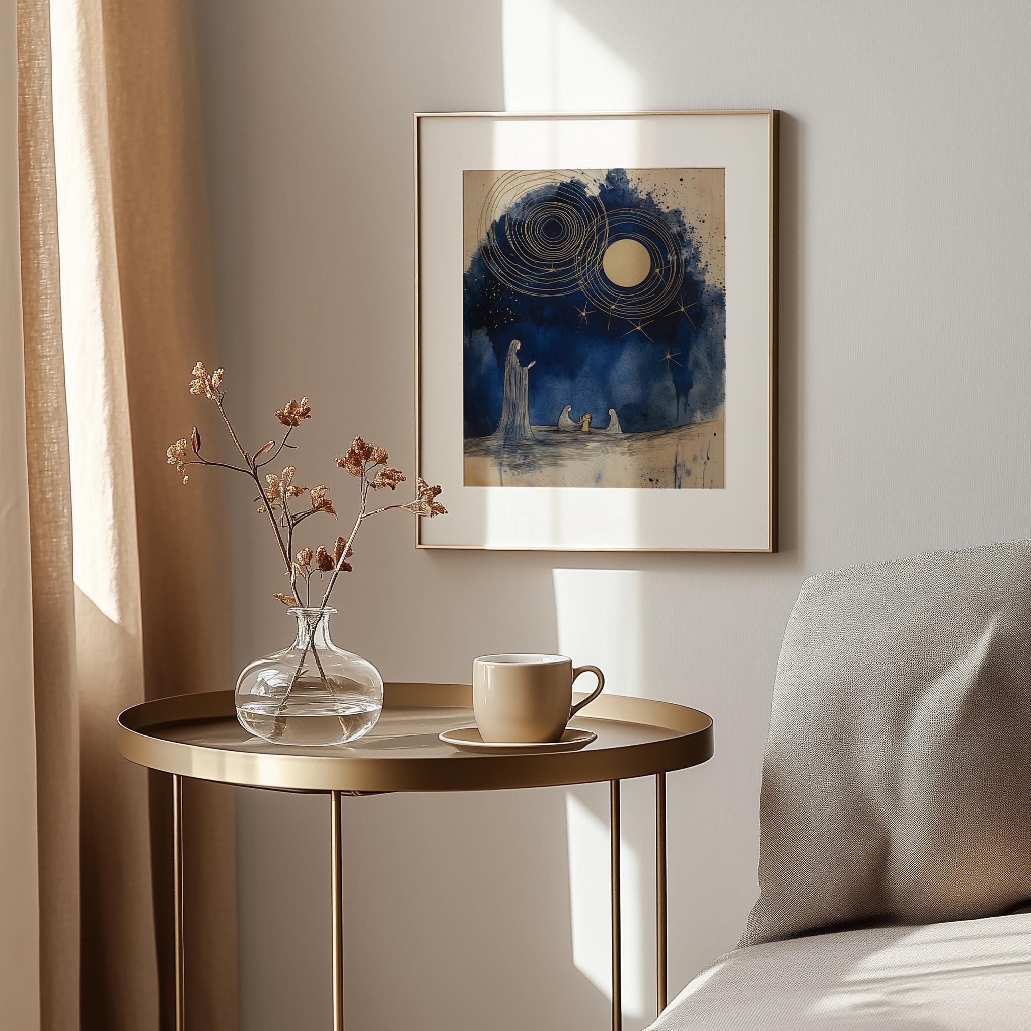 Immerse yourself in the charm of this rustic painting of a serene nativity scene featuring elegant indigo silhouettes. An instantly downloadable print, it's perfect for elevating your decor with budget-friendly charm. This gives you the flexibility to customize the size, frame, and material according to your personal taste and space, ensuring a perfect fit for your walls.