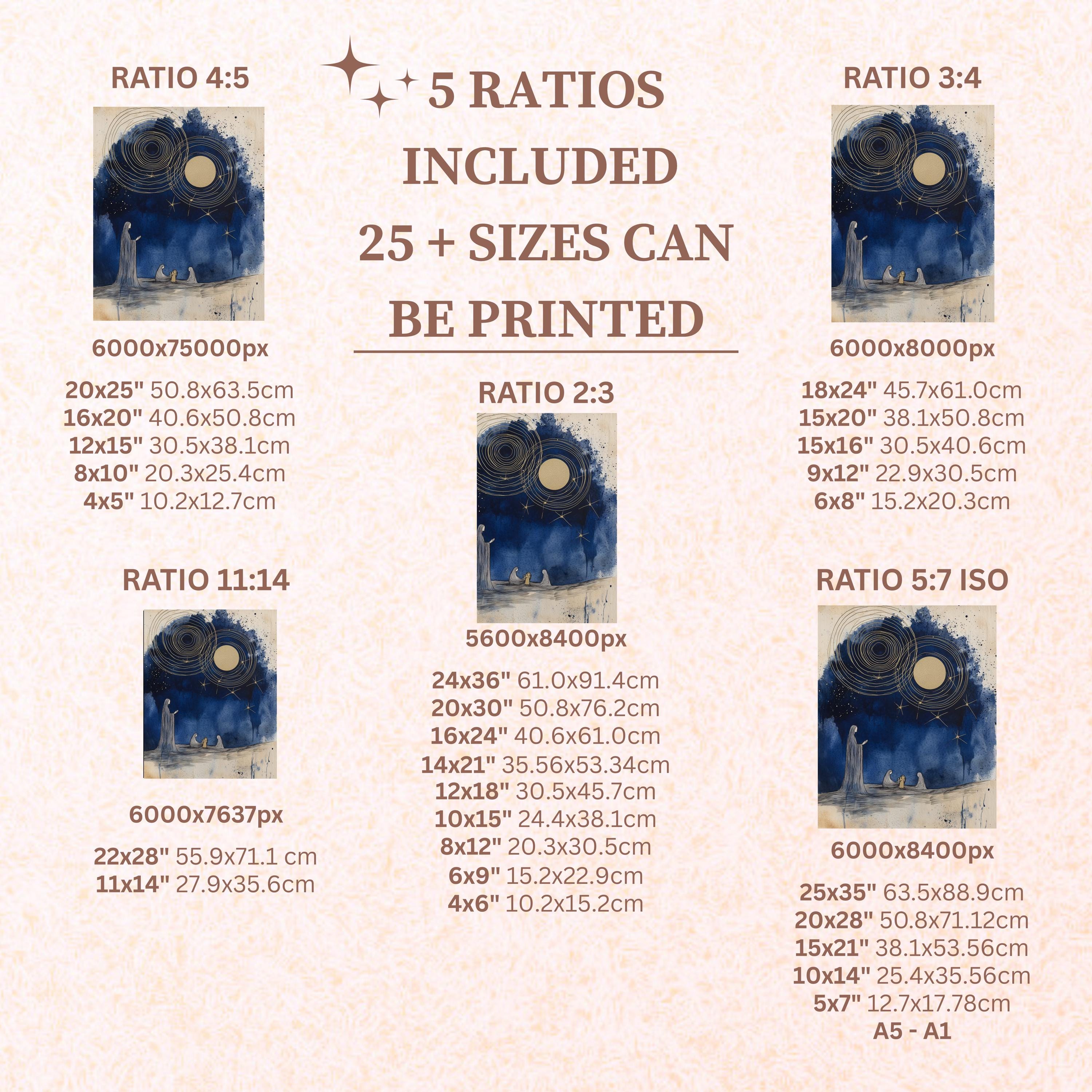 Each artwork includes 5 aspect ratios with 25+ print sizes. Most standard frames are covered. One custom resize per purchase available—message before ordering.