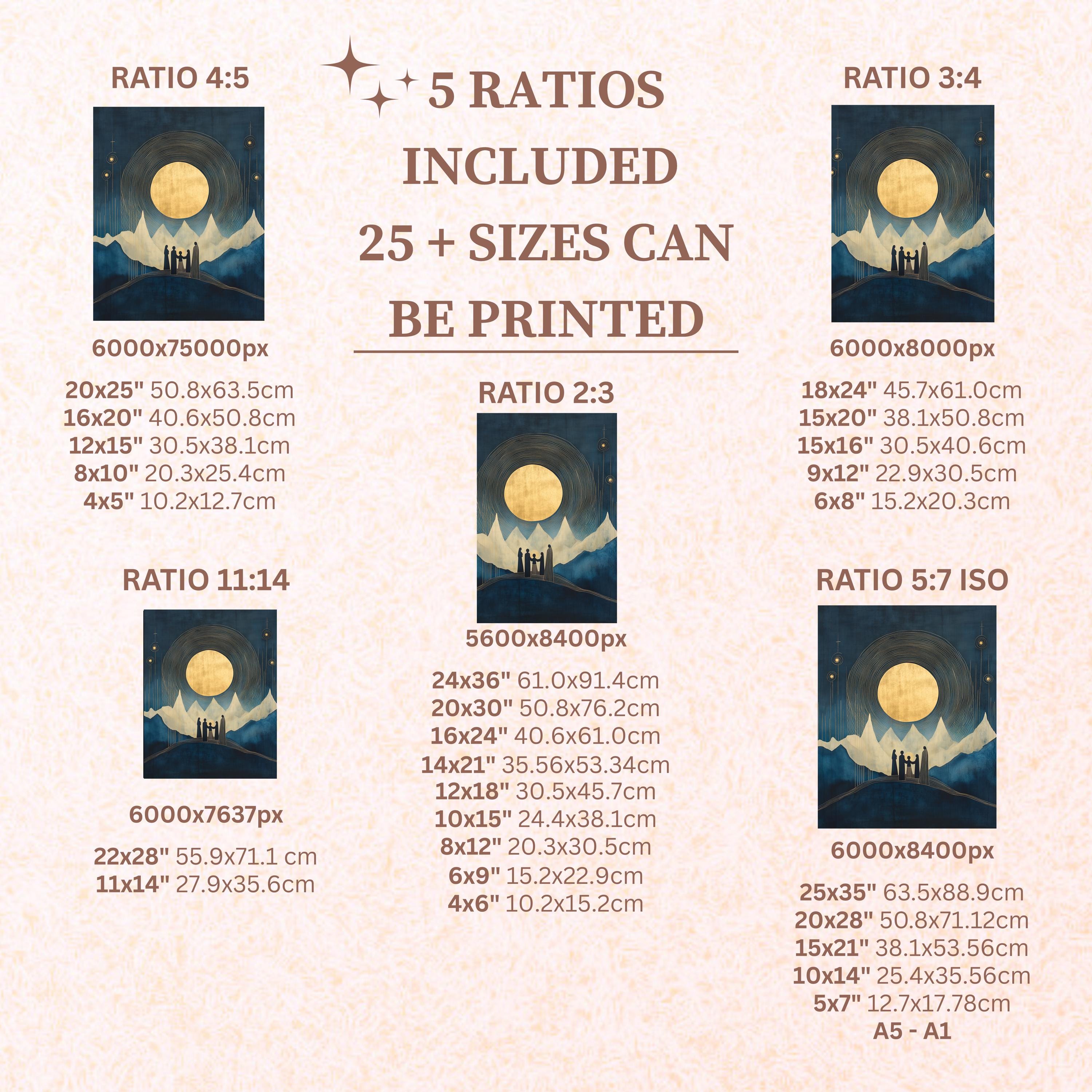 Each artwork includes 5 aspect ratios with 25+ print sizes. Most standard frames are covered. One custom resize per purchase available—message before ordering.