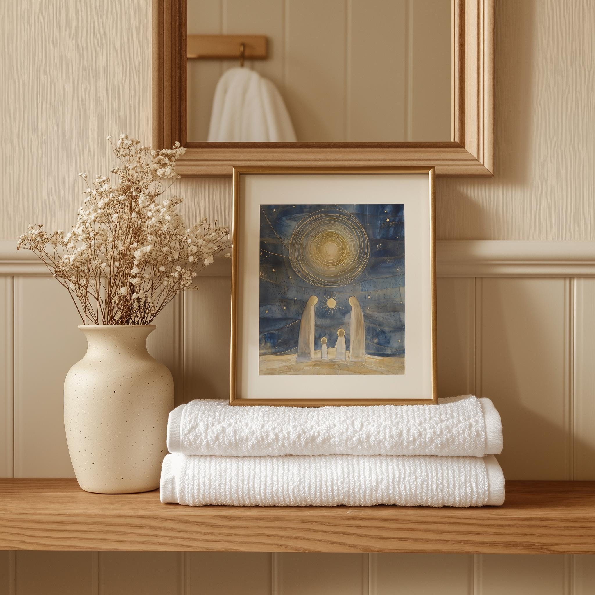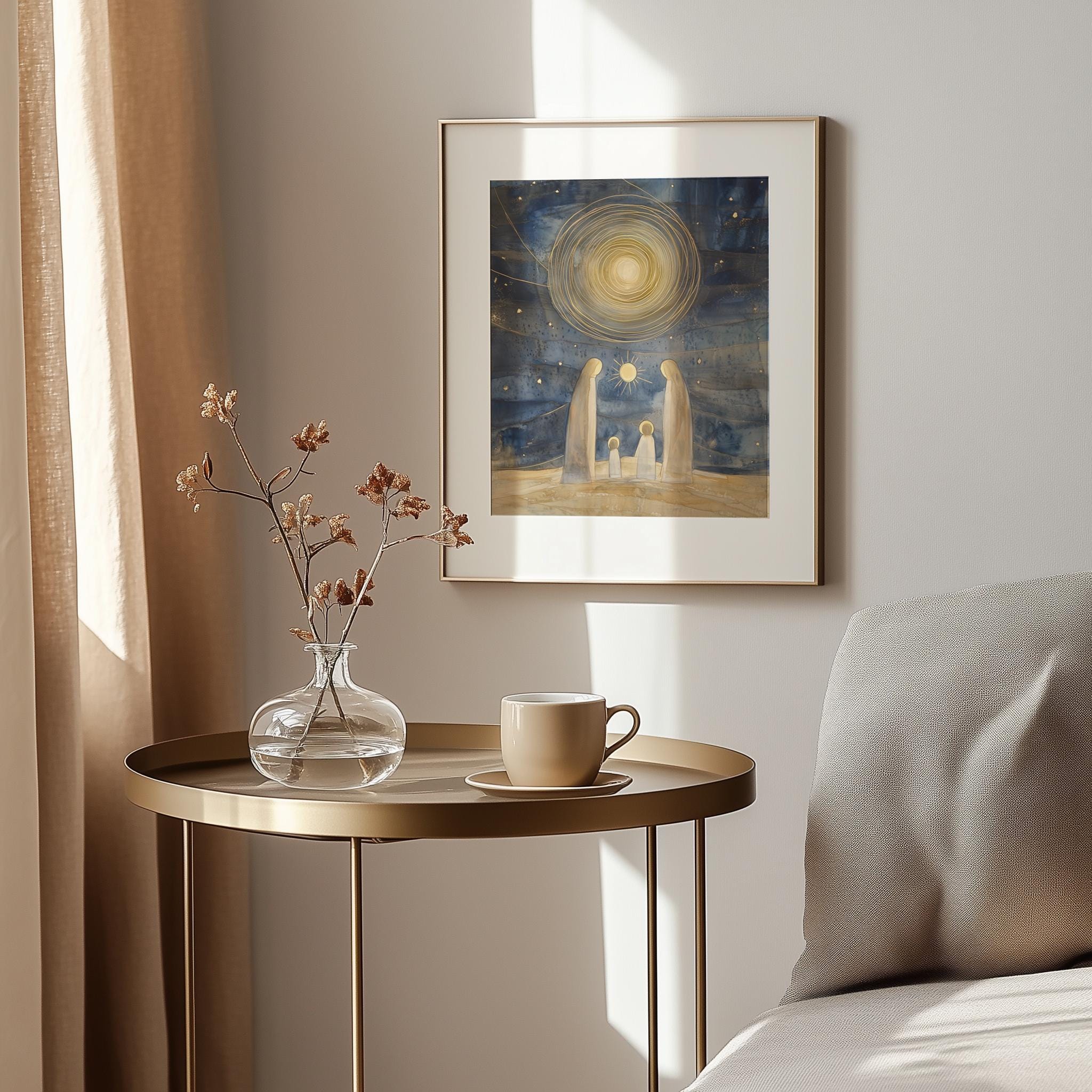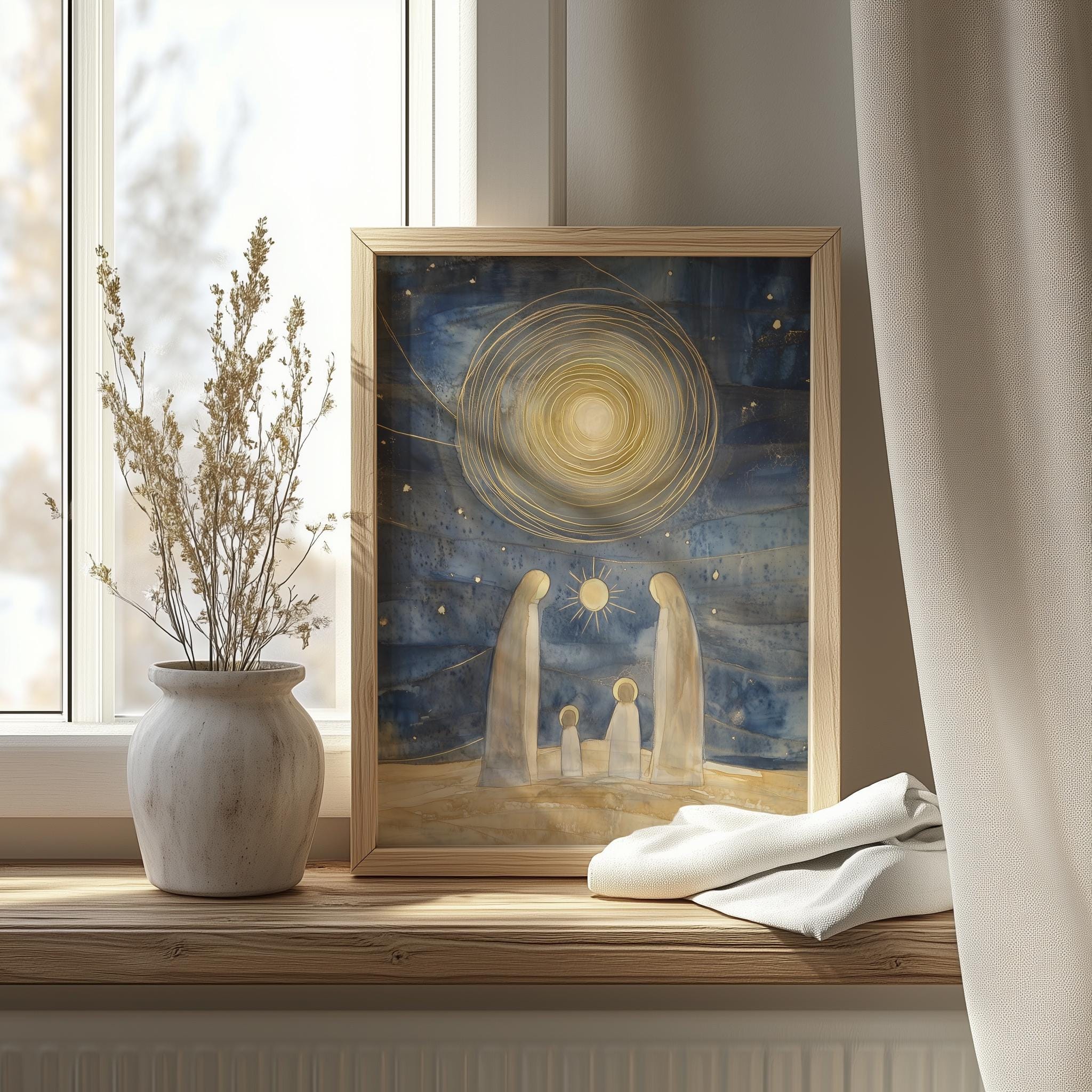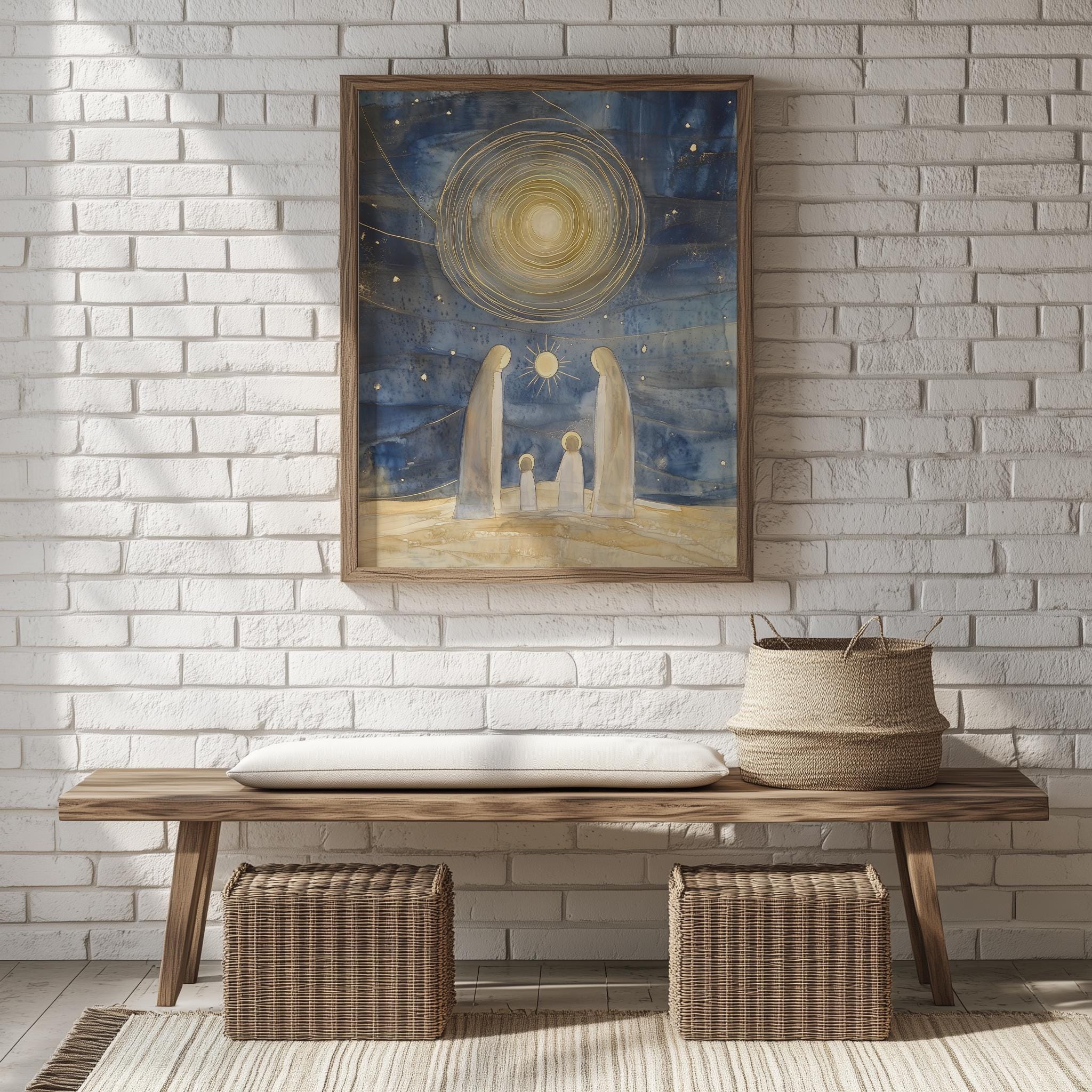 Immerse yourself in the charm of this rustic painting of a serene nativity scene illuminated by a radiant star. An instantly downloadable print, it's perfect for elevating your decor with budget-friendly charm. This gives you the flexibility to customize the size, frame, and material according to your personal taste and space, ensuring a perfect fit for your walls.