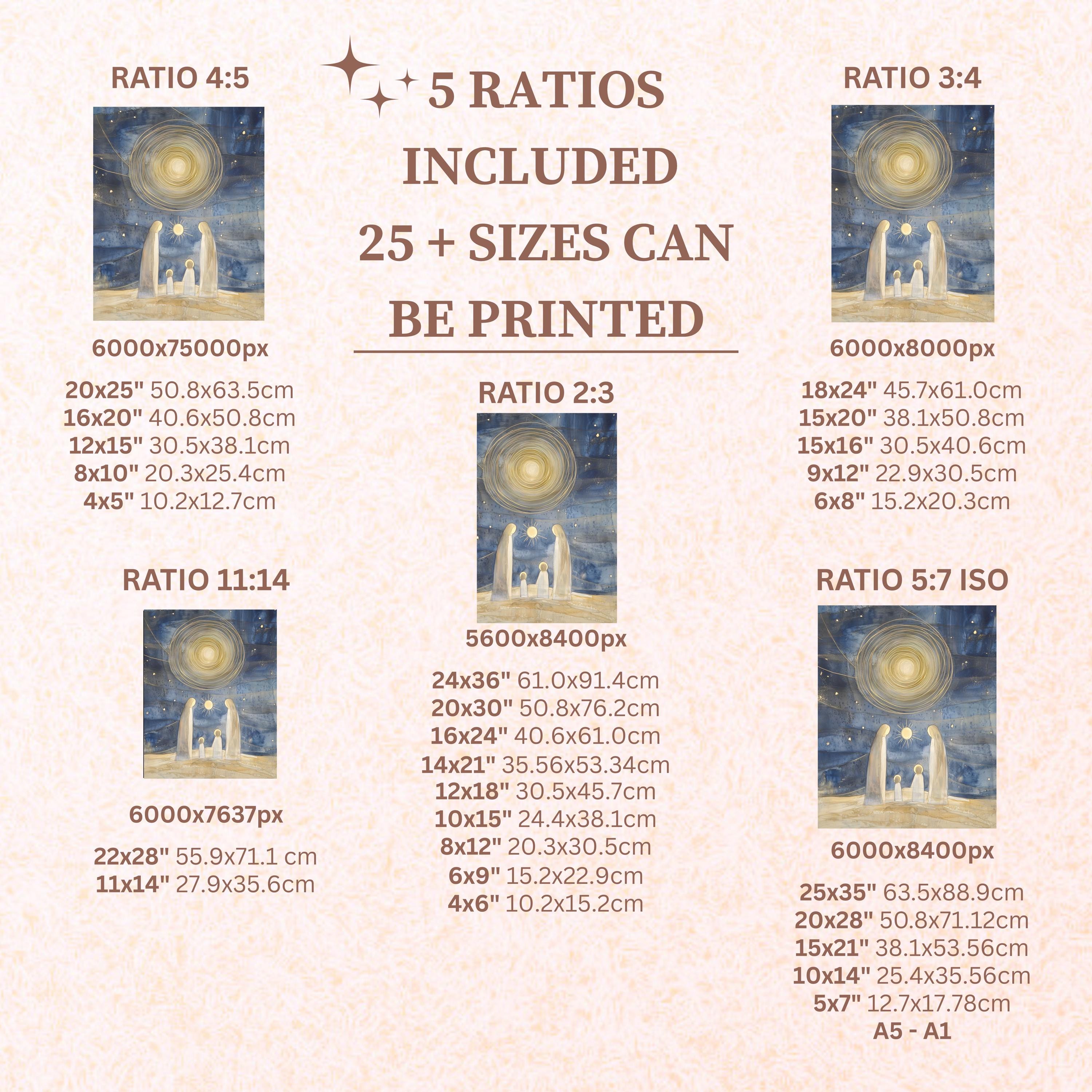 Each artwork includes 5 aspect ratios with 25+ print sizes. Most standard frames are covered. One custom resize per purchase available—message before ordering.