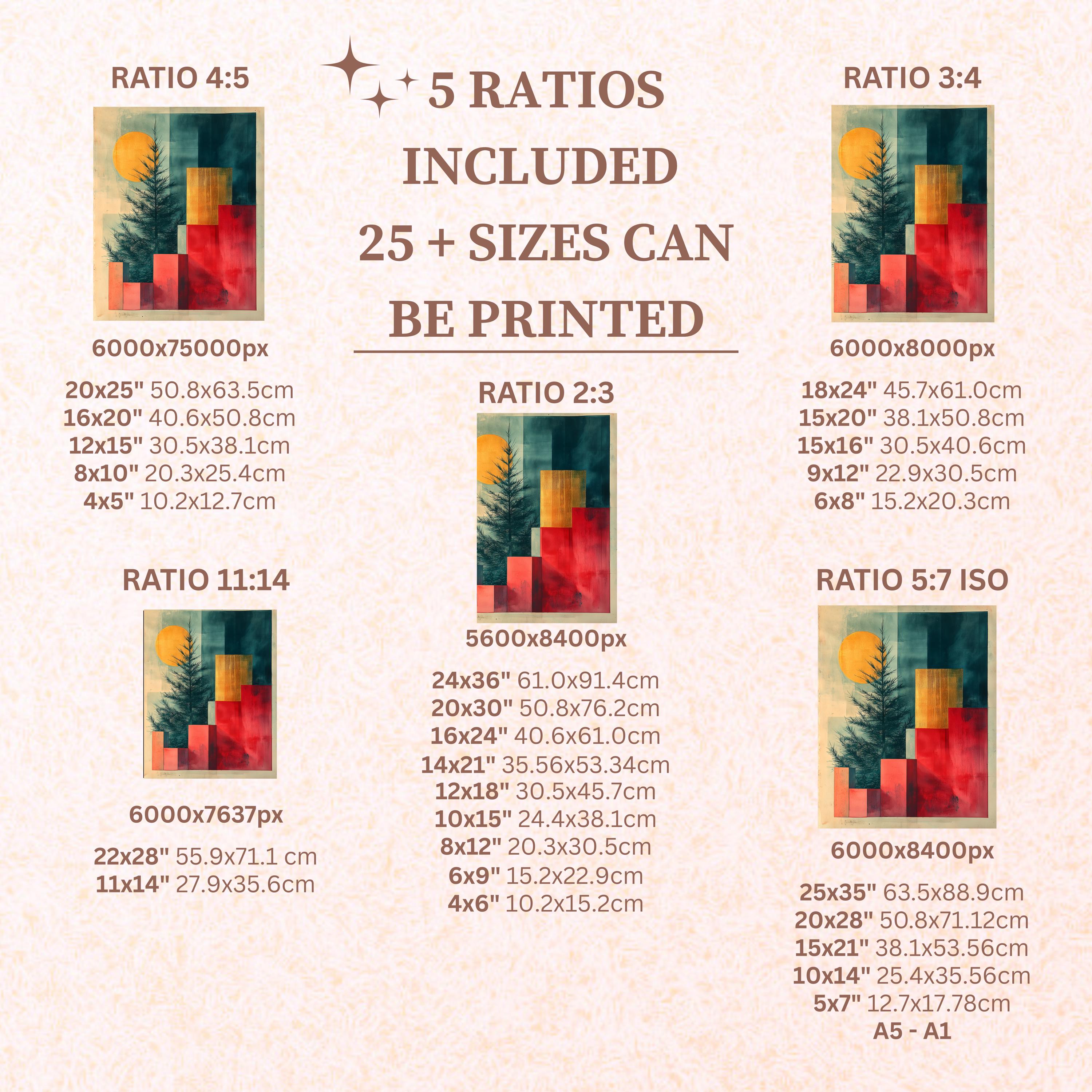 Each artwork includes 5 aspect ratios with 25+ print sizes. Most standard frames are covered. One custom resize per purchase available—message before ordering.