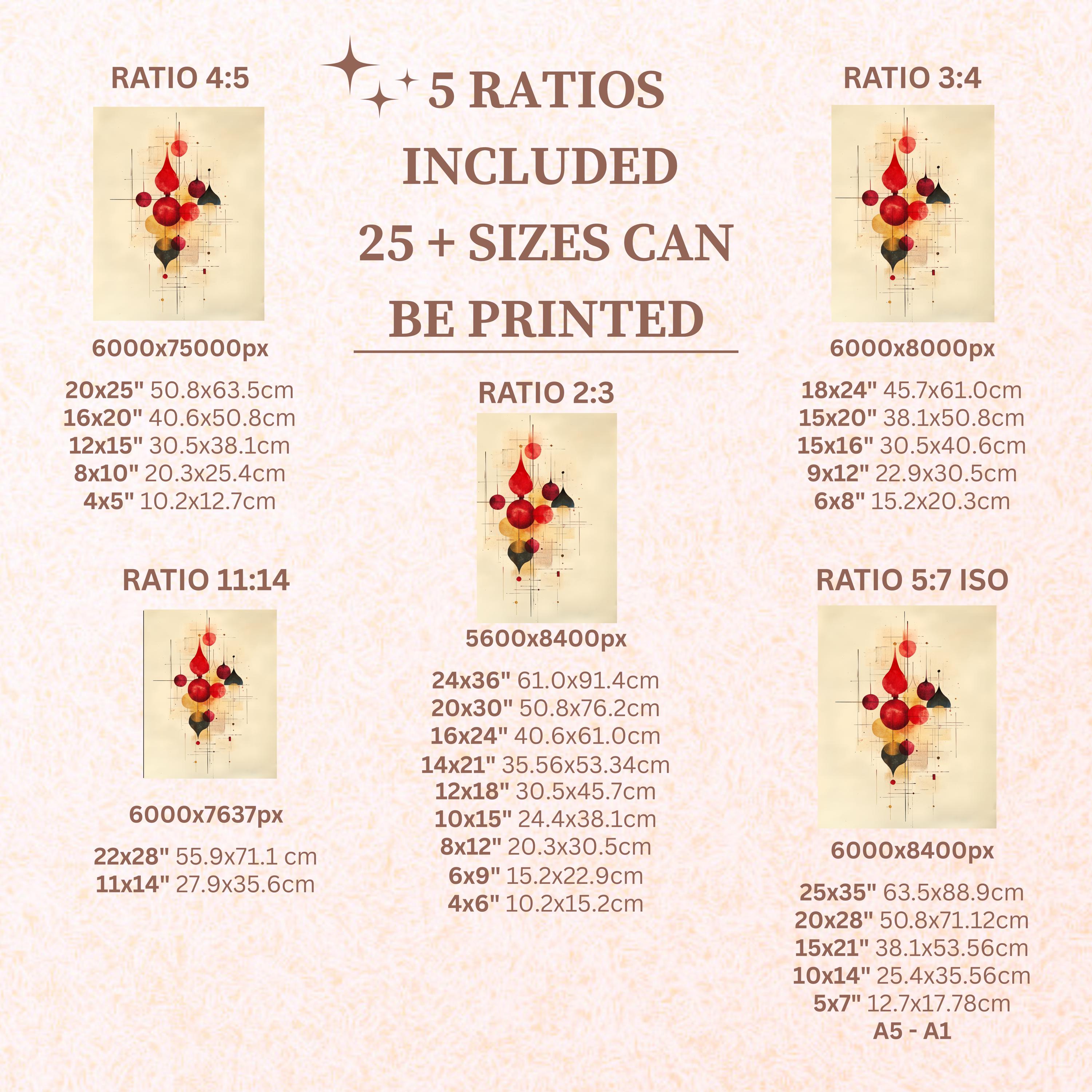 With your purchase, you’ll receive 5 high-resolution JPG files (300 DPI), each designed to print beautifully in 25+ different sizes. These files are grouped into common aspect ratios so you can print and frame your art however you like: