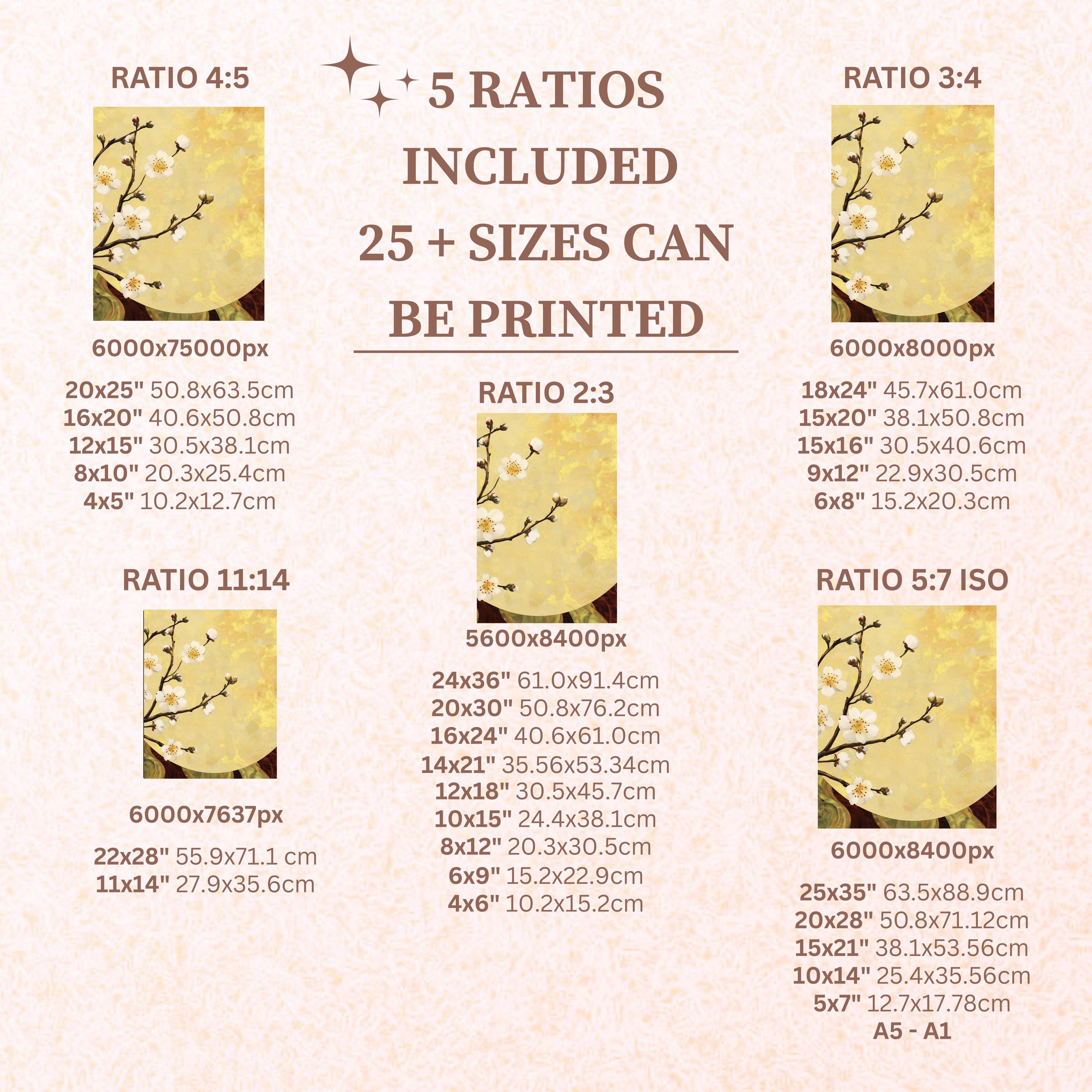 Each artwork includes 5 aspect ratios with 25+ print sizes. Most standard frames are covered. One custom resize per purchase available—message before ordering.