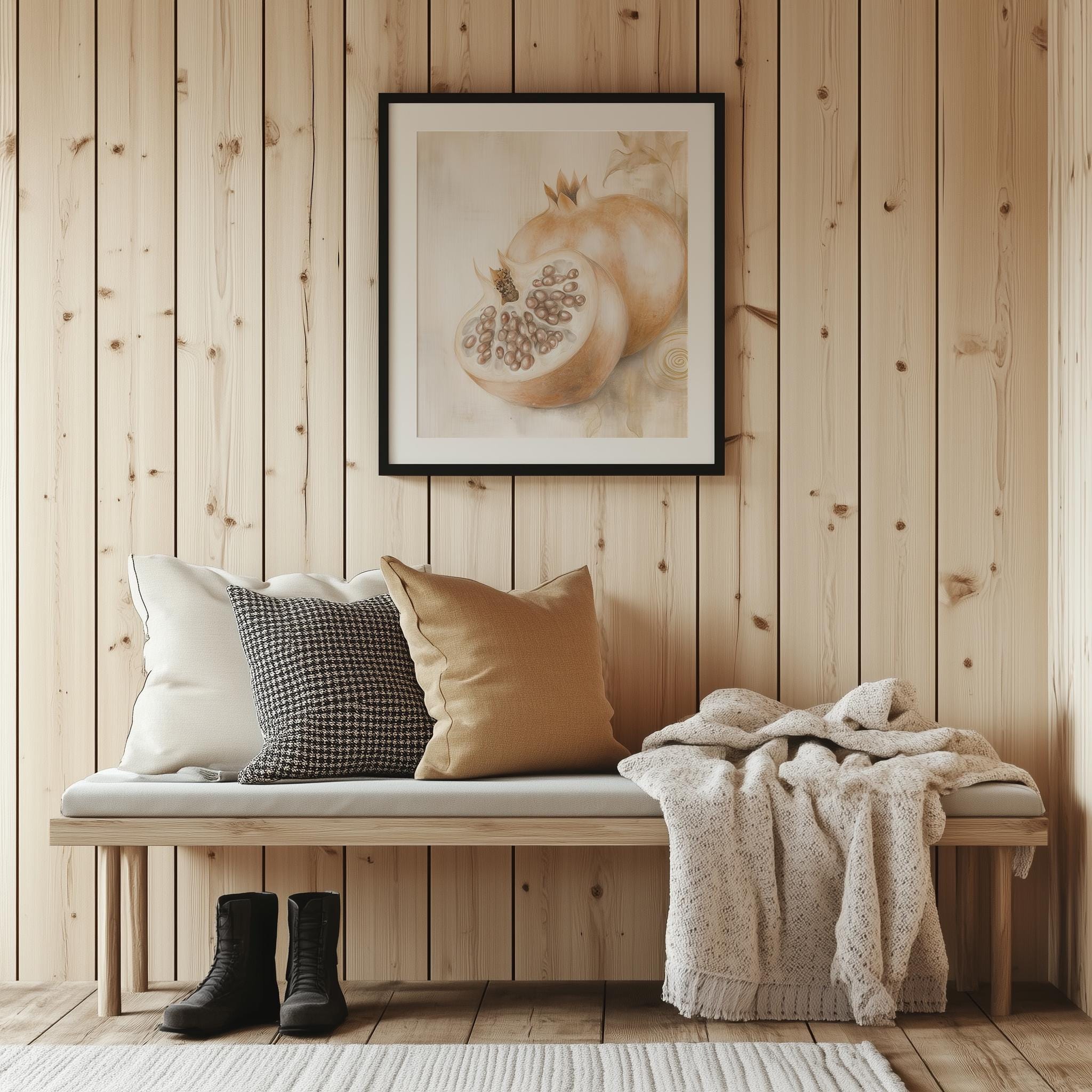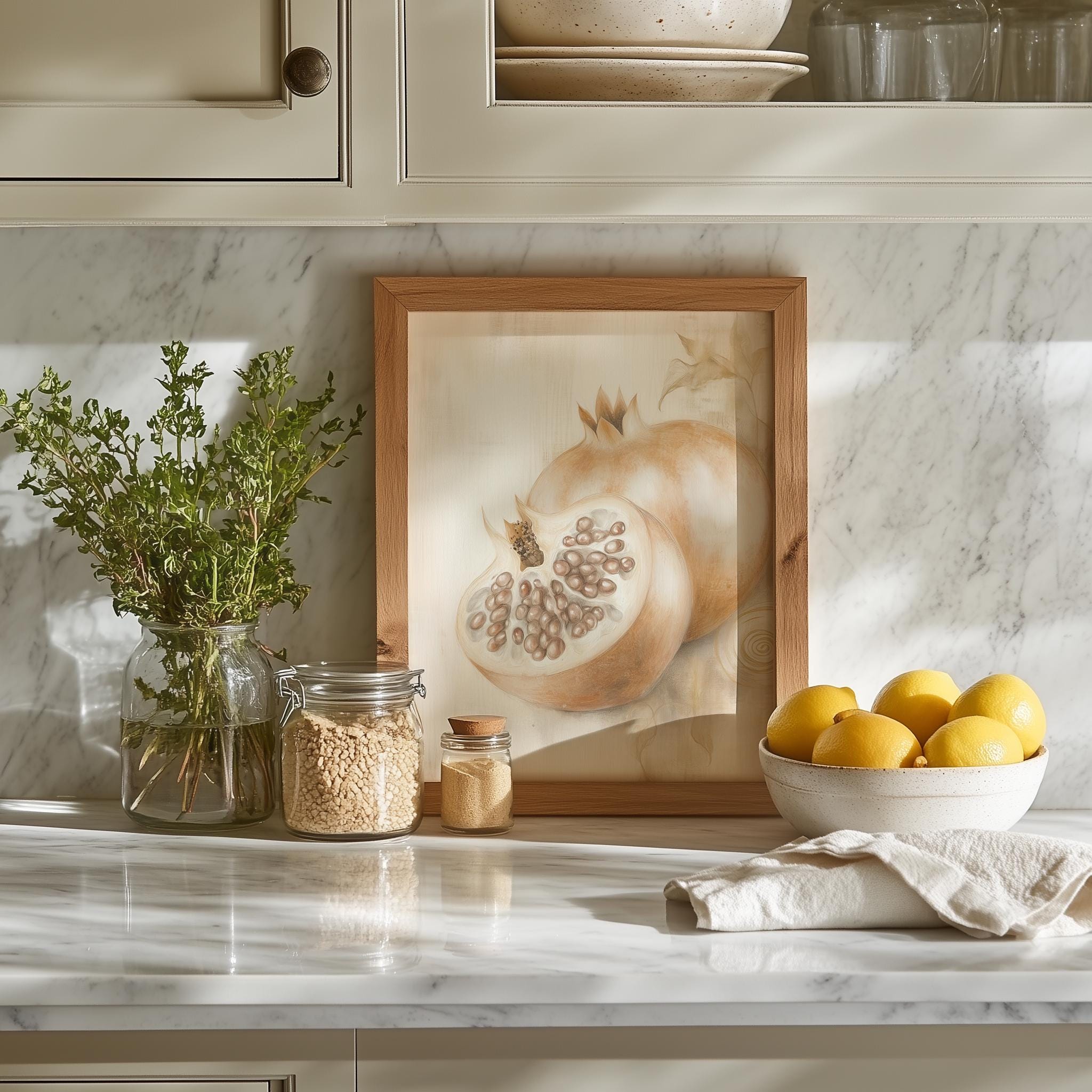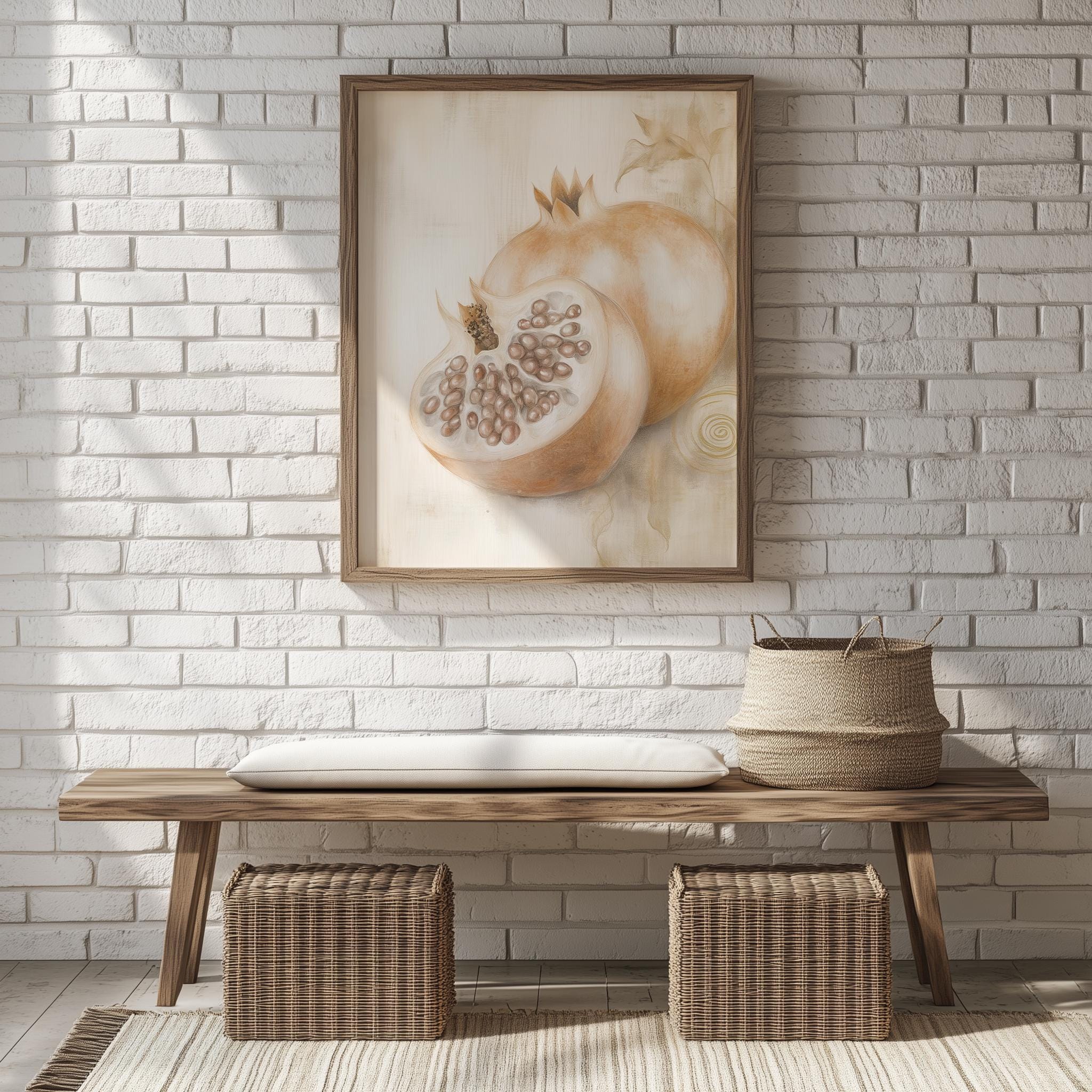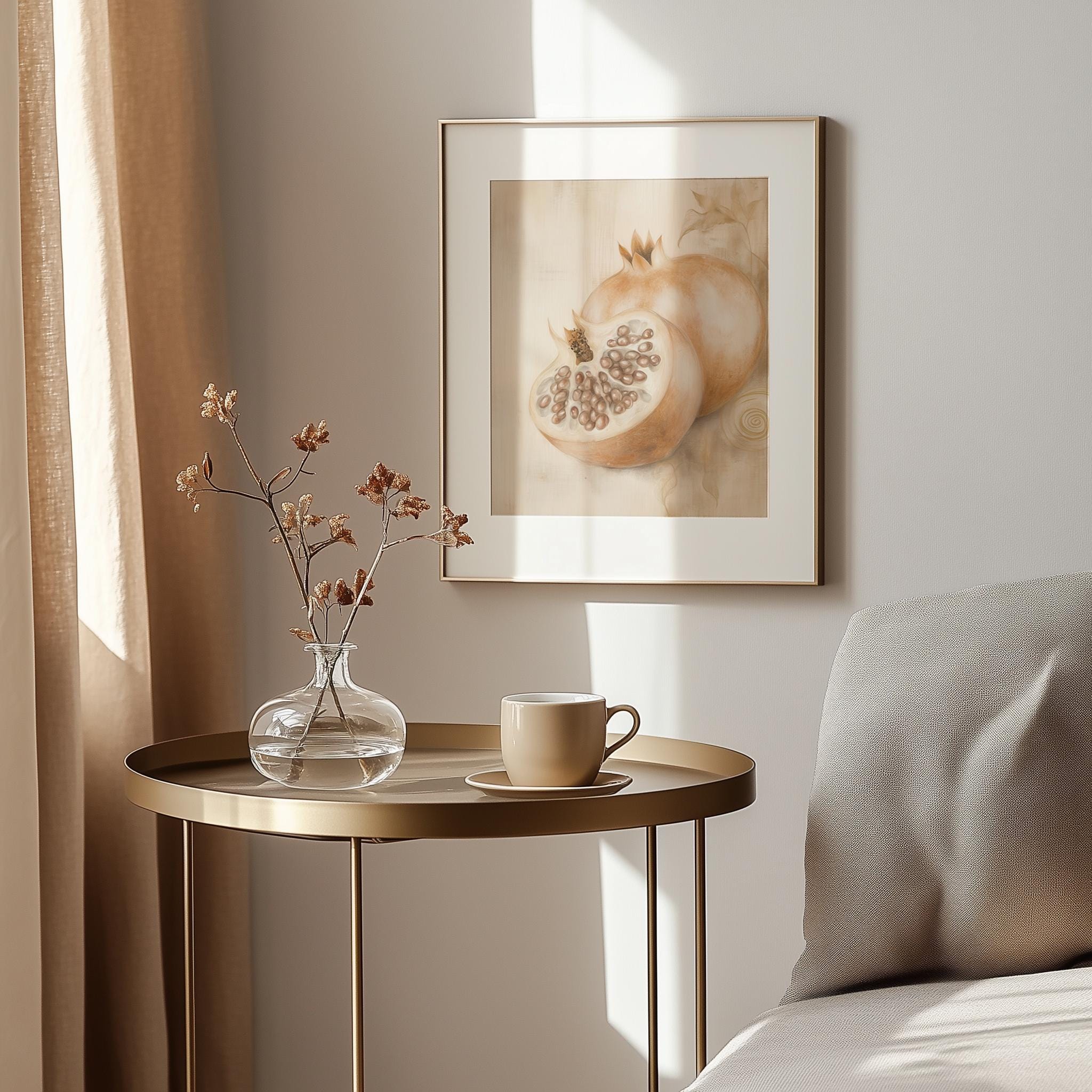 Immerse yourself in the charm of this rustic painting of a beautifully detailed sliced pomegranate. An instantly downloadable print, it's perfect for elevating your decor with budget-friendly charm. This gives you the flexibility to customize the size, frame, and material according to your personal taste and space, ensuring a perfect fit for your walls.