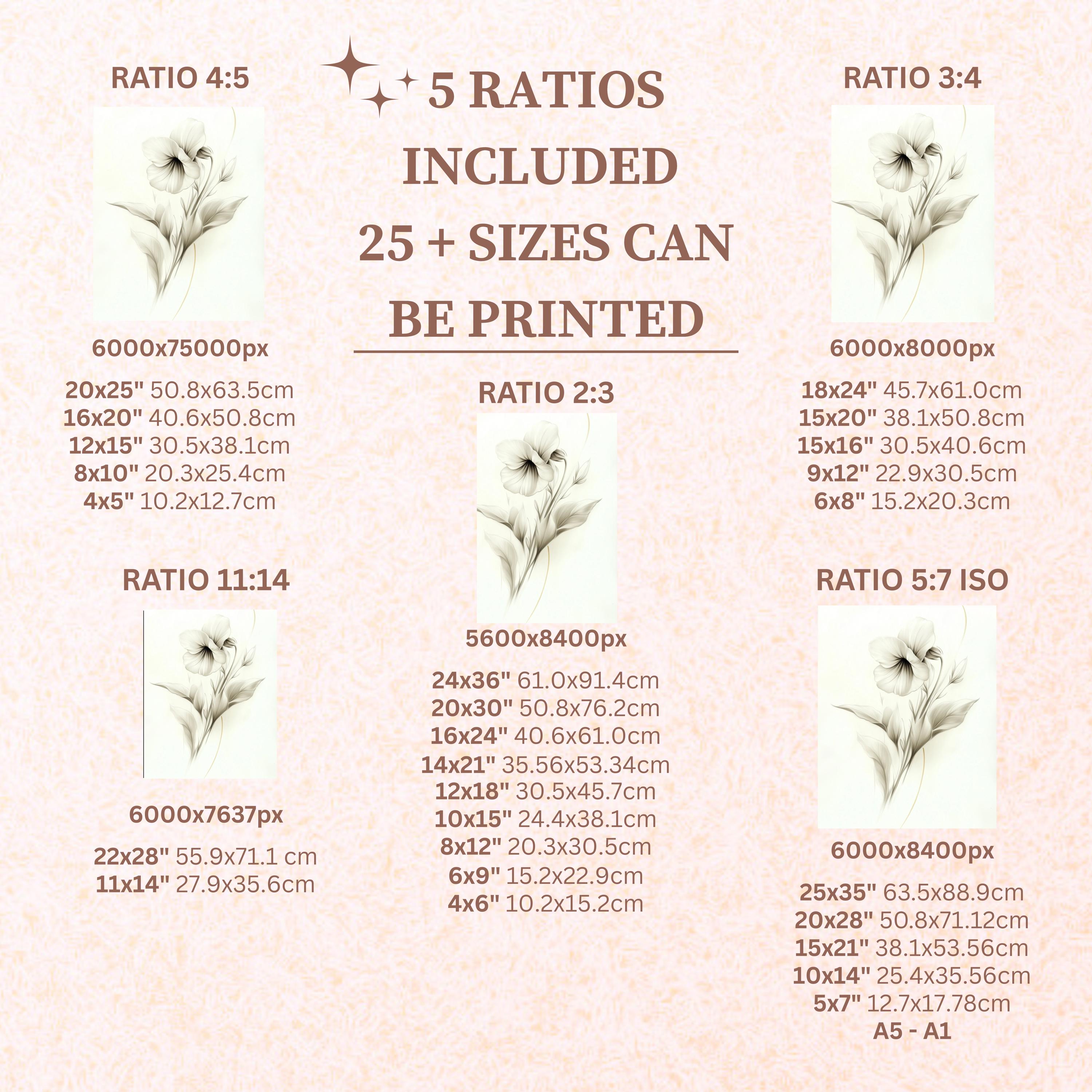 Each artwork includes 5 aspect ratios with 25+ print sizes. Most standard frames are covered. One custom resize per purchase available—message before ordering.
