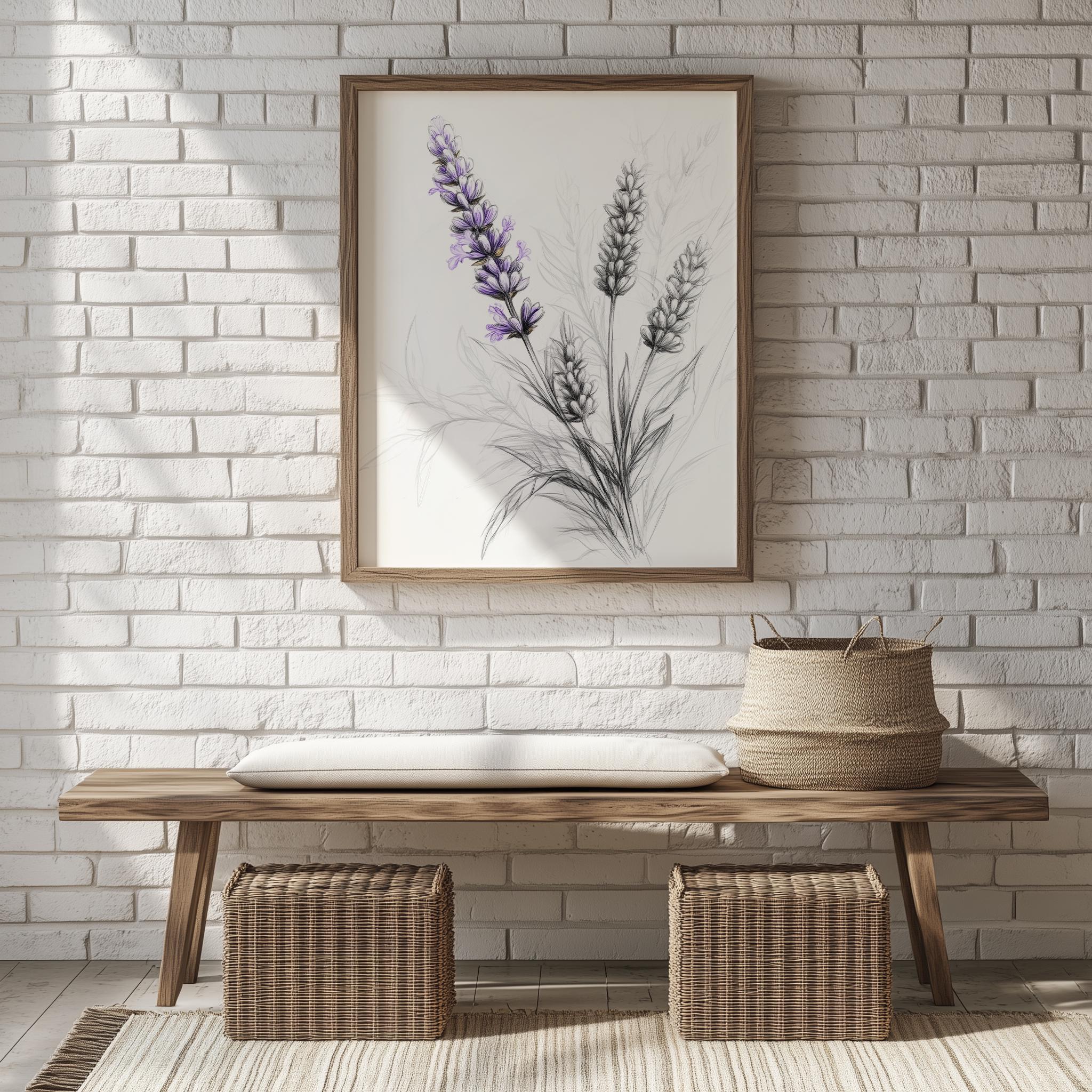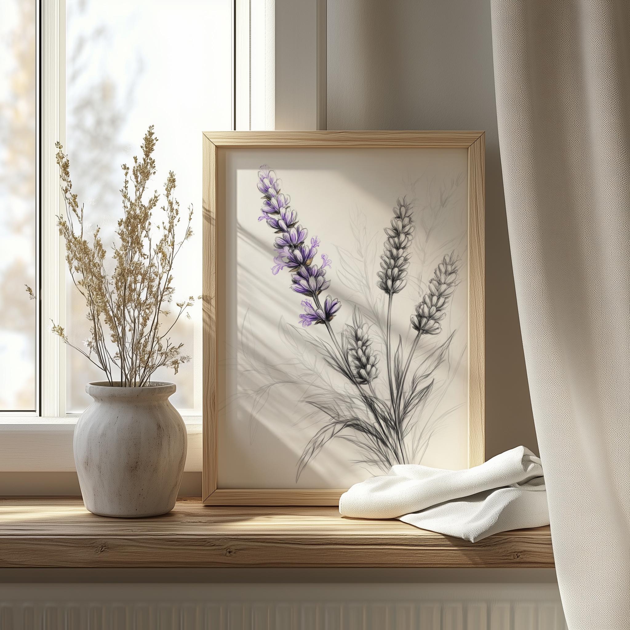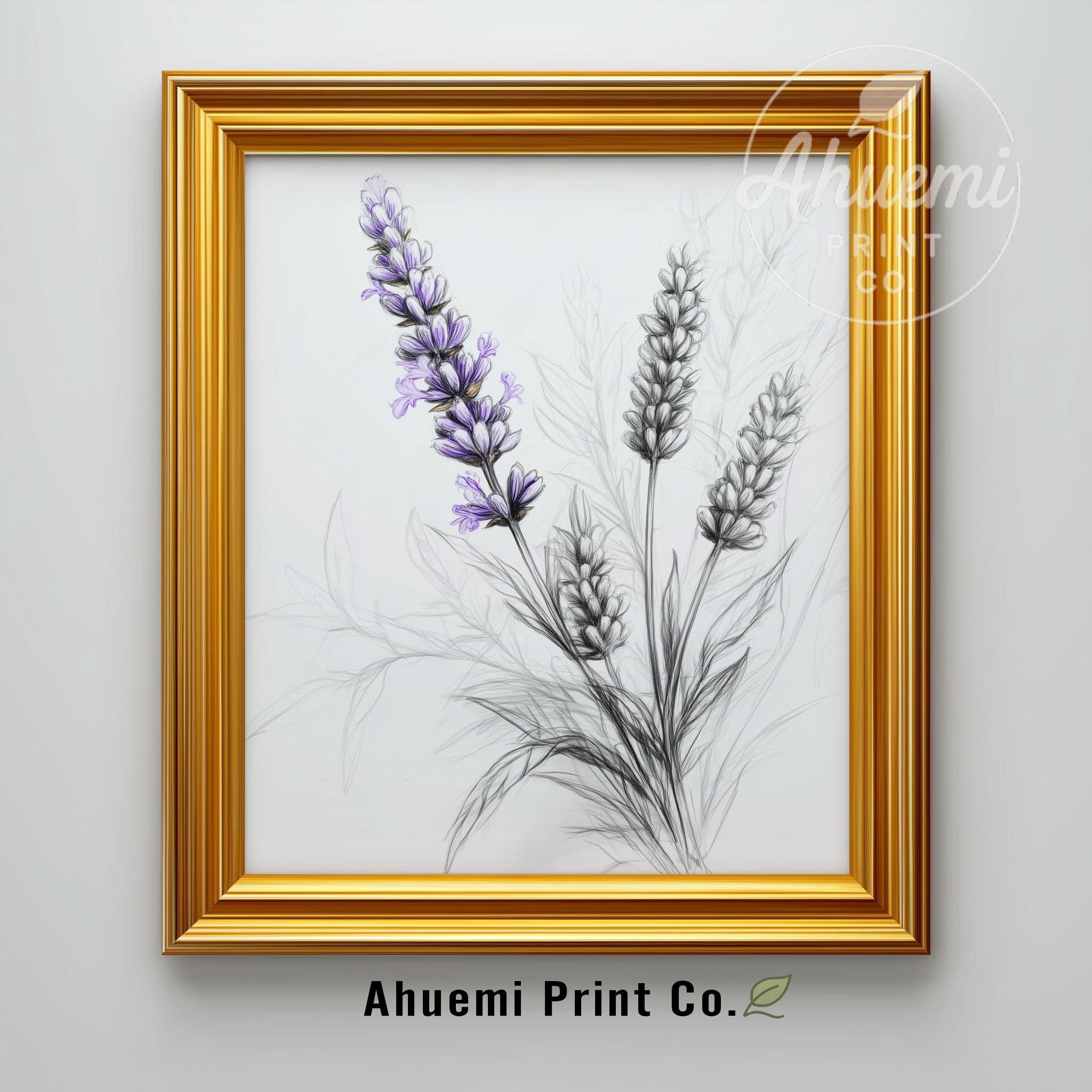 Immerse yourself in the charm of this rustic painting of a delicate lavender branch, beautifully rendered in pencil sketch. An instantly downloadable print, it's perfect for elevating your decor with budget-friendly charm. This gives you the flexibility to customize the size, frame, and material according to your personal taste and space, ensuring a perfect fit for your walls.