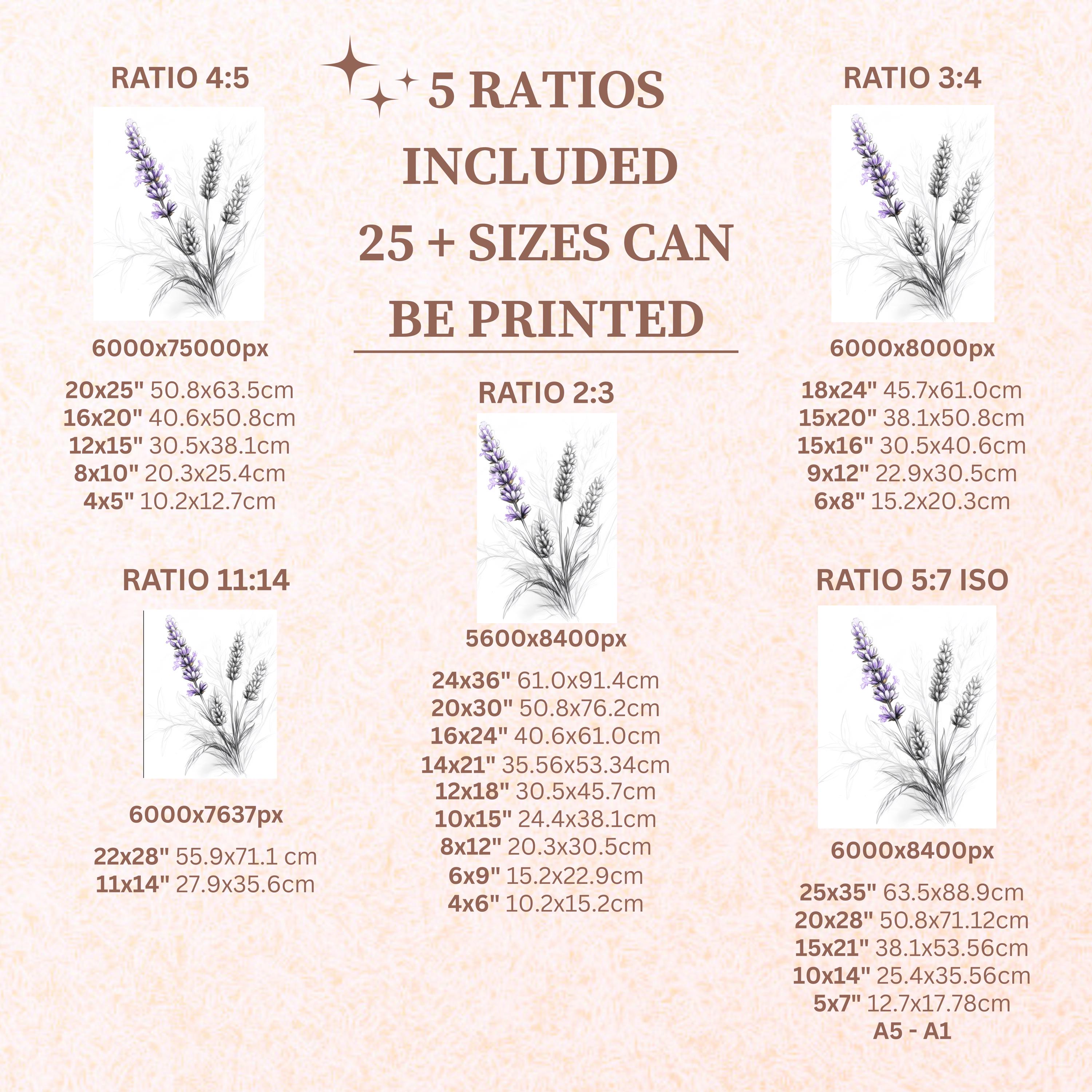Each artwork includes 5 aspect ratios with 25+ print sizes. Most standard frames are covered. One custom resize per purchase available—message before ordering.
