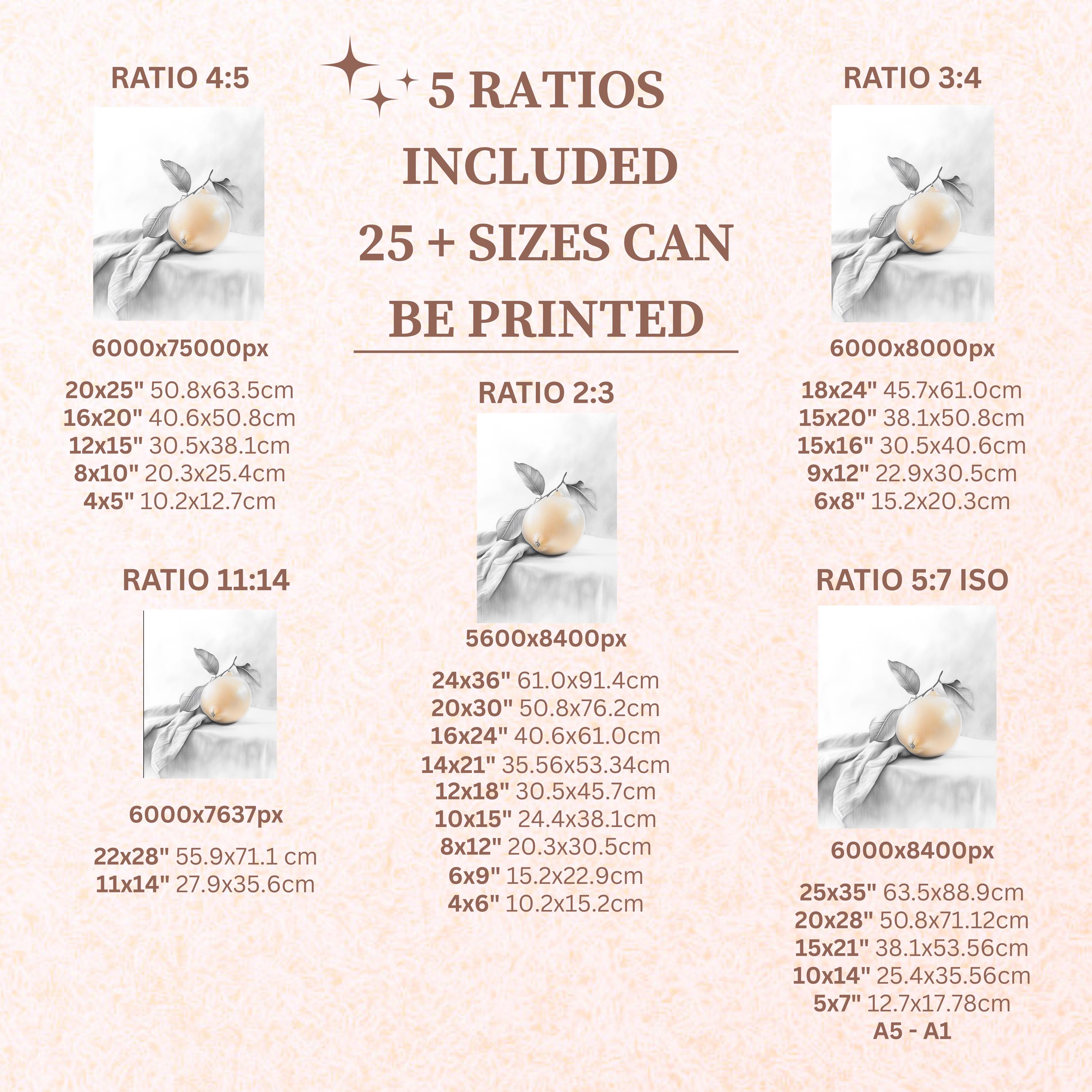 Each artwork includes 5 aspect ratios with 25+ print sizes. Most standard frames are covered. One custom resize per purchase available—message before ordering.