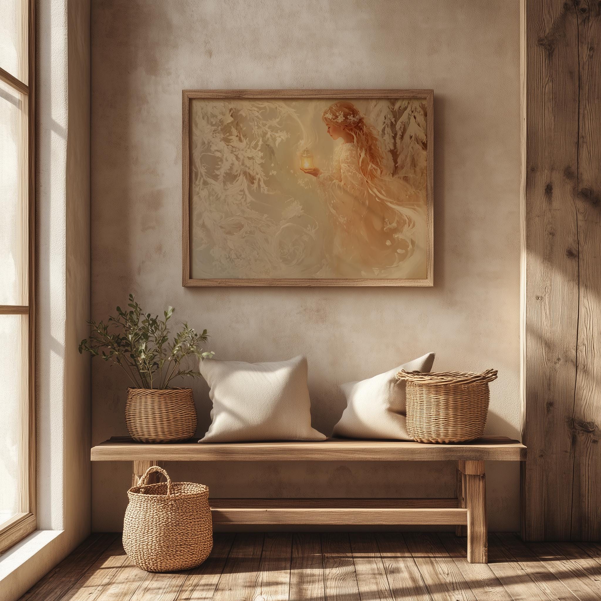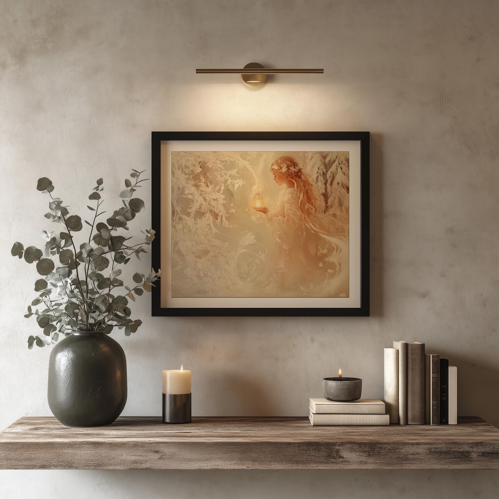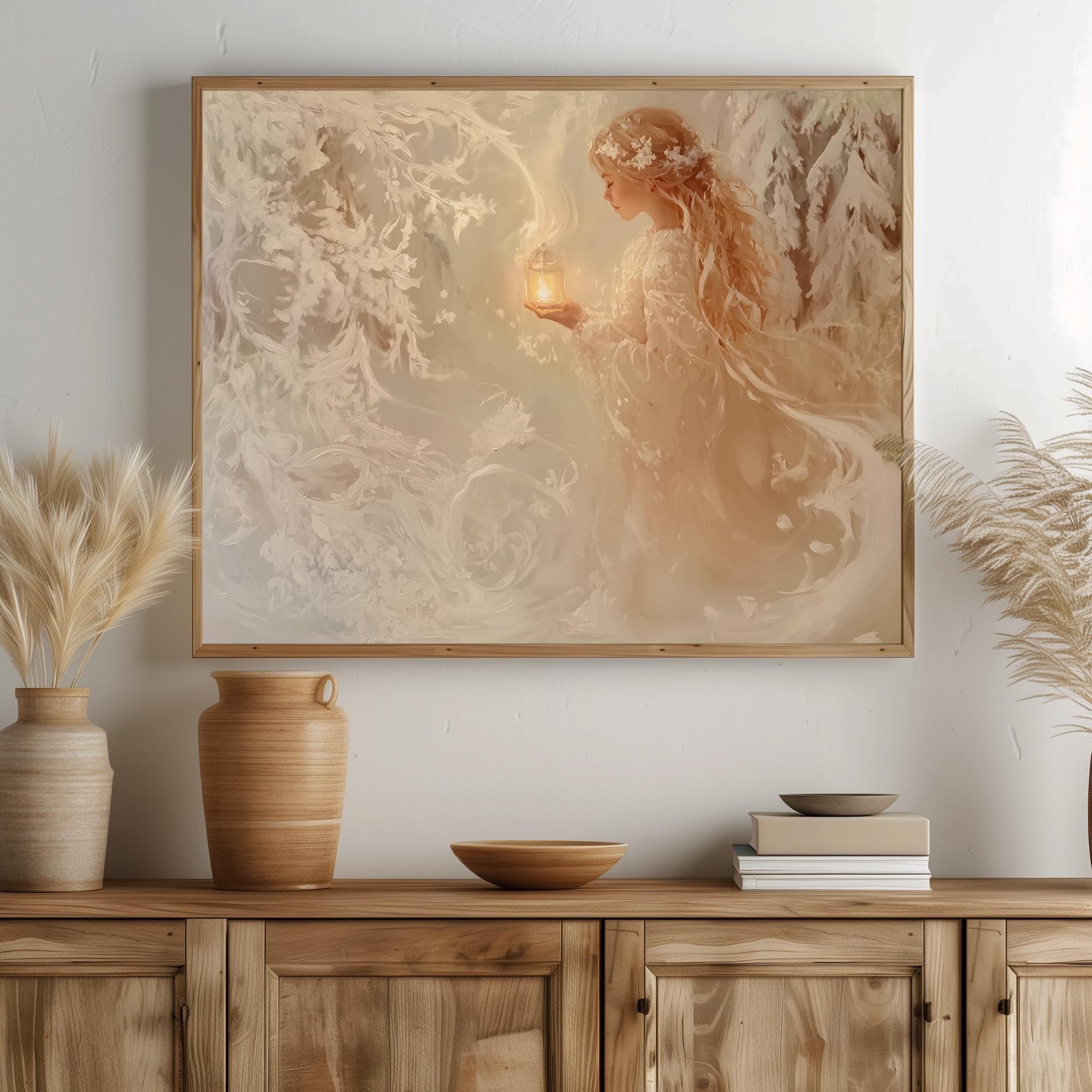 Immerse yourself in the charm with this rustic painting of a girl wandering through a serene snowy pine grove. An instantly downloadable print, it's perfect for elevating your decor with budget-friendly charm. This gives you the flexibility to customize the size, frame, and material according to your personal taste and space, ensuring a perfect fit for your walls.