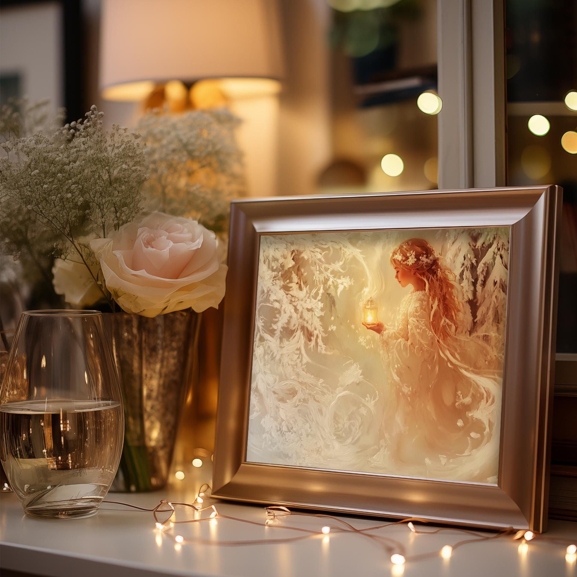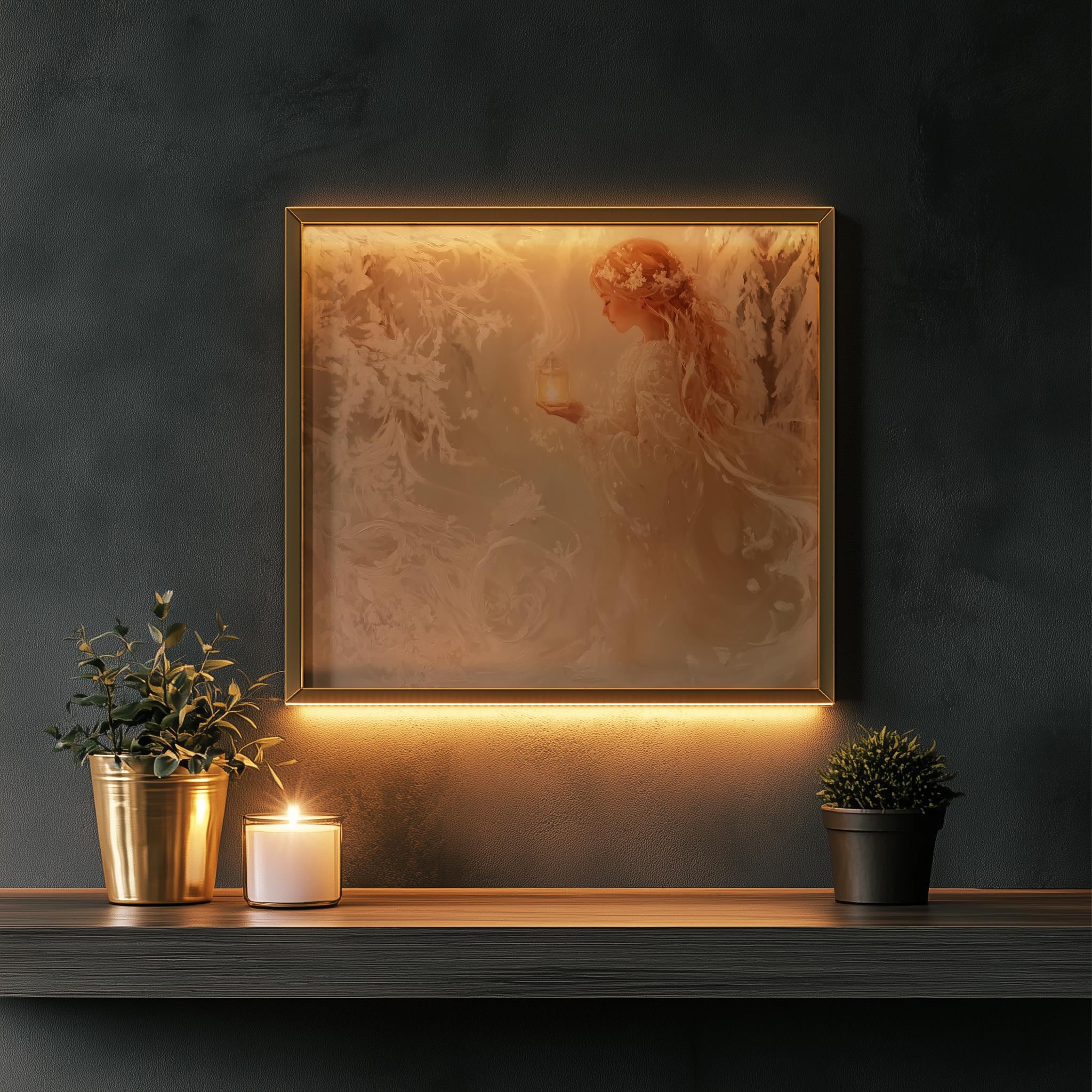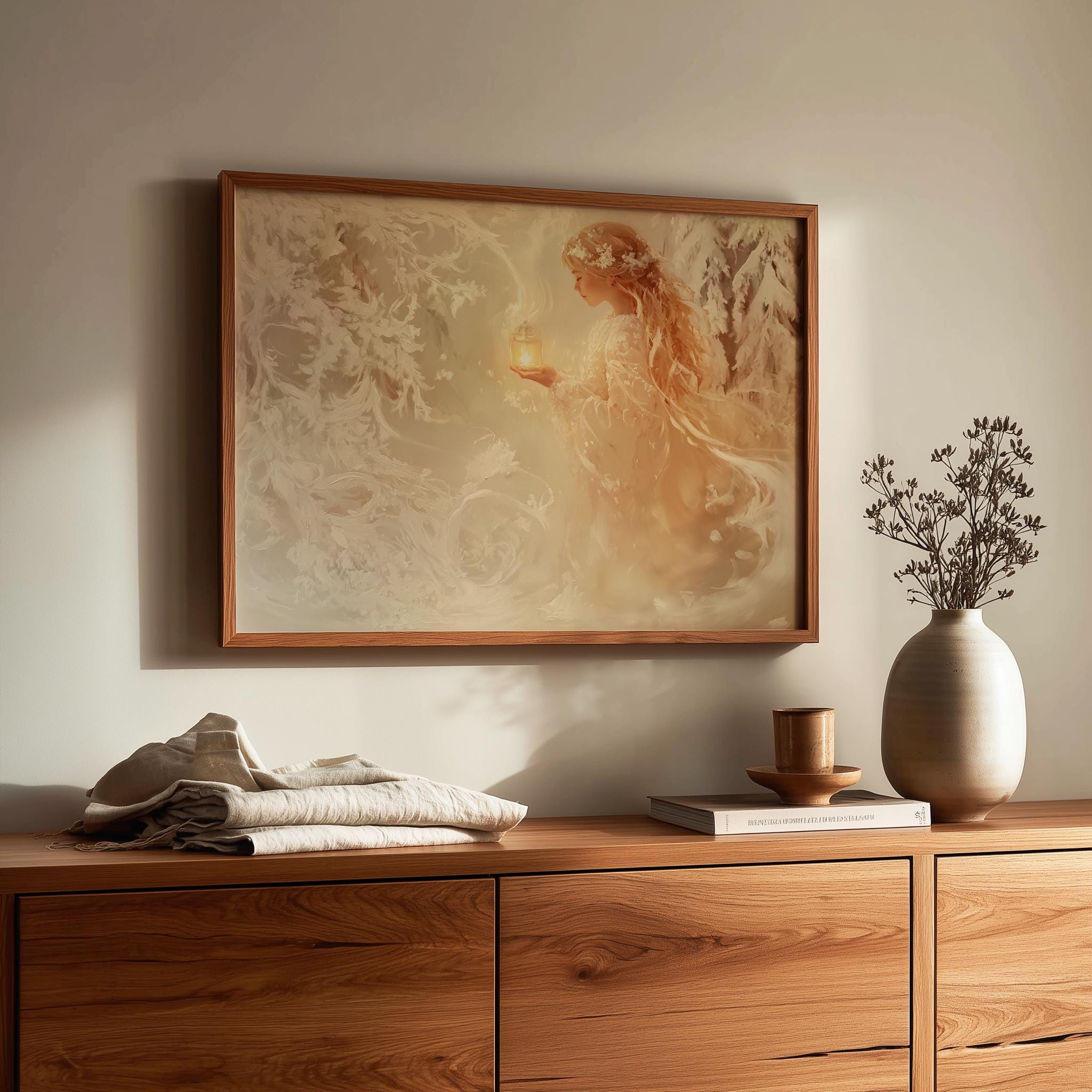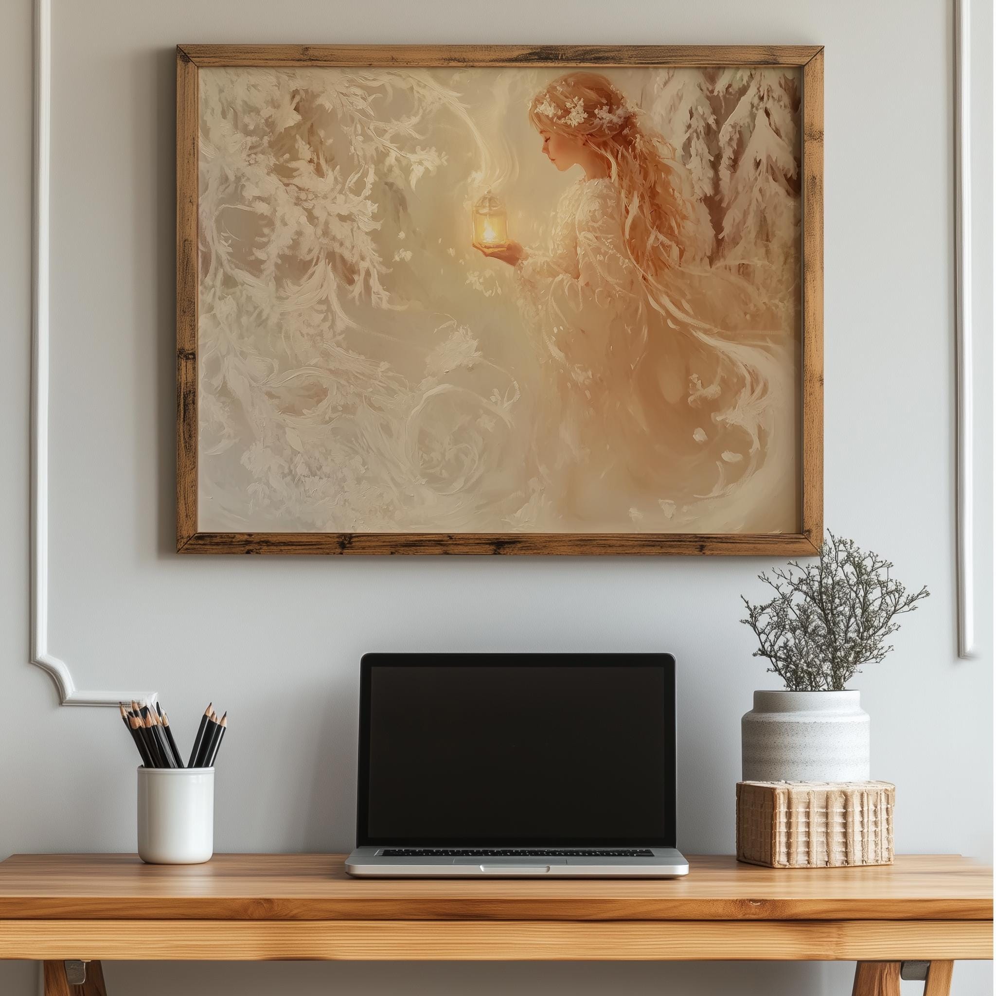 Immerse yourself in the charm with this rustic painting of a girl wandering through a serene snowy pine grove. An instantly downloadable print, it's perfect for elevating your decor with budget-friendly charm. This gives you the flexibility to customize the size, frame, and material according to your personal taste and space, ensuring a perfect fit for your walls.
