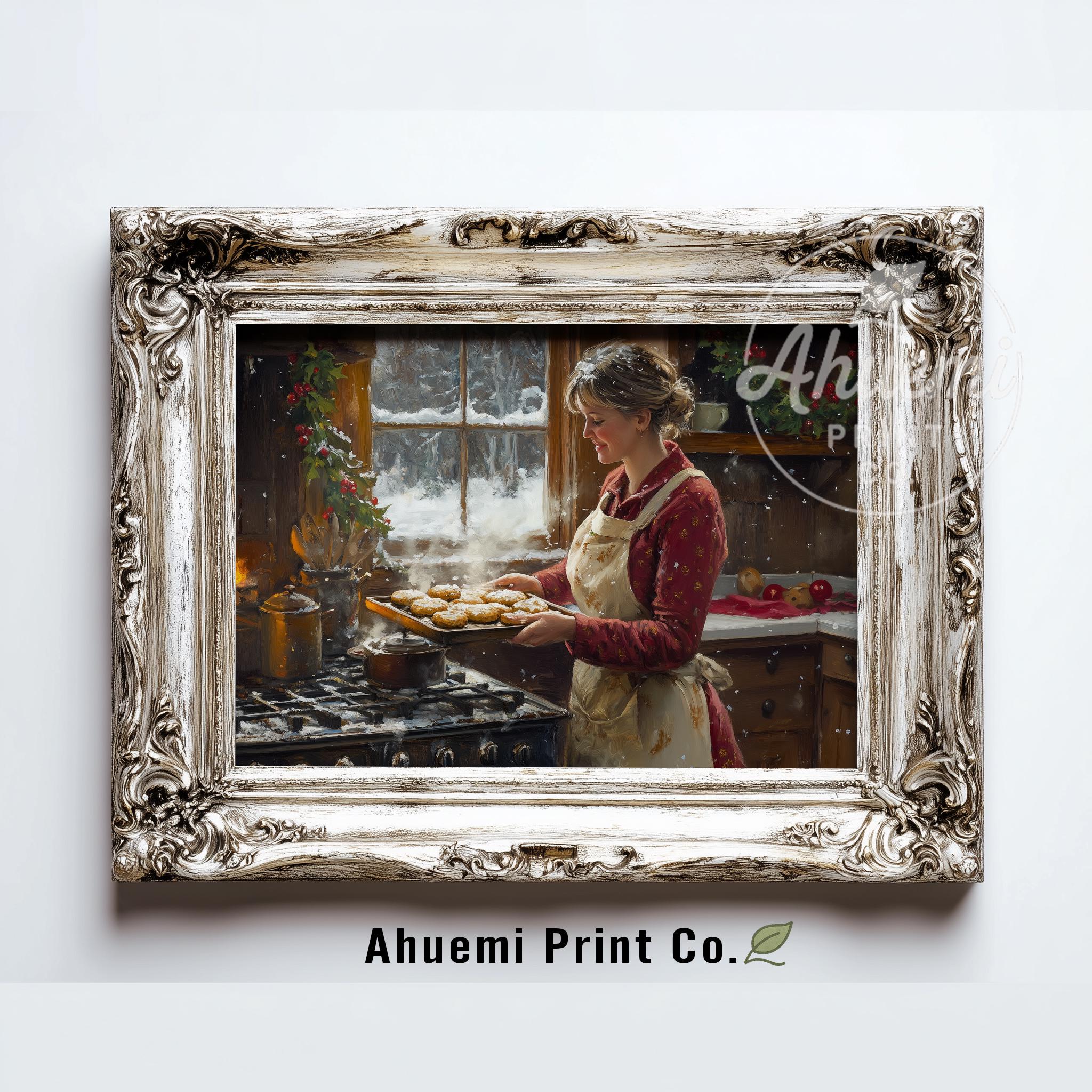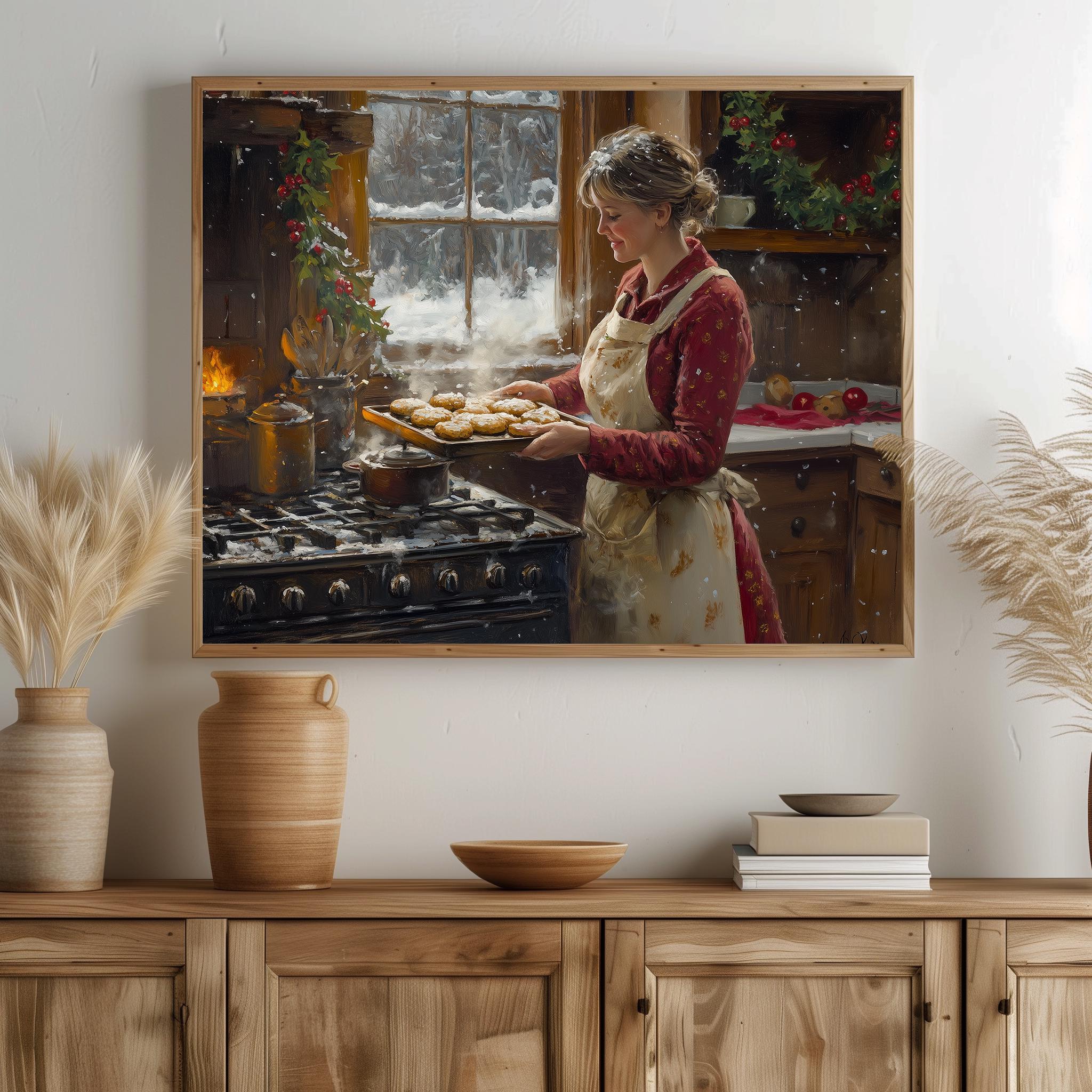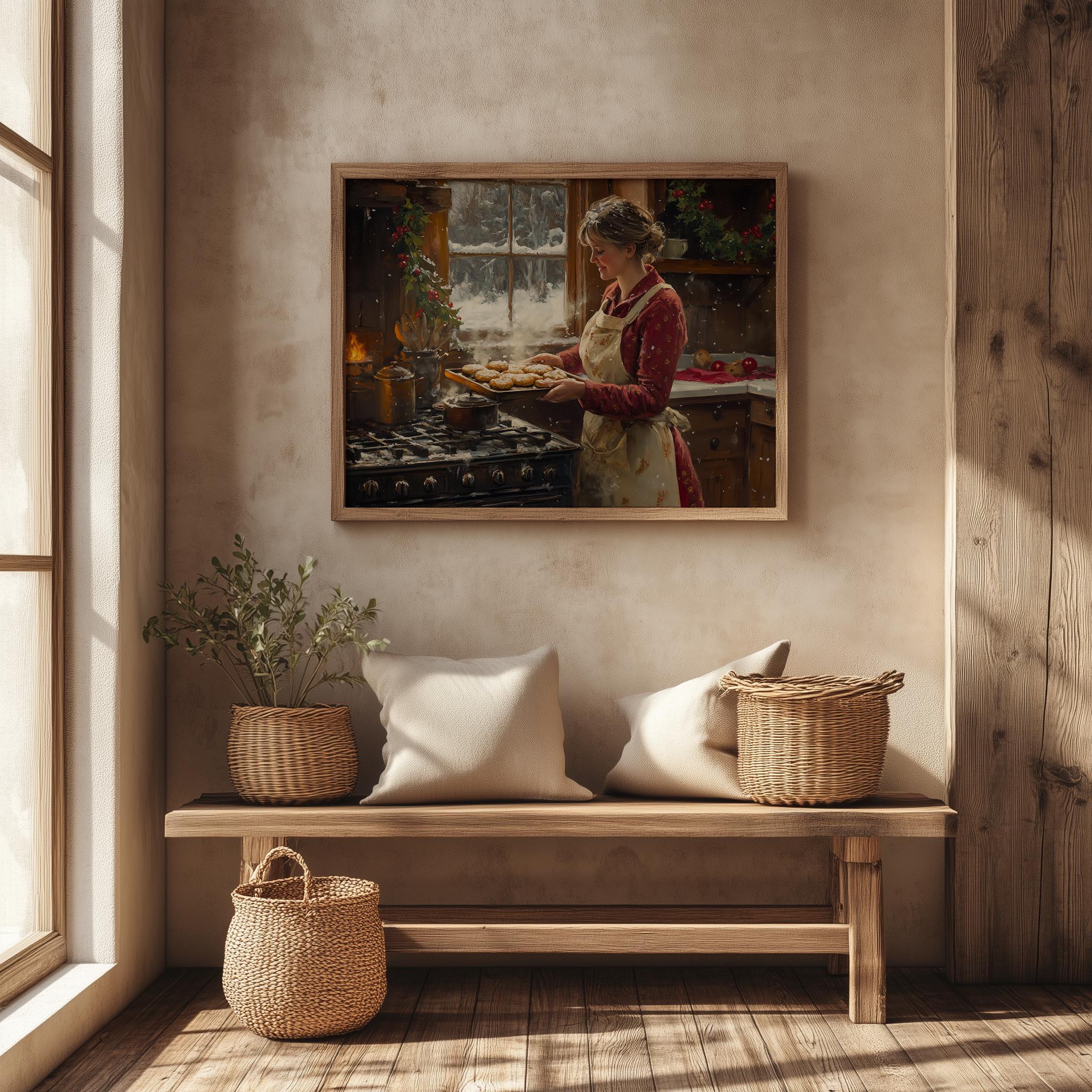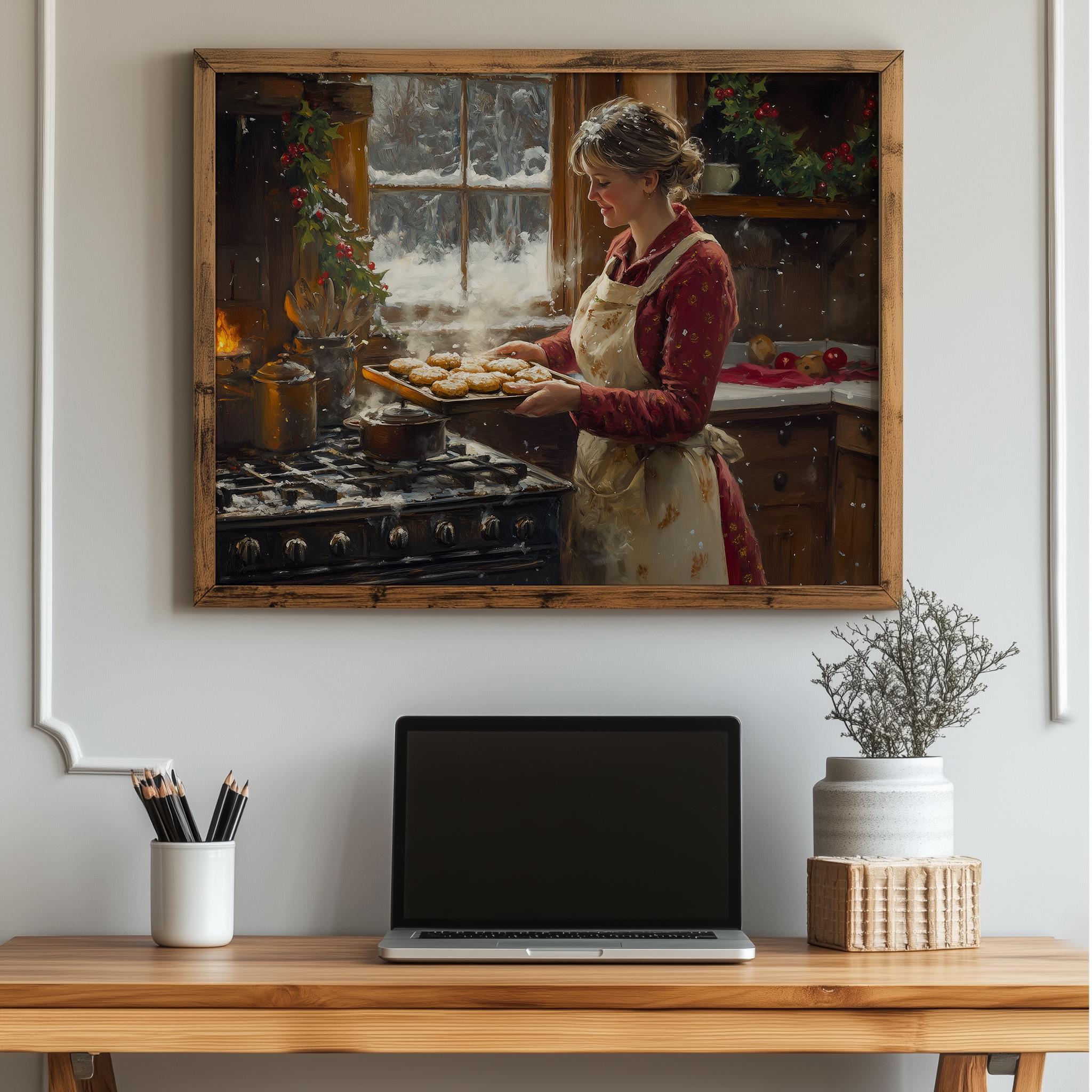 Immerse yourself in the charm with this rustic painting of a grandmother baking in a cozy Christmas kitchen. An instantly downloadable print, it's perfect for elevating your decor with budget-friendly charm. This gives you the flexibility to customize the size, frame, and material according to your personal taste and space, ensuring a perfect fit for your walls.