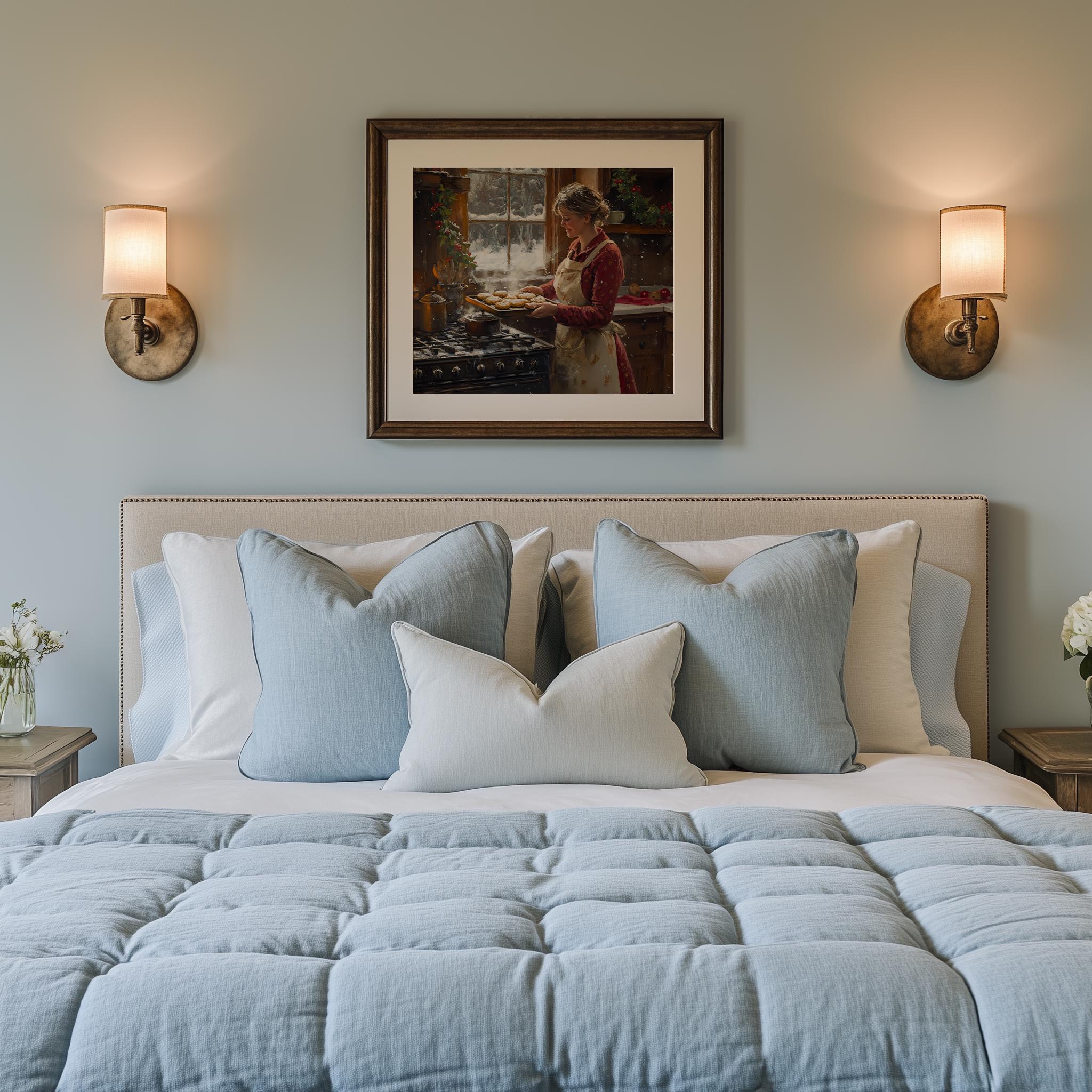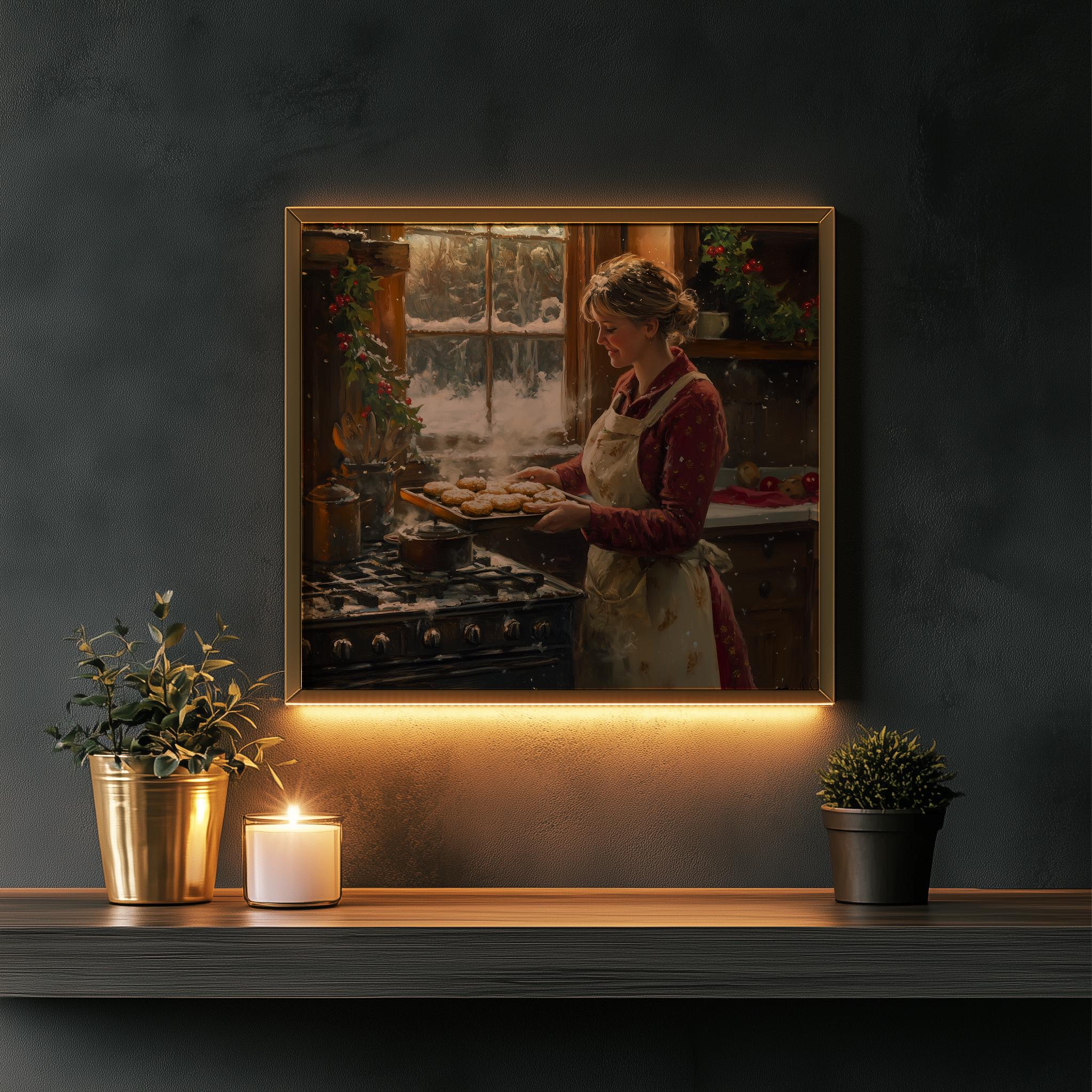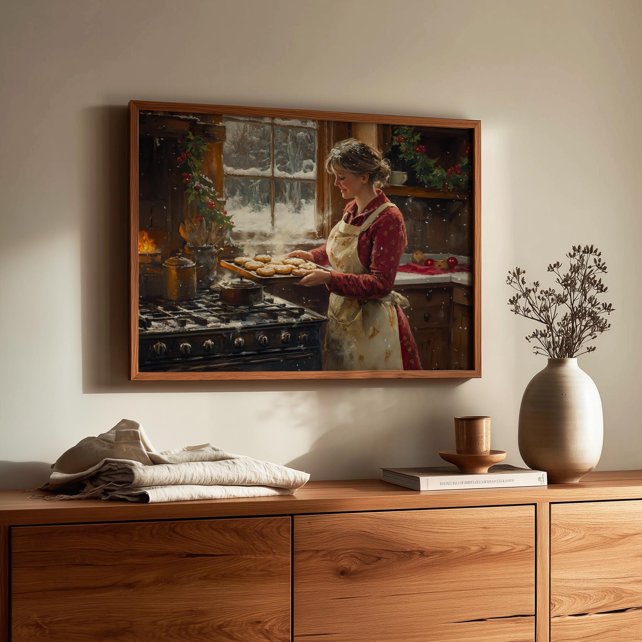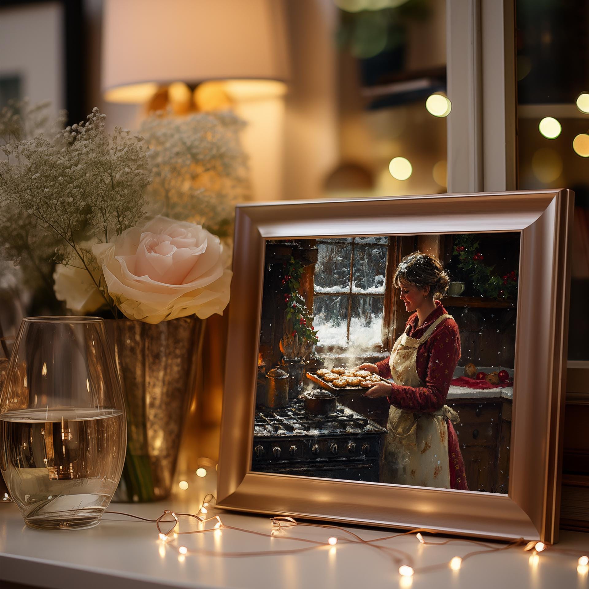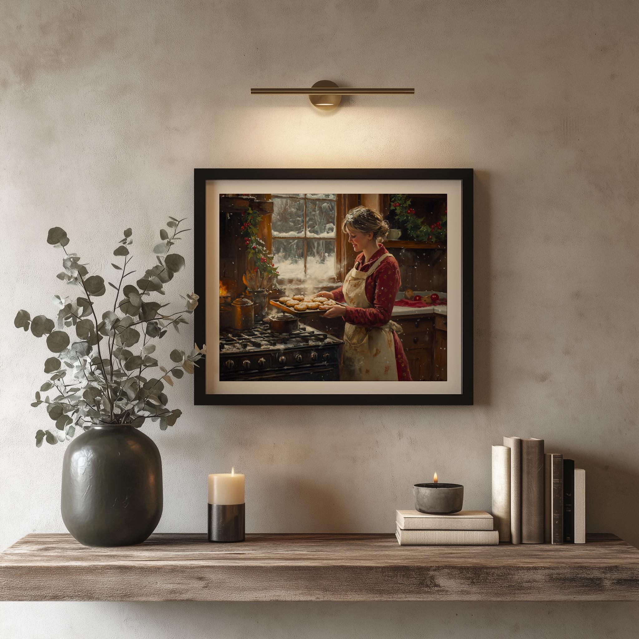 Immerse yourself in the charm with this rustic painting of a grandmother baking in a cozy Christmas kitchen. An instantly downloadable print, it's perfect for elevating your decor with budget-friendly charm. This gives you the flexibility to customize the size, frame, and material according to your personal taste and space, ensuring a perfect fit for your walls.
