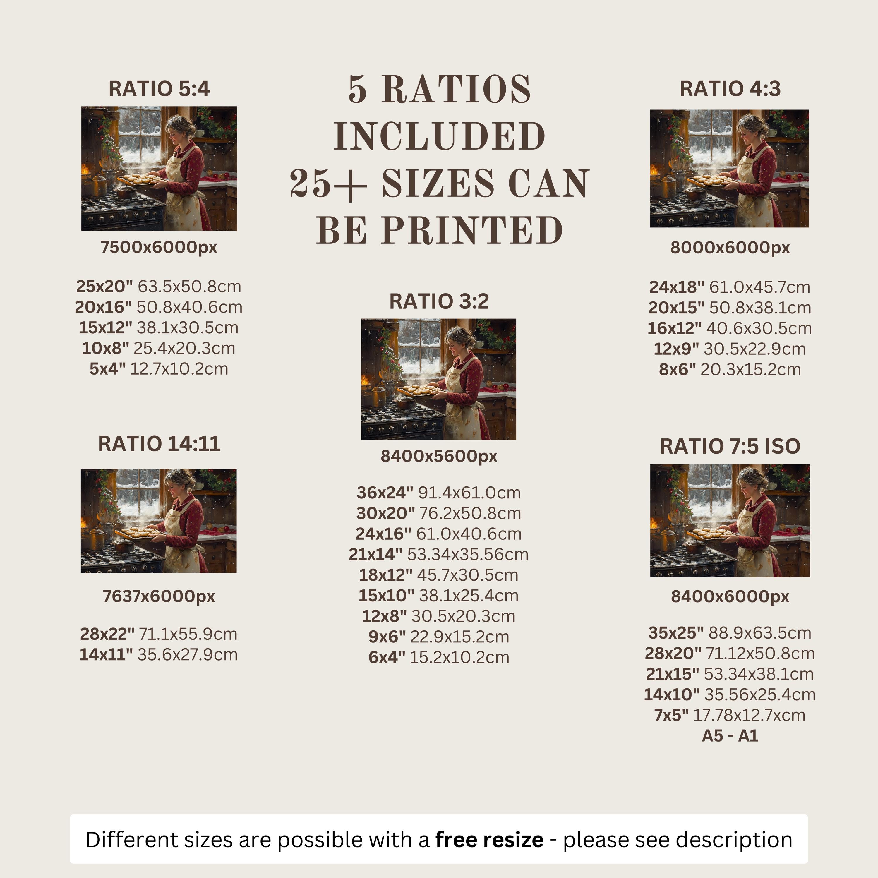 Each artwork includes 5 aspect ratios with 25+ print sizes. Most standard frames are covered. One custom resize per purchase available—message before ordering.