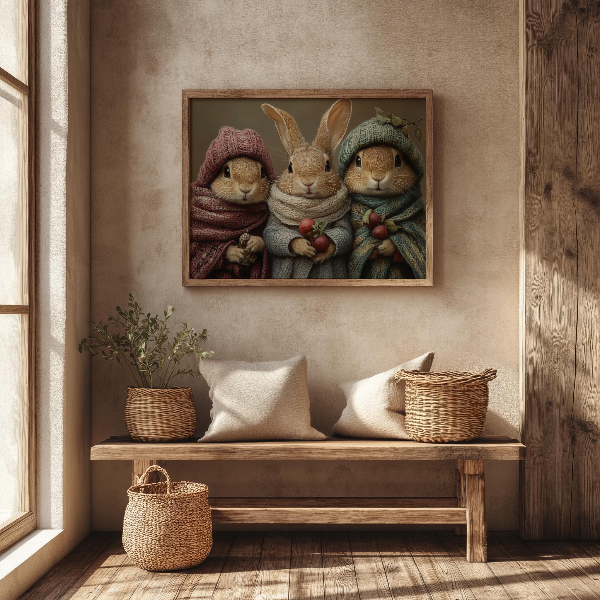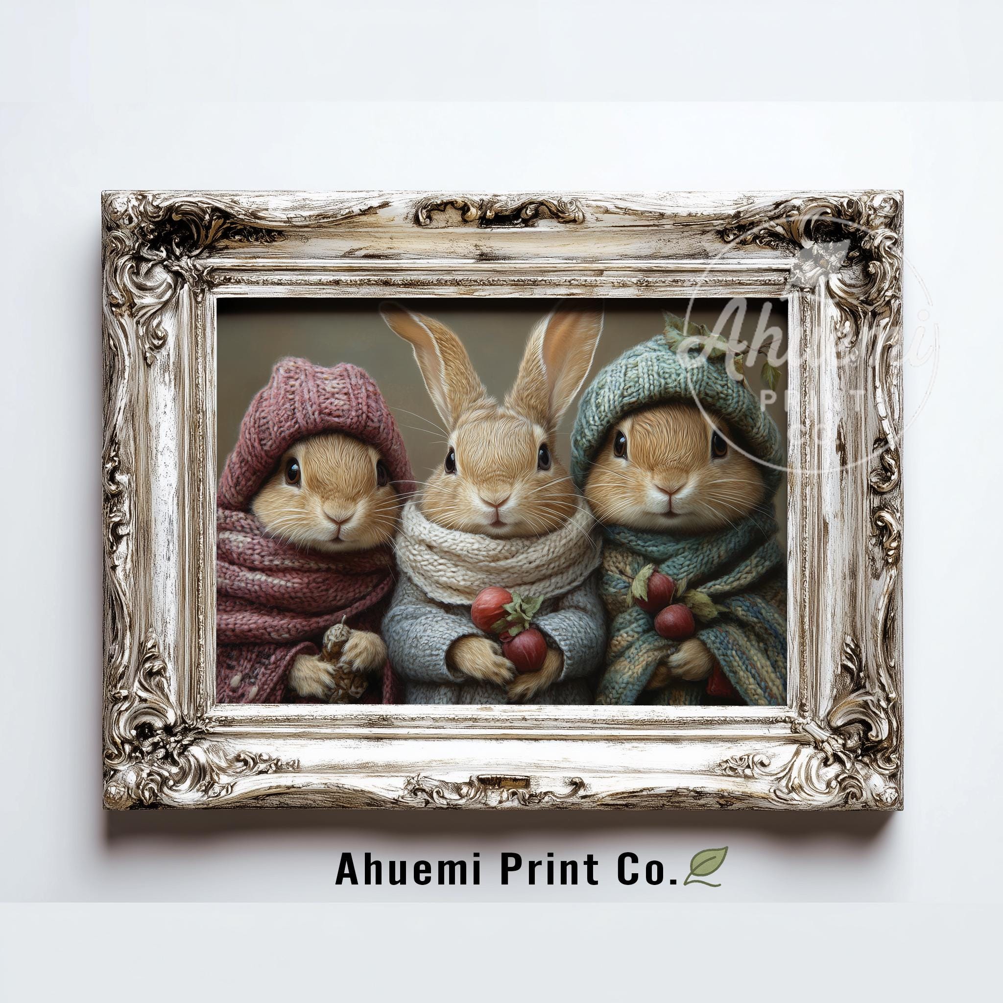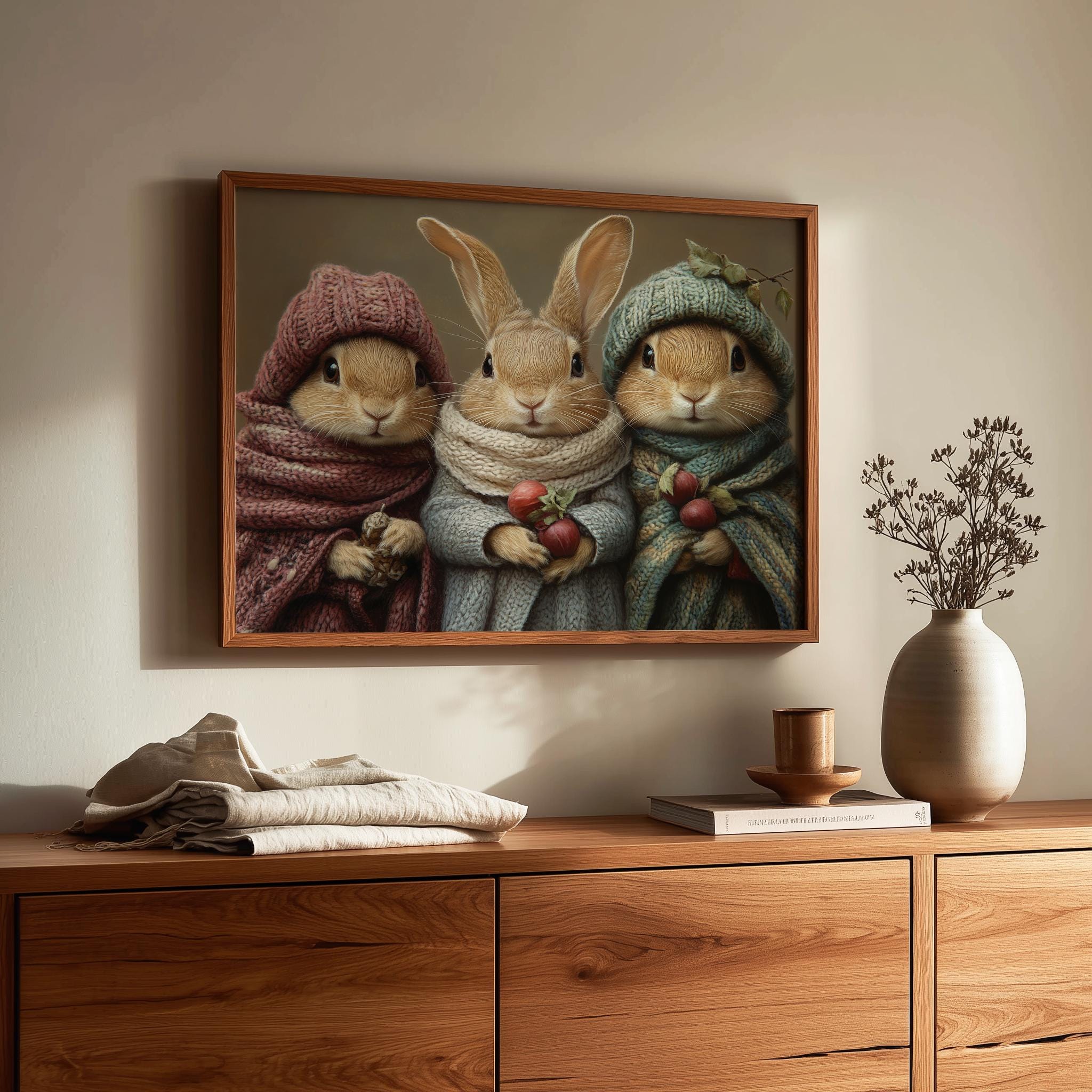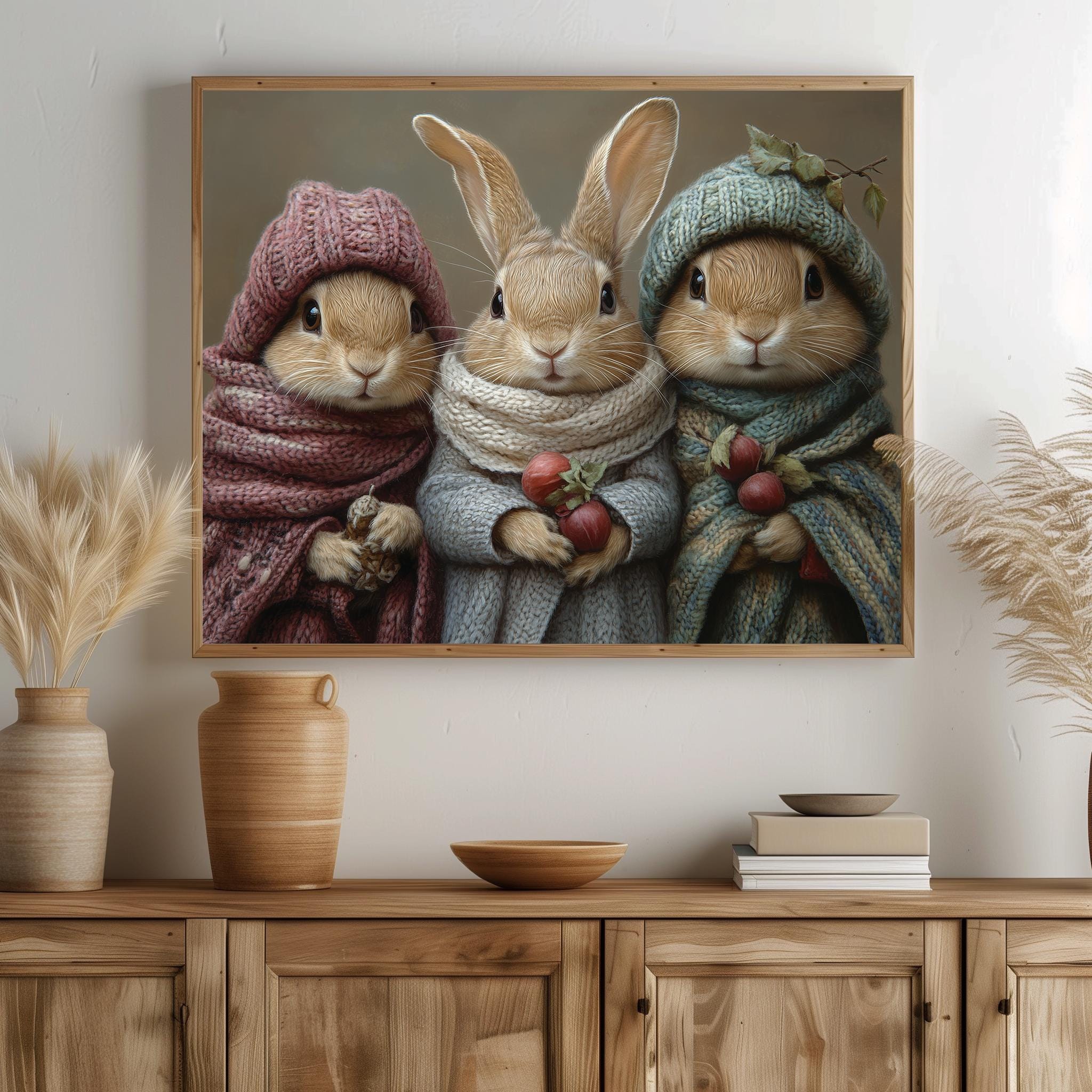 Immerse yourself in the charm with this rustic painting of a charming trio of cozy rabbits nestled among vibrant berries. An instantly downloadable print, it's perfect for elevating your decor with budget-friendly charm. This gives you the flexibility to customize the size, frame, and material according to your personal taste and space, ensuring a perfect fit for your walls.