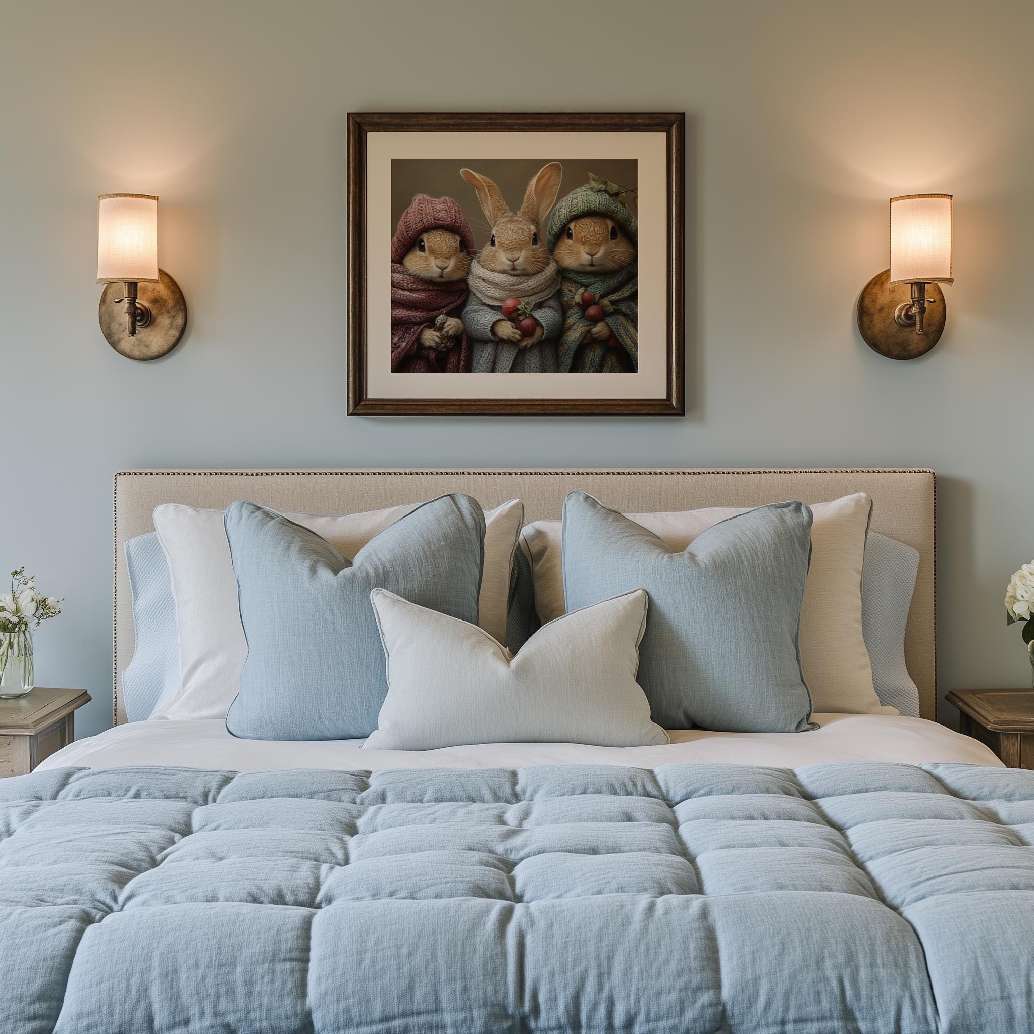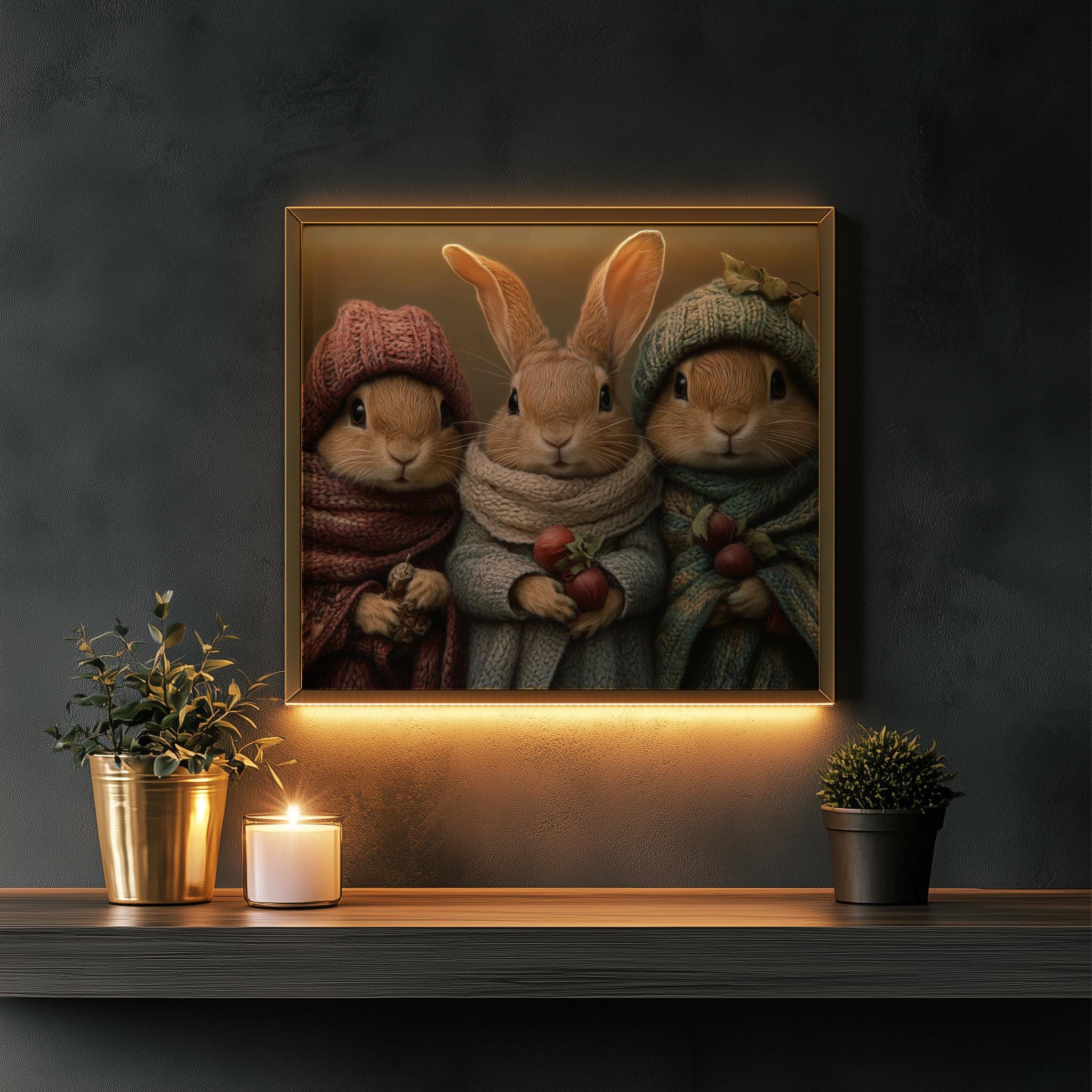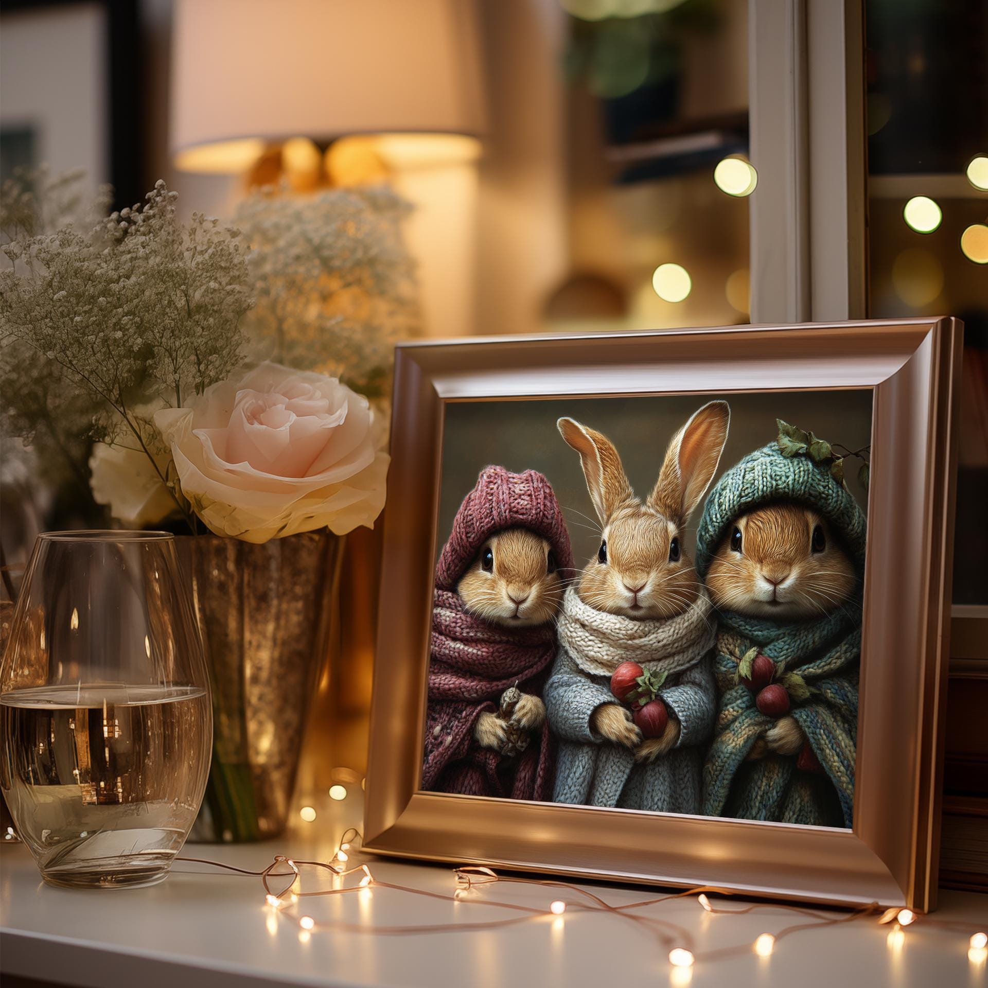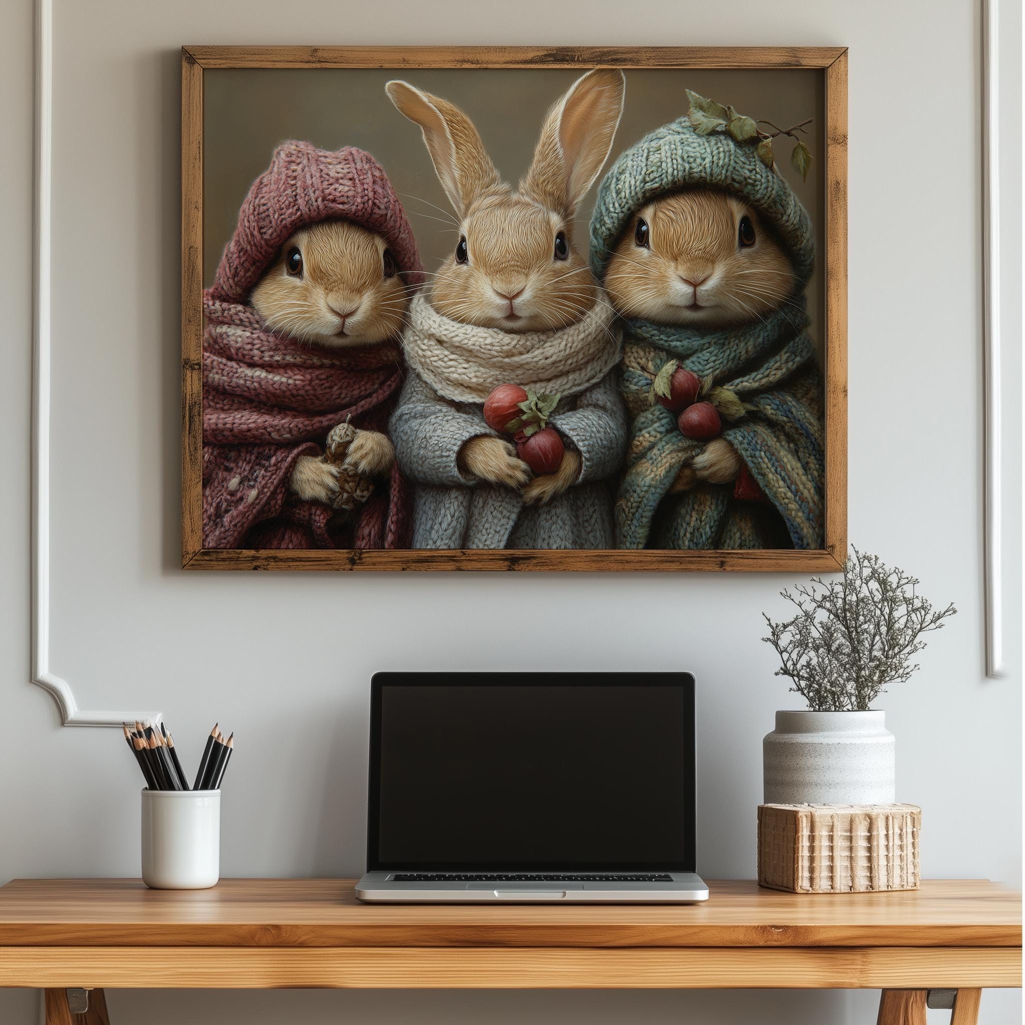 Immerse yourself in the charm with this rustic painting of a charming trio of cozy rabbits nestled among vibrant berries. An instantly downloadable print, it's perfect for elevating your decor with budget-friendly charm. This gives you the flexibility to customize the size, frame, and material according to your personal taste and space, ensuring a perfect fit for your walls.