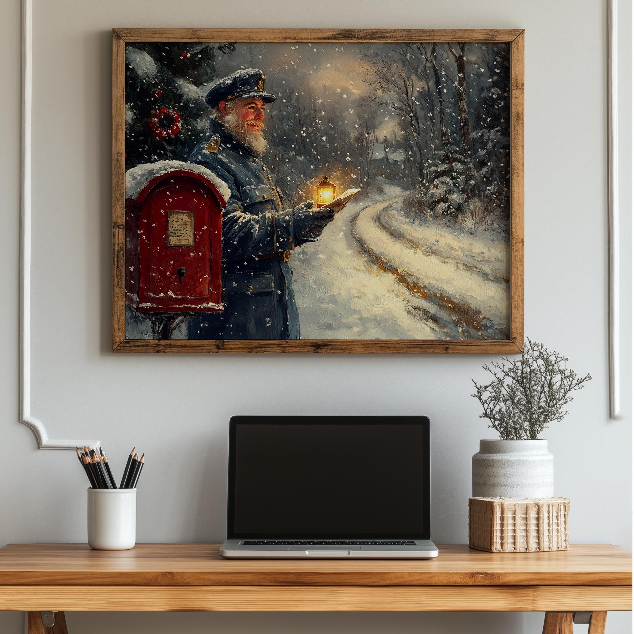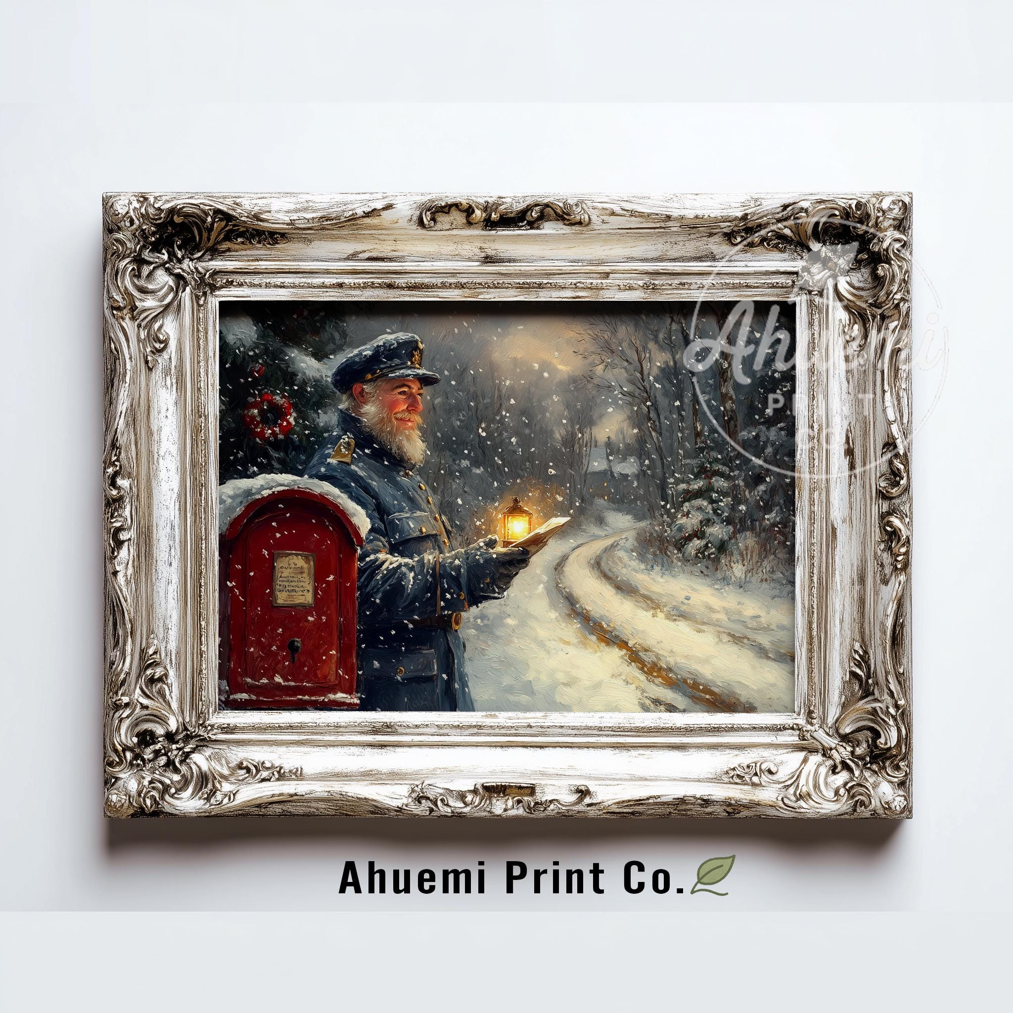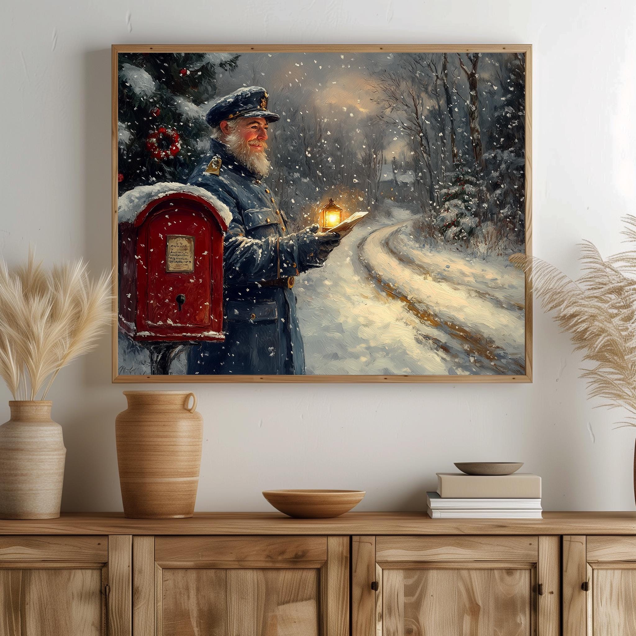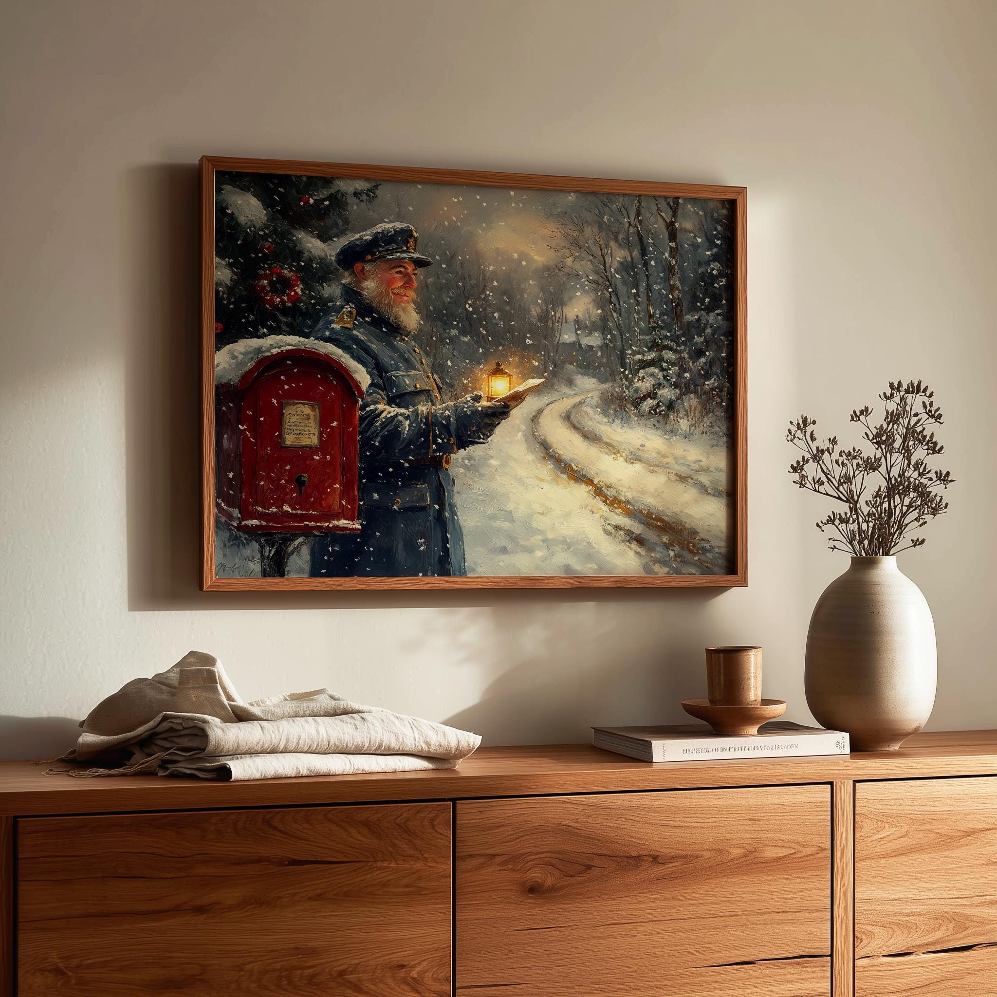 Immerse yourself in the charm with this rustic painting of a mail carrier braving the snowy landscape. An instantly downloadable print, it's perfect for elevating your decor with budget-friendly charm. This gives you the flexibility to customize the size, frame, and material according to your personal taste and space, ensuring a perfect fit for your walls.