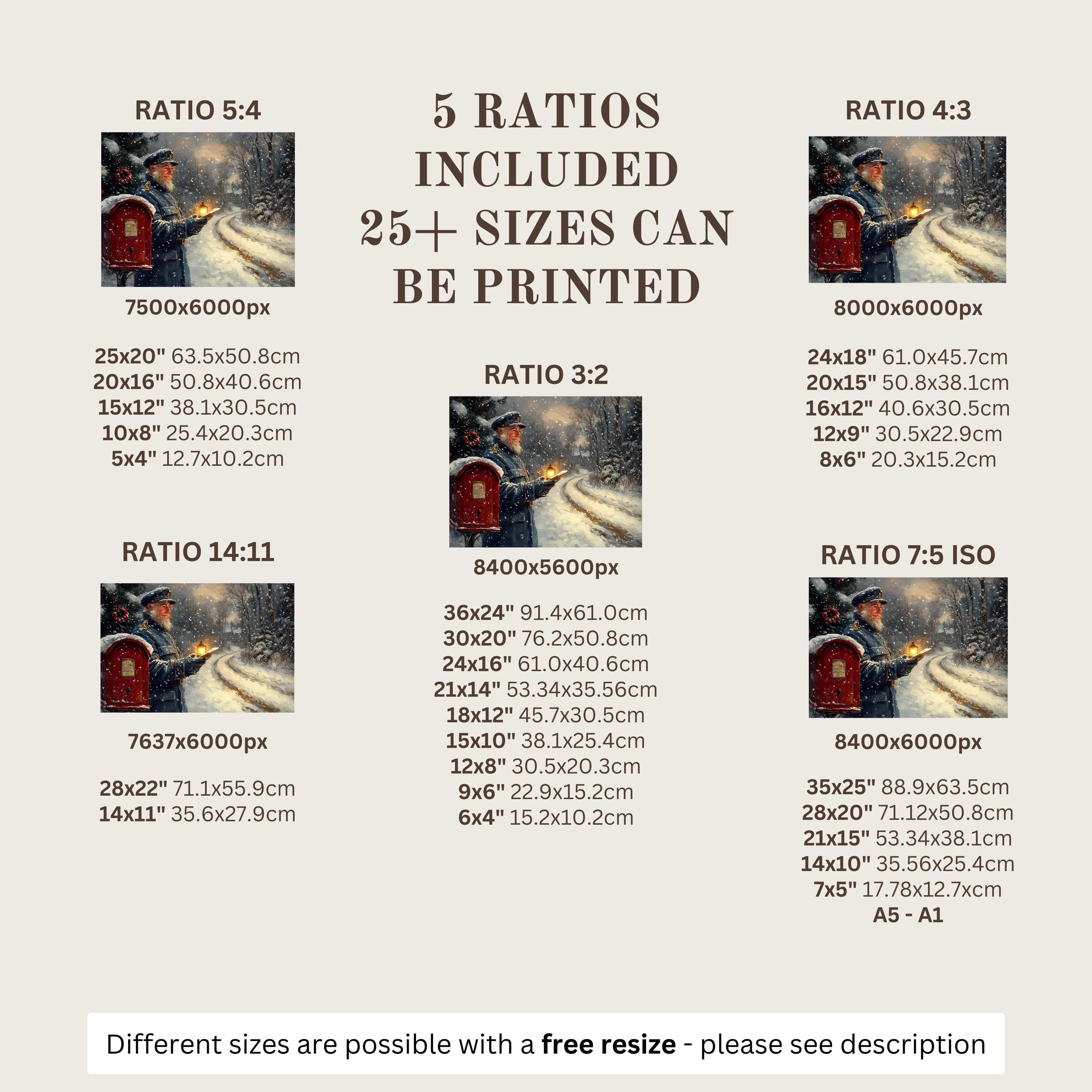 Each artwork includes 5 aspect ratios with 25+ print sizes. Most standard frames are covered. One custom resize per purchase available—message before ordering.