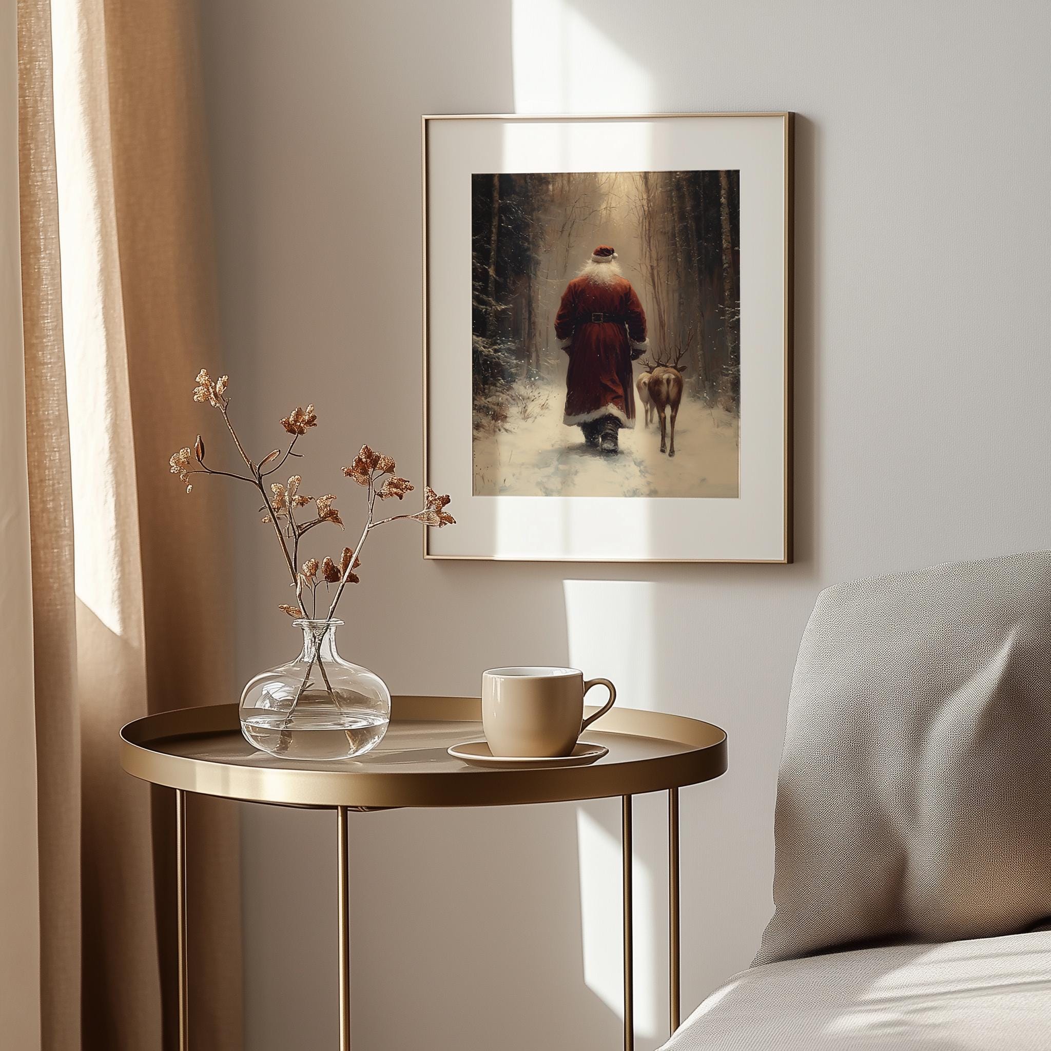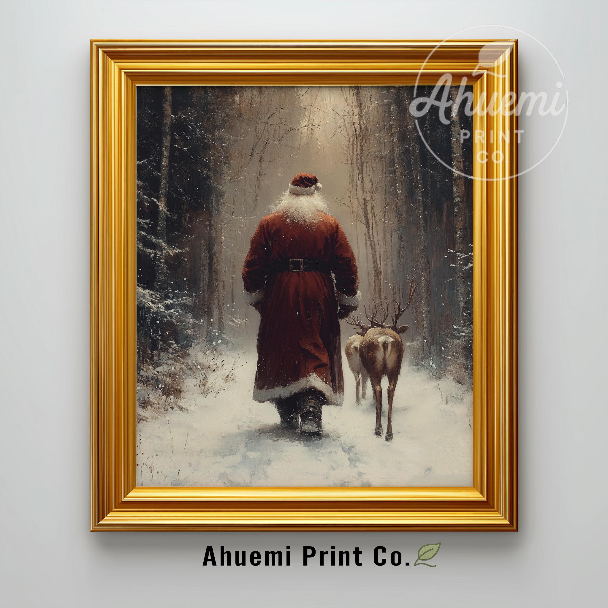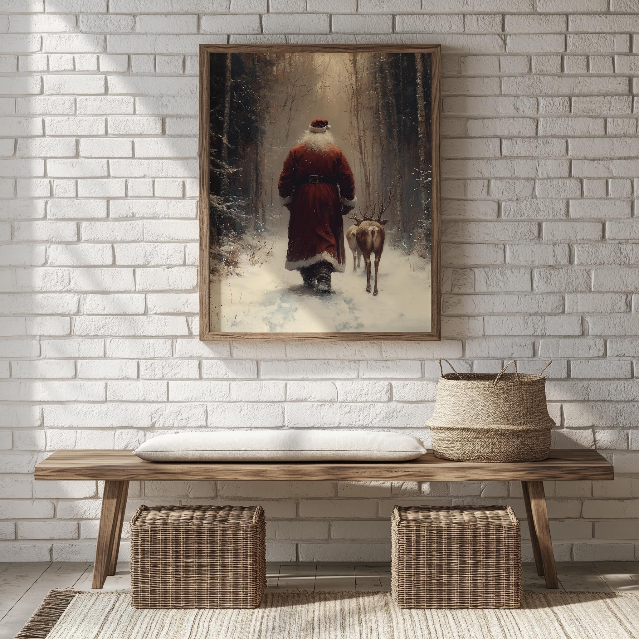 Immerse yourself in the charm of this rustic painting of a vintage Santa Claus journeying with reindeer through a serene, snowy forest. An instantly downloadable print, it's perfect for elevating your decor with budget-friendly charm. This gives you the flexibility to customize the size, frame, and material according to your personal taste and space, ensuring a perfect fit for your walls.